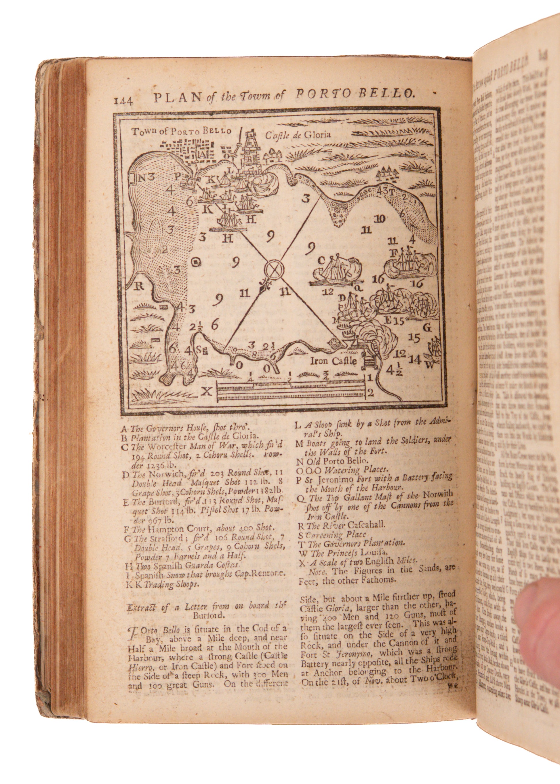 Song [with music] A Dialogue between Death and a Dying Person, by Mr. Parrat [p.88]; Plan for the Town of Porto Bello [Panama, p.144]; A Plan for the City of Havanah [Havana, Cuba, p.149]; English Success in America; A Plan of Cartagena on the Island of Varu [p.201]; A Song Set to Music by Simon Stubley [p.252]; Solo for the Flute [p.409]; Folding Plate of the Town and Castle of St Augustine by Thomas Silver, Extremely Early Map of Florida during the War of Jenkins' Ear [pp. p.577]; etc.