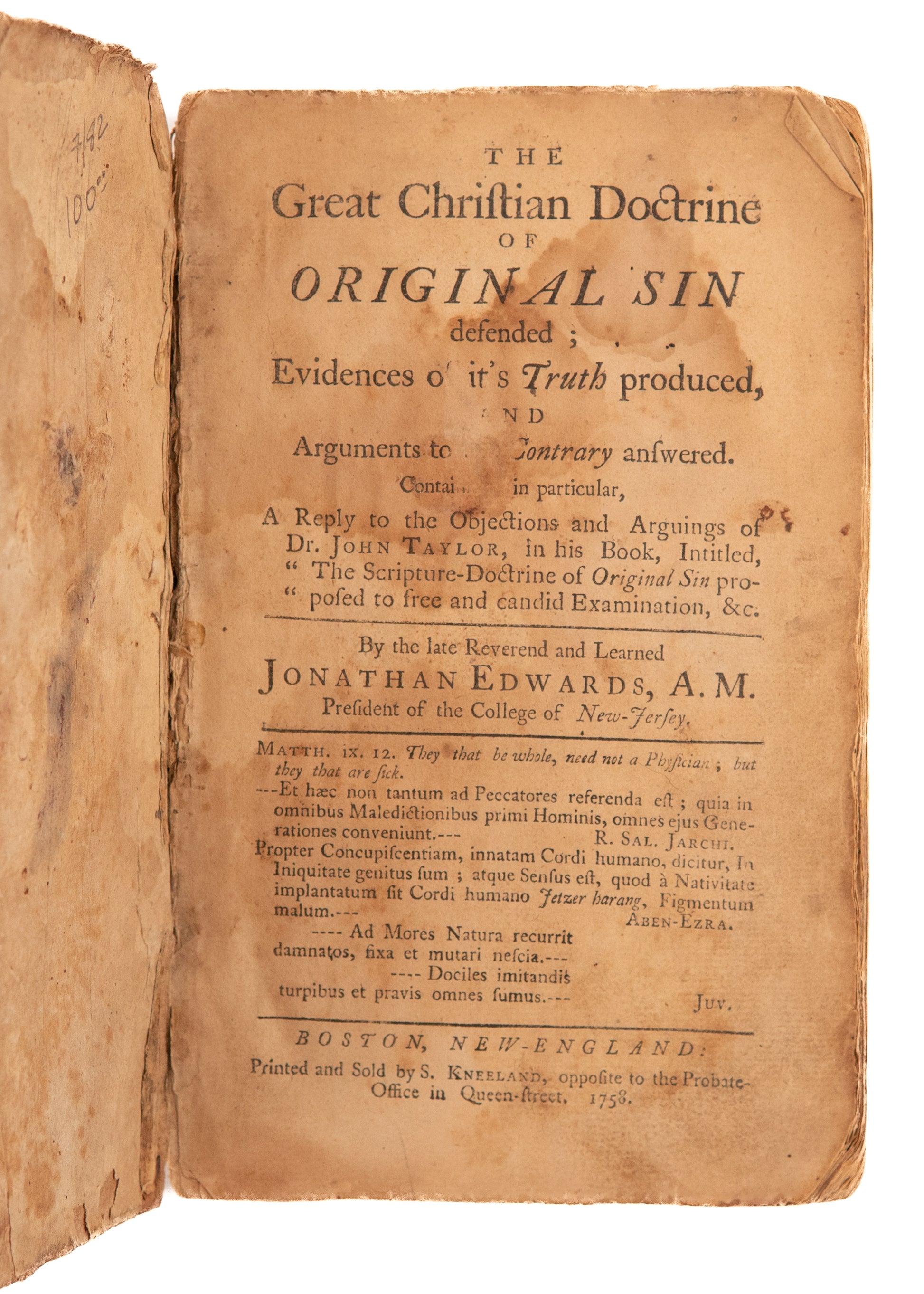 Edwards, Jonathan. The Great Doctrine of Original Sin Defended; Evidences o' it's Truth Produced, and Arguments to the Contrary Answered/ Containing in Particular, a Reply to the Objections and Arguings of Dr. John Taylor, in His Book, Intitled, "The Scripture-Doctrine of Original Sin Pro" posed to Free and Candid Examination, &c. By the Late Reverend and Learned Jonathan Edwards, A. M. President of the College of New-Jersey. Boston, New England. Printed and Sold by S. Kneeland. 1758. 386pp.