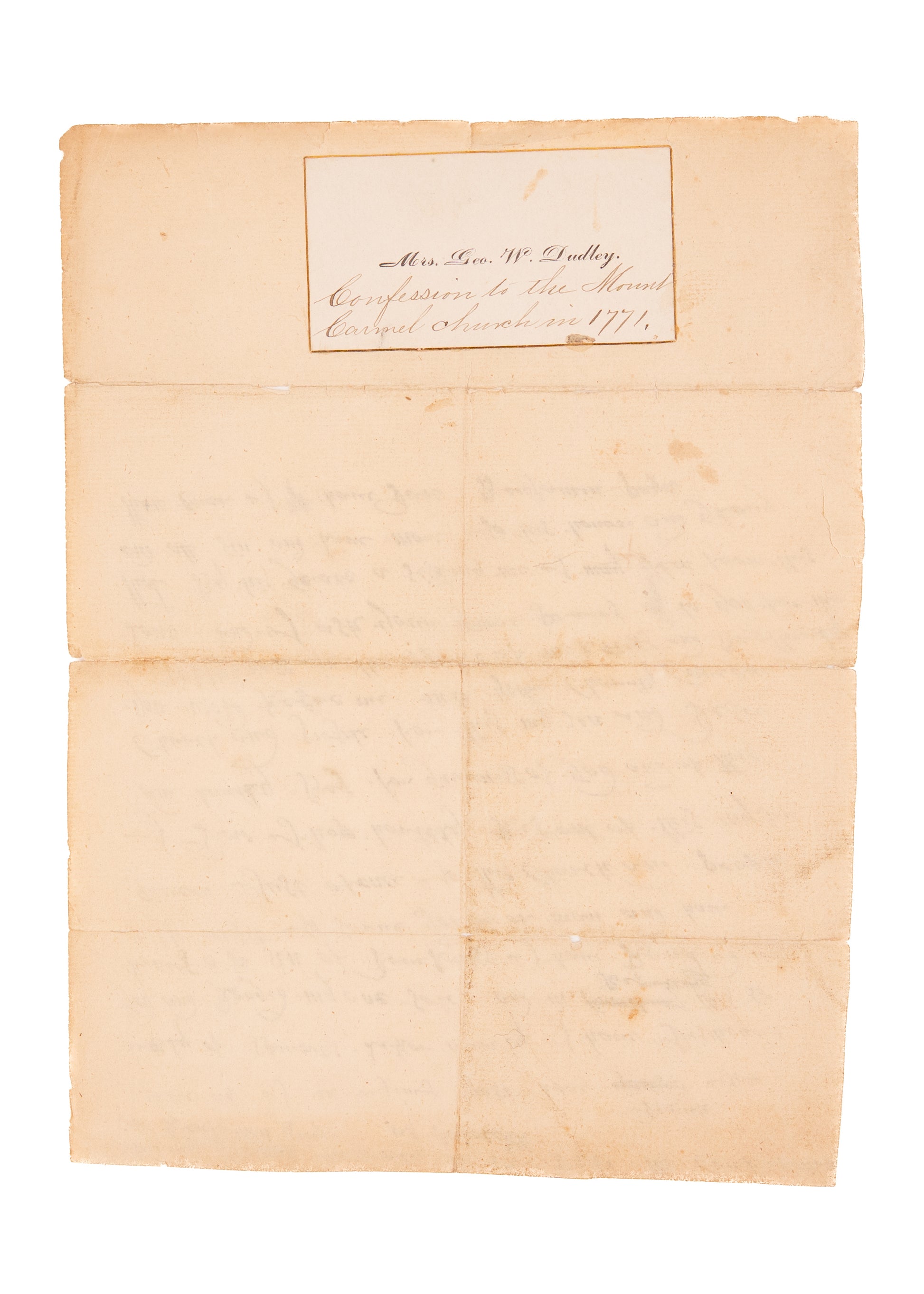 A note to the rear indicates the location as Mount Carmel, likely Mount Carmel, South Carolina in McCormick County, right near the Georgia Border. Mount Carmel was settled by Scotch-Irish immigrants in the 1750's. The Confession would likely have been addressed to an informal gathering of Scotch-Irish [Presbyterian] Christians meeting without the benefit of a minister. There was no formal church at Mount Carmel until the mid-1770's, when a church for the Scotch-Irish [even available in Gaelic] was founded by Rev. John Bethune.