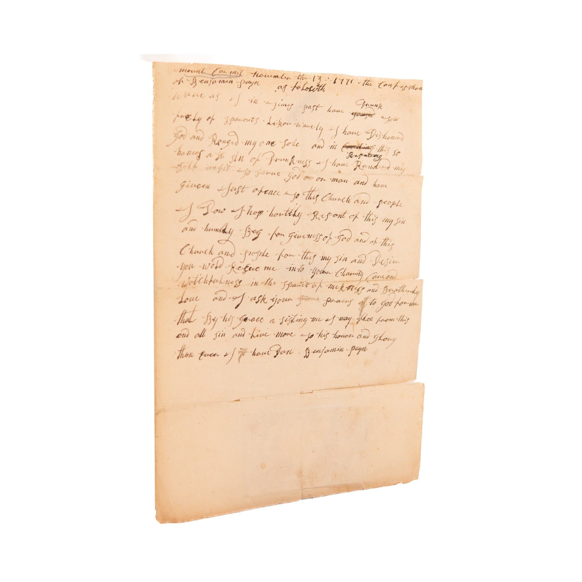 Where as I in lying feast have Drunk sow freely of sparouts likor namely I have Dishonord God and Ronged my one sole and in Repating this so haneos a sin of Drunkness I have Randerd my self unfit **** God on man and have giveeen just ofence to this Church and people & down I hop heartily repent of this my sin and humbly beg for giveness of God and of this Church and people for this my sin and desire you would receve me into your Charity Care and watchfulness in the sparit of mekness and Brotherly Love and I ask your praing to God for me that By his grace a sisting me I may flee from this and all sin and live more to his honor and glory than ever I have done. Benjamin Payn.