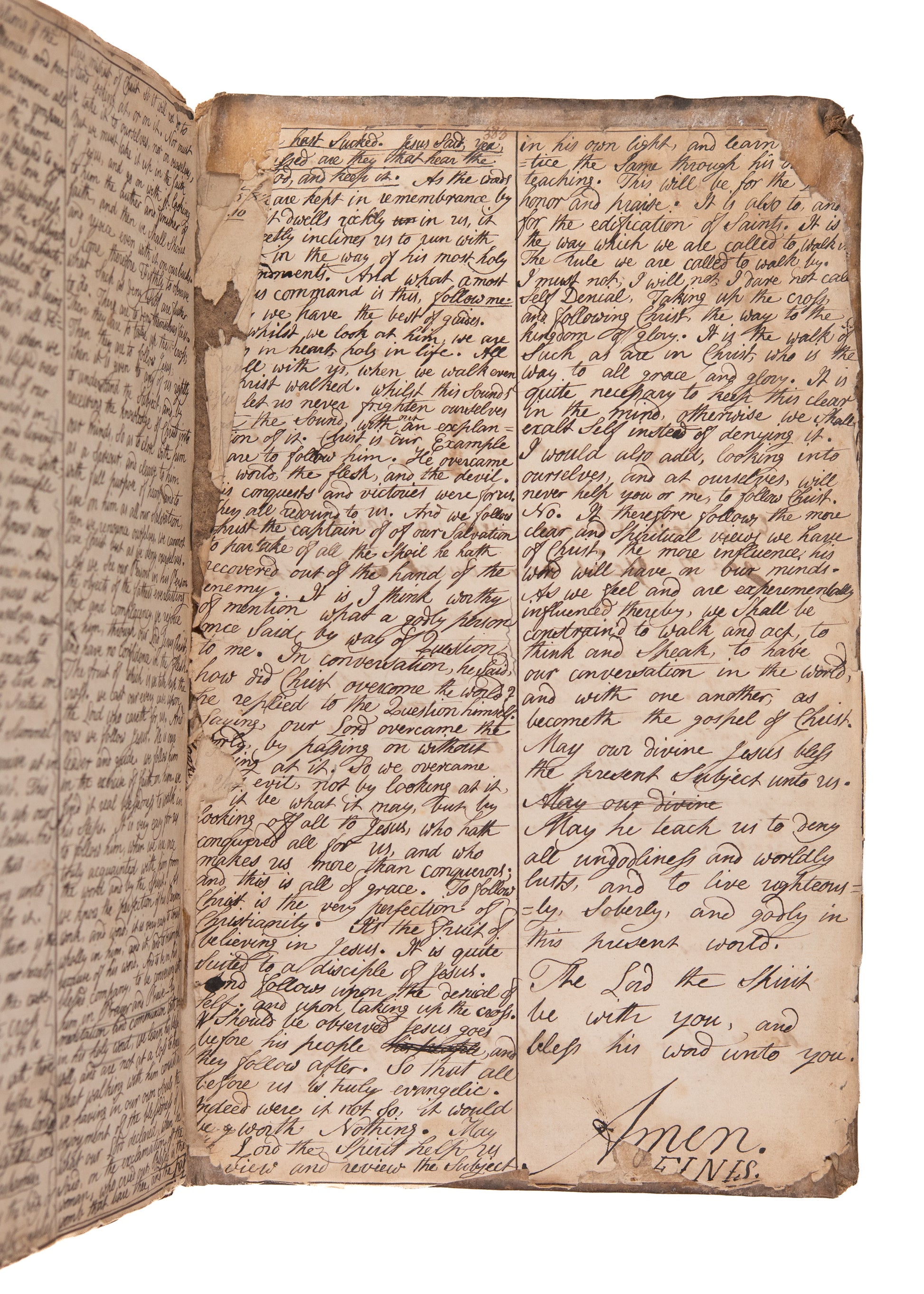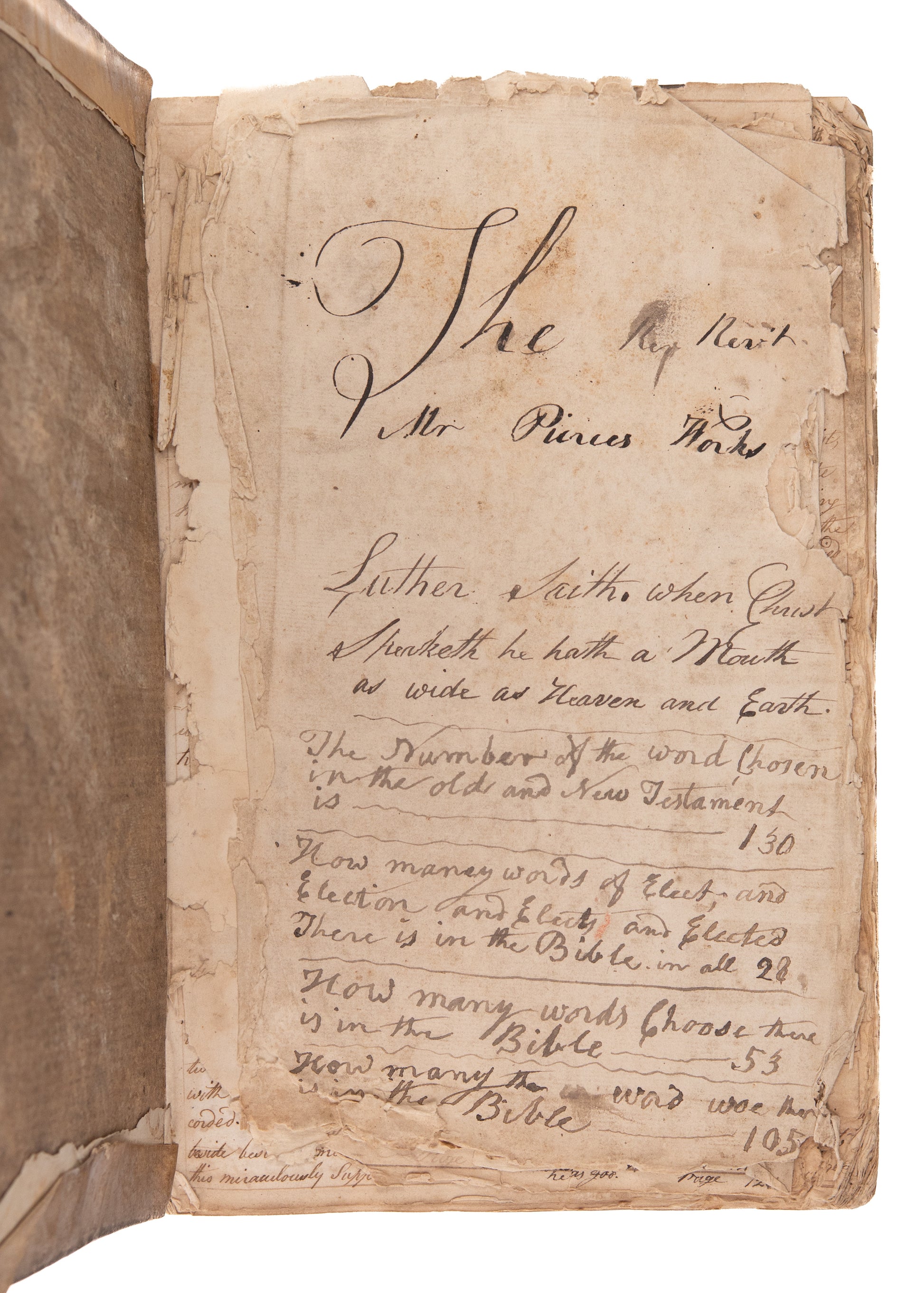 Simple titled on the first leaf, The Rev’d Mr. Pierce’s Works, this 383 page, 200,000+ word unpublished manuscript contains 33 complete sermons entirely in the hand of one of the most deeply experimental Baptist divines of the late 18th and early 19th centuries, Samuel Eyles Pierce [1746-1829].