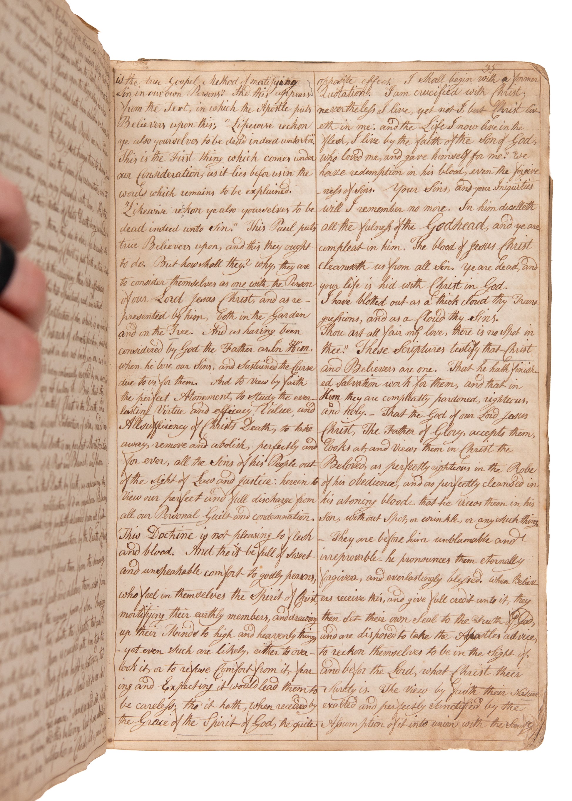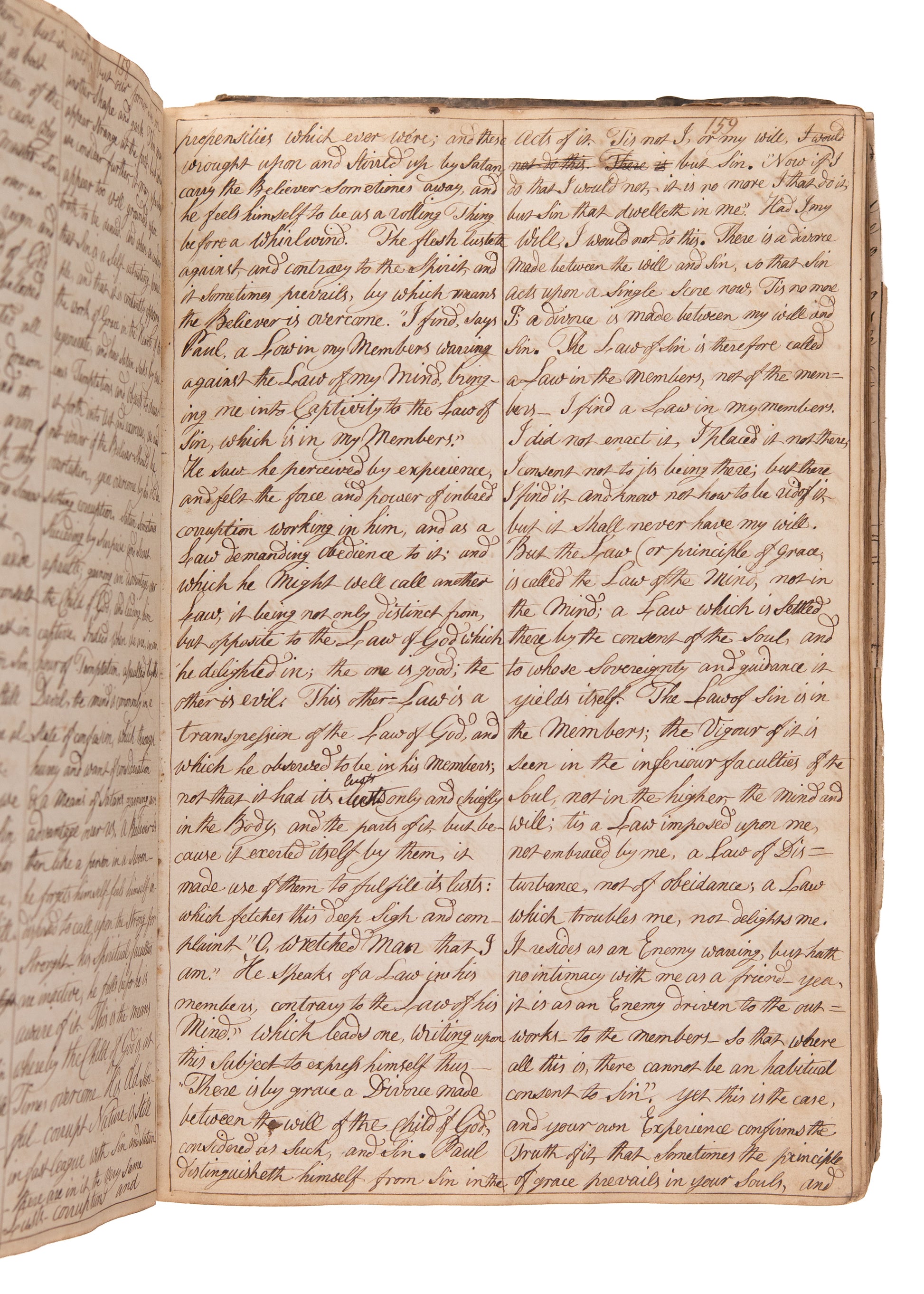 The document, entirely in his hand, is full of the same spiritual fervor and full views of the Gospel of Grace as others published, including certain phrases or ideas that were nearly idiomatic with him, for instance, on one page, he quotes his early influence, William Romaine, referring to him as “holy Romaine” [p.248]. This is the same moniker he applied to Romaine in his printed sermon, The Death of Christ. A Complete Atonement Provided for the Sins of the Elect [p.6.], etc.