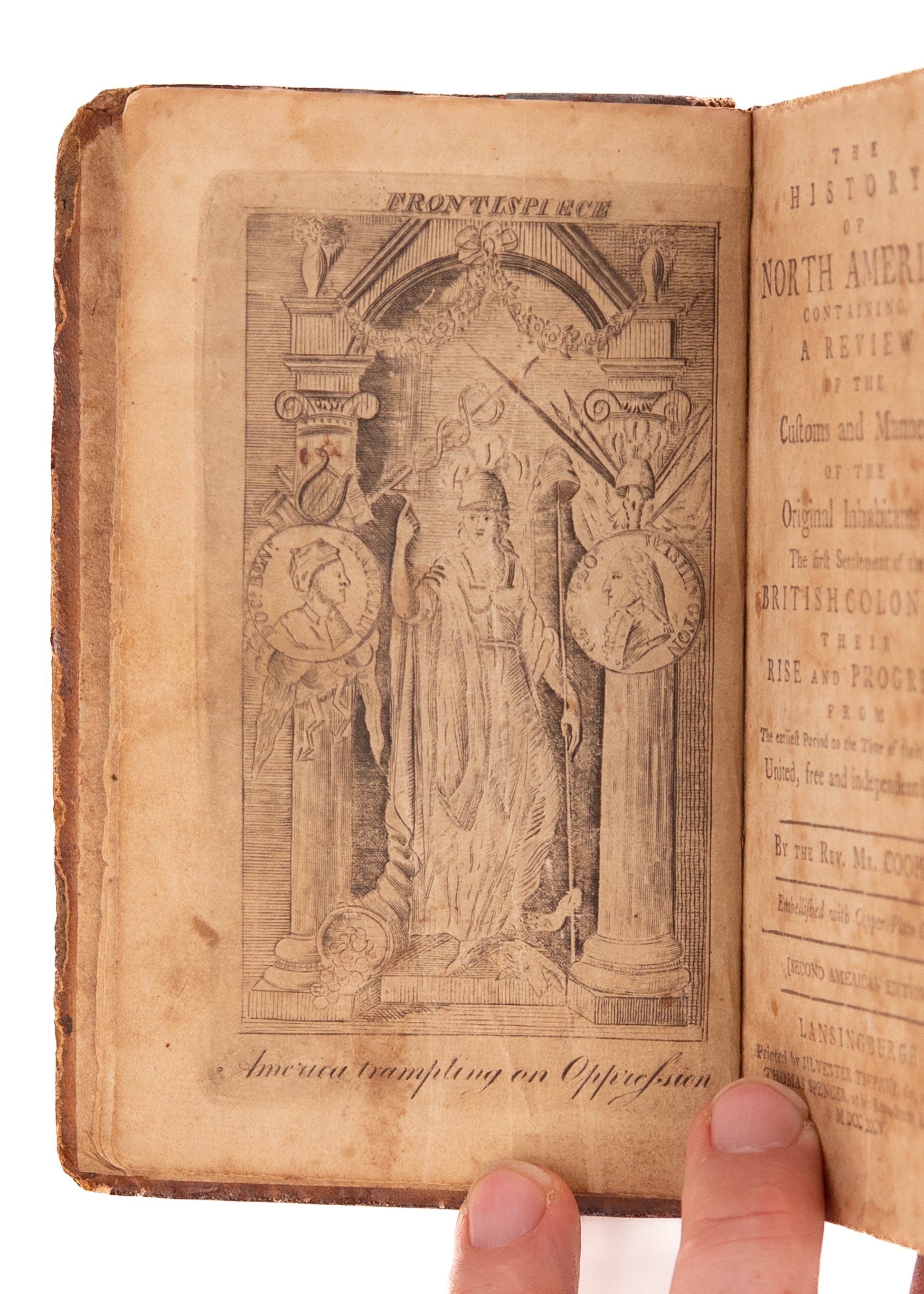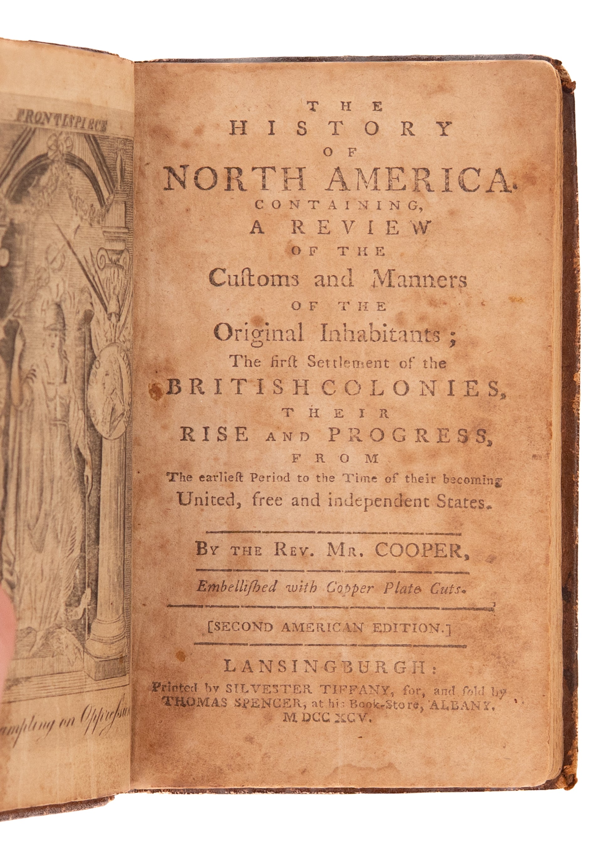 Cooper, William. The History of North America. Containing a Review of the Customs and Manners of the Original Inhabitants; The First Settlement of the British Colonies, Their Rise and Progress from the Earliest Period to the Time of Their Becoming United, Free and Independent States. Lansingburgh, New York. Silvester Tiffany, for, and sold by Thomas Spencer at his Book-Store, Albany. 1795. 159pp.
