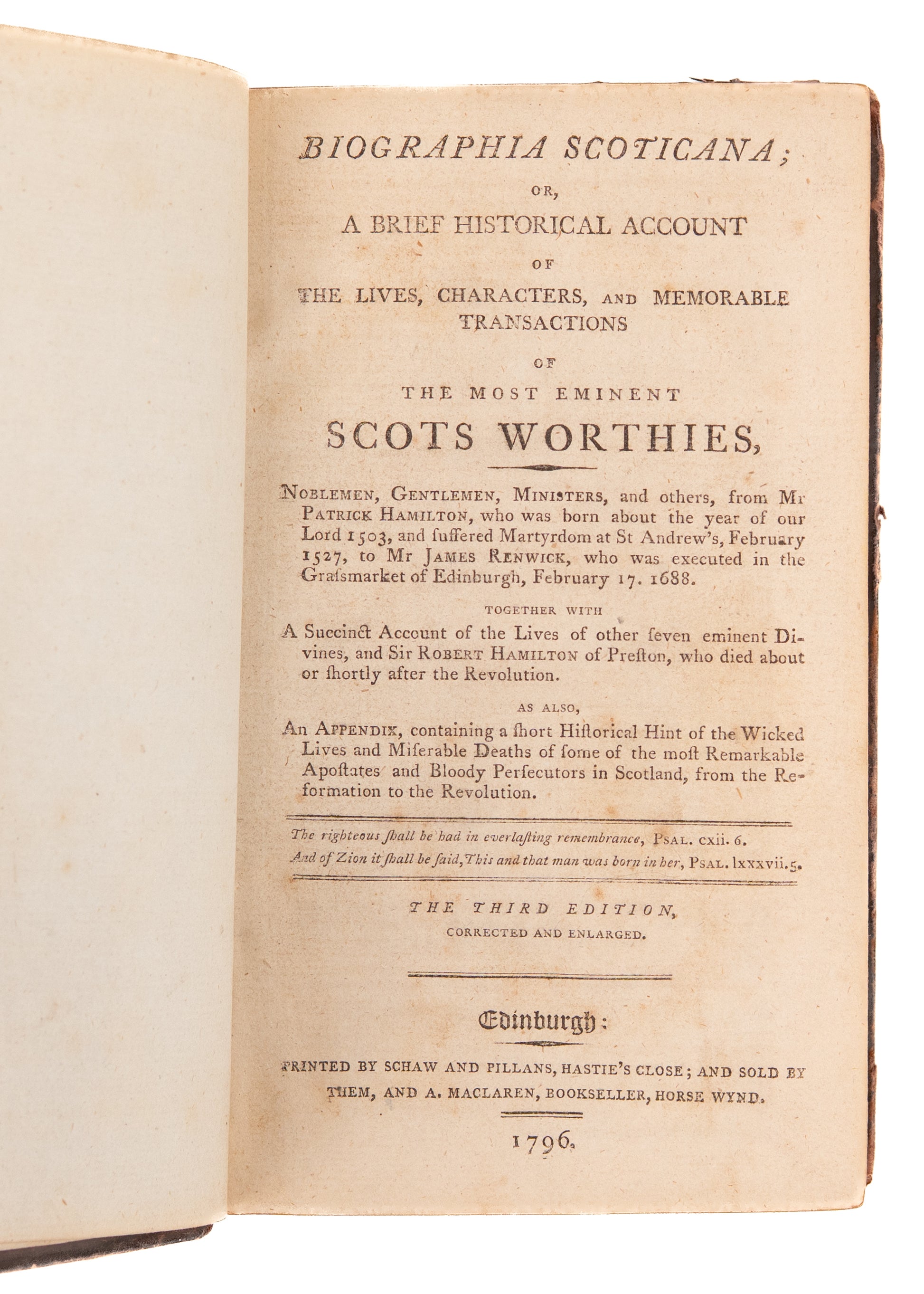 Biographia Scoticana; Or, A Brief Historical Account of the Lives, Characters, and Memorable Transactions of the Most Eminent Scots Worthies, Noblemen, Gentlemen, Ministers, and others, from Mr. Patrick Hamilton, who was born about the year of our Lord 1503, and suffered Martyrdom at St. Andrew’s, February 1527, to Mr. James Renwick, who was executed in the Grassmarket of Edinburgh, February 17, 1688. Together with a Succinct Account of the Lives of other Seven eminent Divines, and Sir Robert Hamilton of Preston, who died about or shortly after the Revolution. As also, an Appendix, containing a short Historical Hint of the Wicked Lives and Miserable Deaths of some of the most Remarkable Apostles and the Bloody Persecutors in Scotland, from the Reformation to the Revolution. Third Edition. Corrected and Enlarged. Edinburgh. Printed by Schaw and Pillans, Hastie’s Close. 1796. 582pp + 48pp.