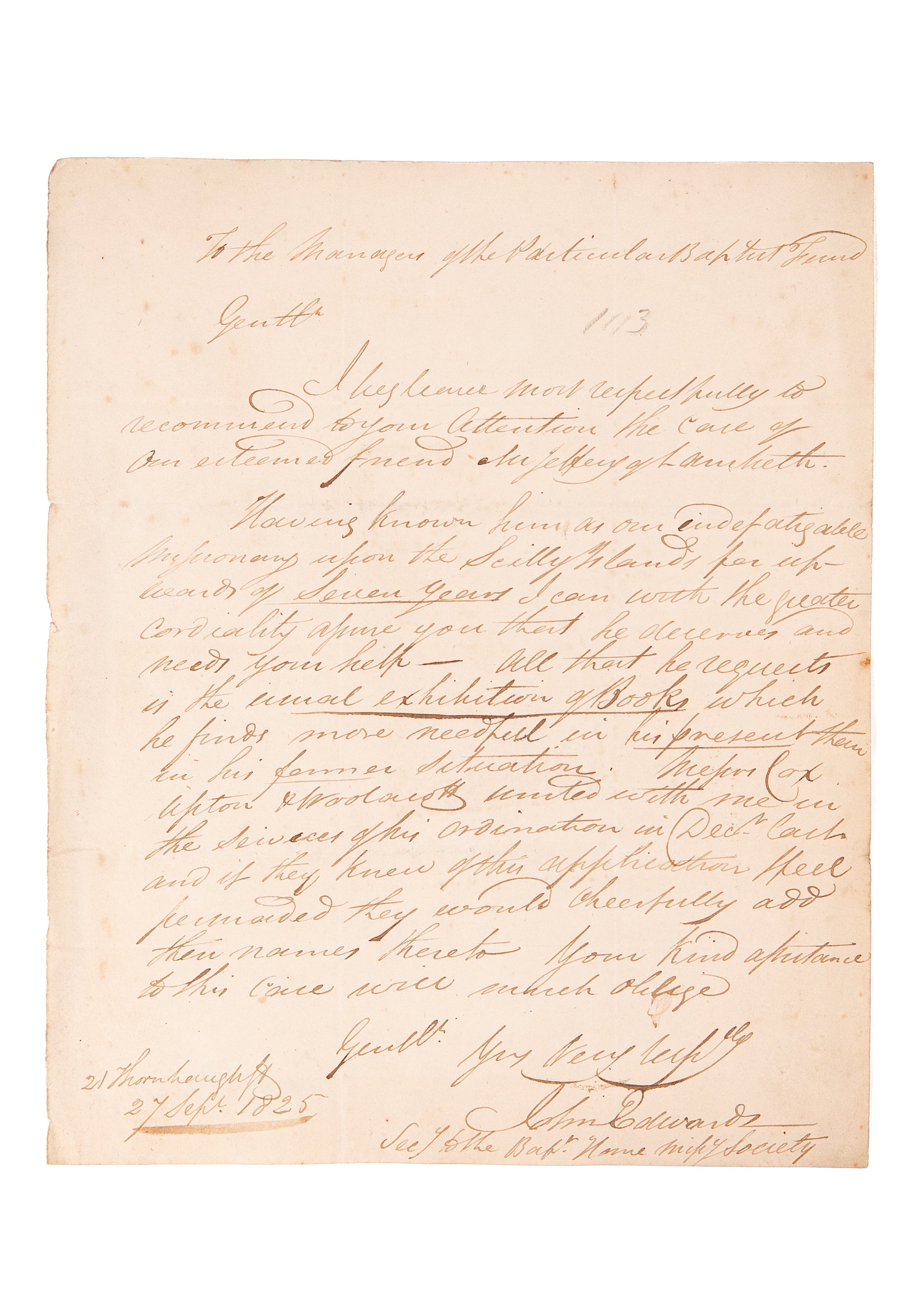 An interesting and very early Particular Baptist document written by John Edwards of the [Particular] Baptist Home Missionary Society in London to the Particular Baptist [Relief] Fund with regard to former Baptist missionary to the Scilly Islands, J[ohn] T. Jeffery. He had since become the Pastor of a Particular Baptist church plant in Gray's Walk [London]. There is an account of his ordination in the Baptist Magazine for 1825 HERE.