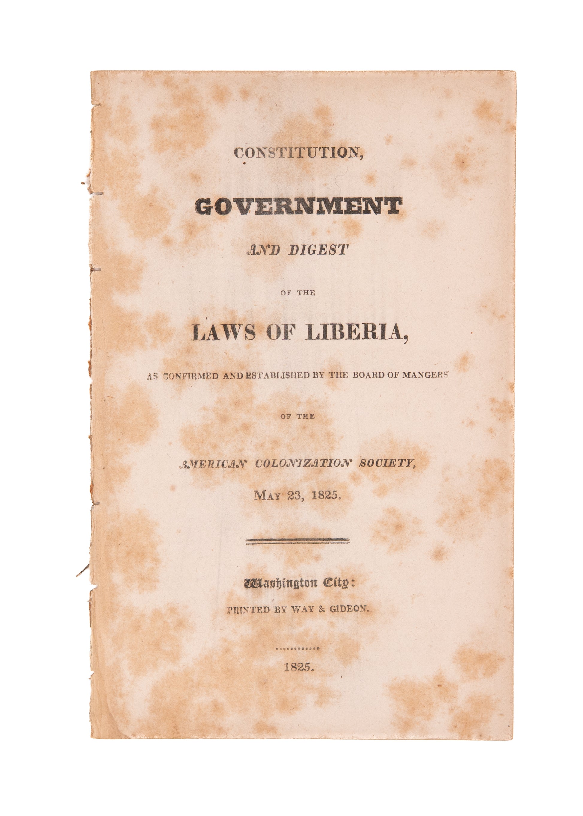 A critical first printing of the Constitution for the Government of the African Colony at Liberia.