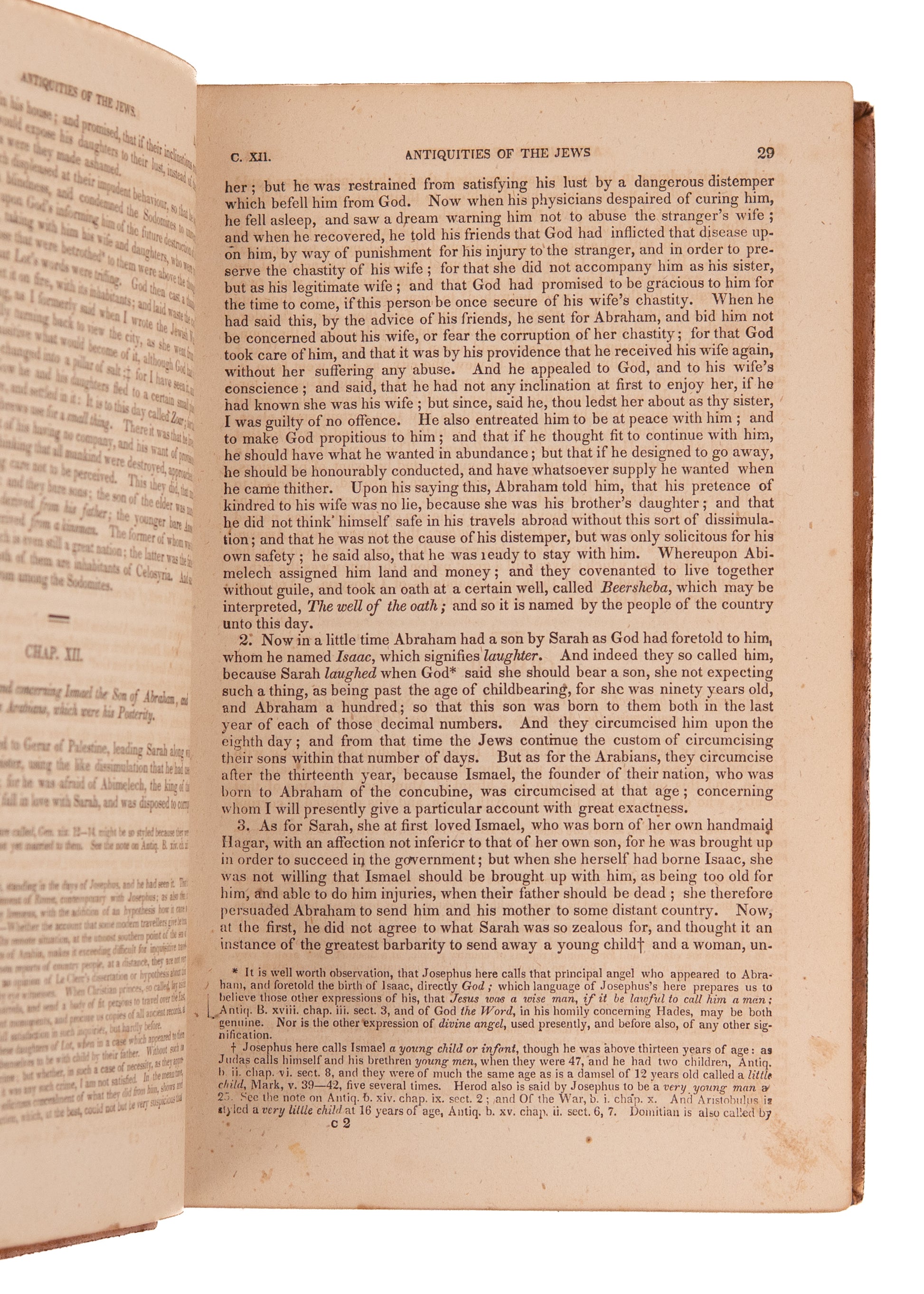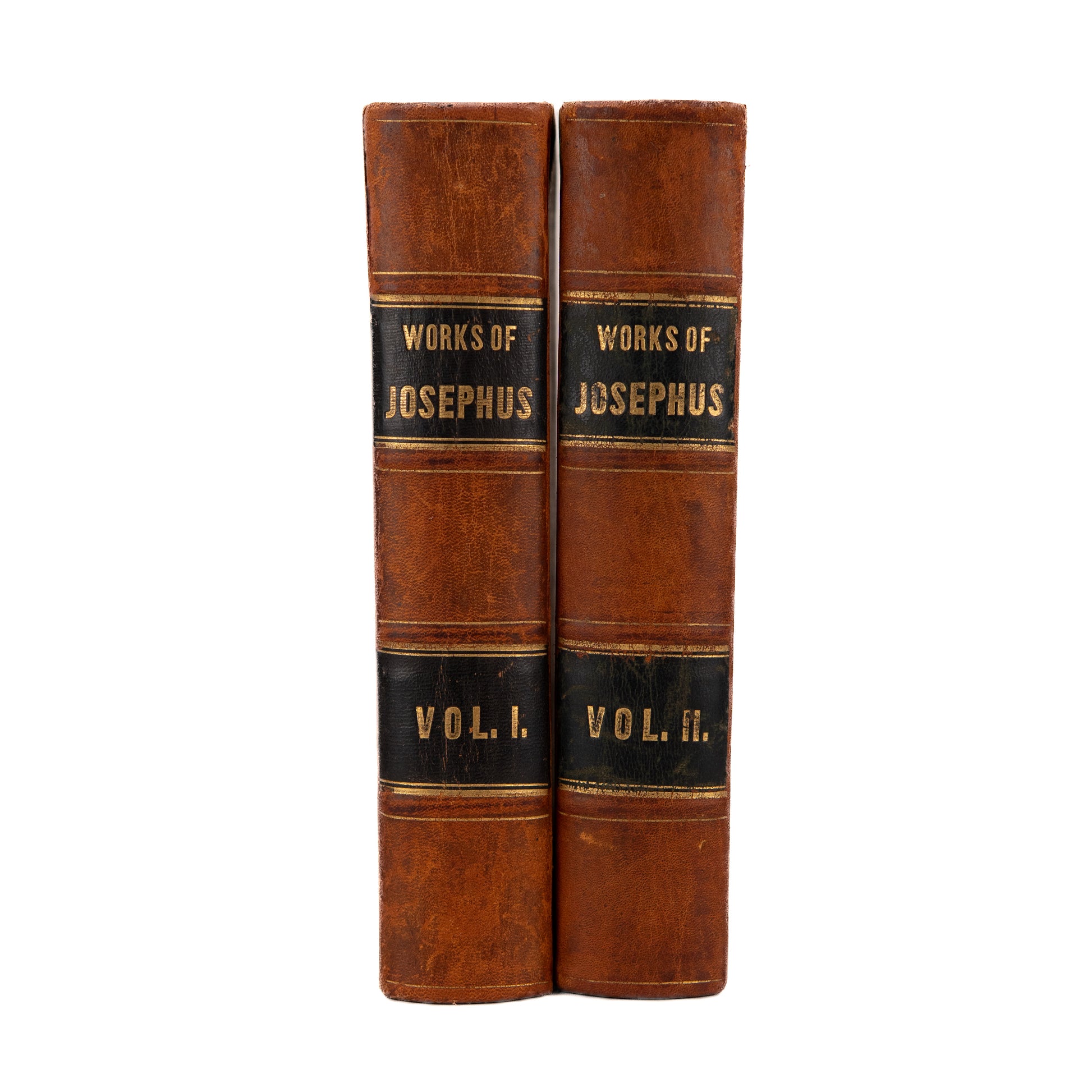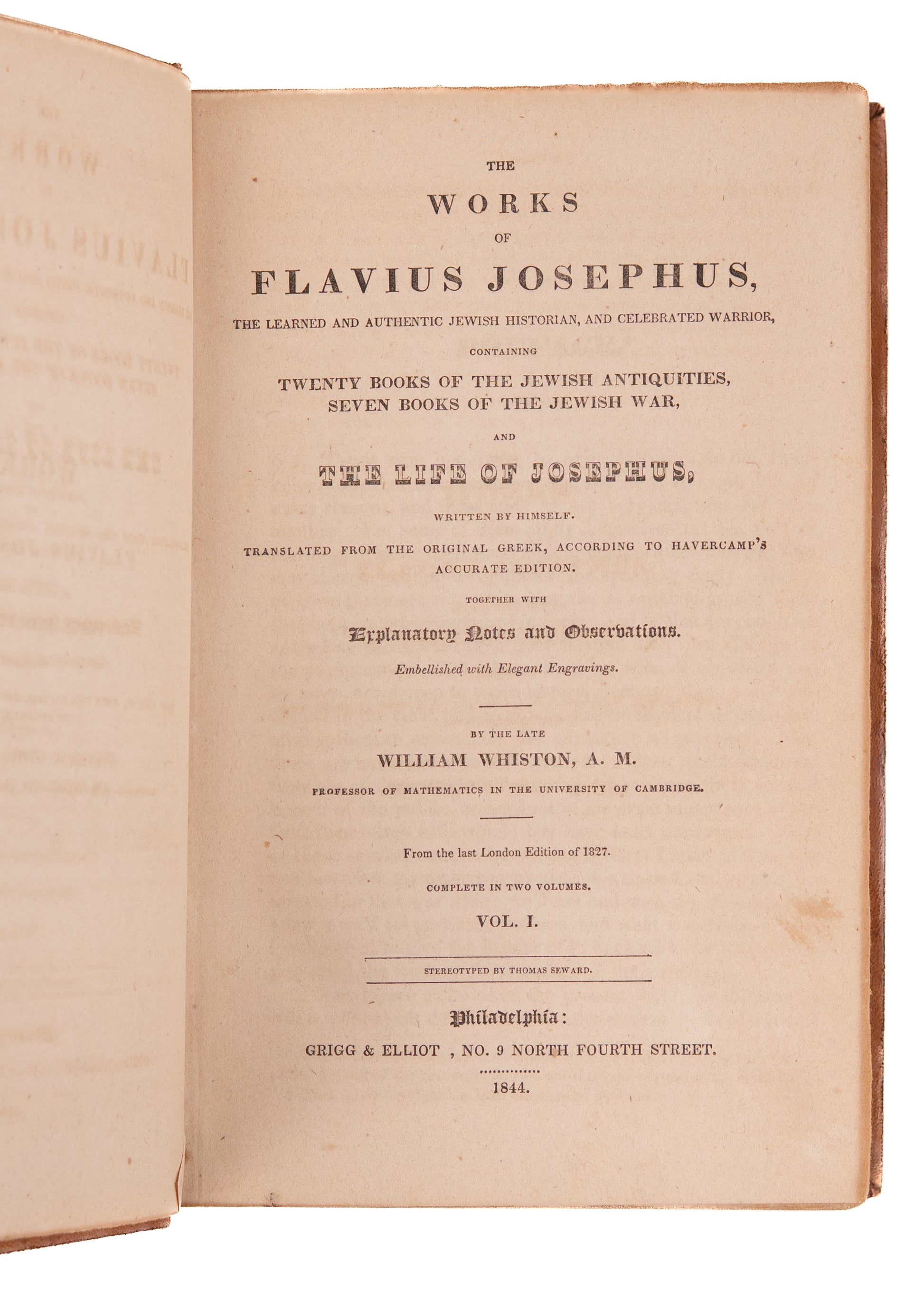 Josephus, Flavius & William Whiston. The Works of Flavius Josephus, The Learned and Authentic Jewish Historian, and Celebrated Warrior, Containing Twenty Books of the Jewish Antiquities, Seven Books of the Jewish War, and the Life of Josephus, Written by Himself. Translated from the Original Greek, According to Havercamp's Accurate Edition. Together with Explanatory Notes and Observations. Embellished with Elegant Engravings. By the Late William Whiston, A. M. Professor of Mathematics in the University of Cambridge. From the Last London Edition of 1827. Complete in Two Volumes. Vol. I & II. Philadelphia. Grigg & Elliot. 1844. 582pp. + 595pp.