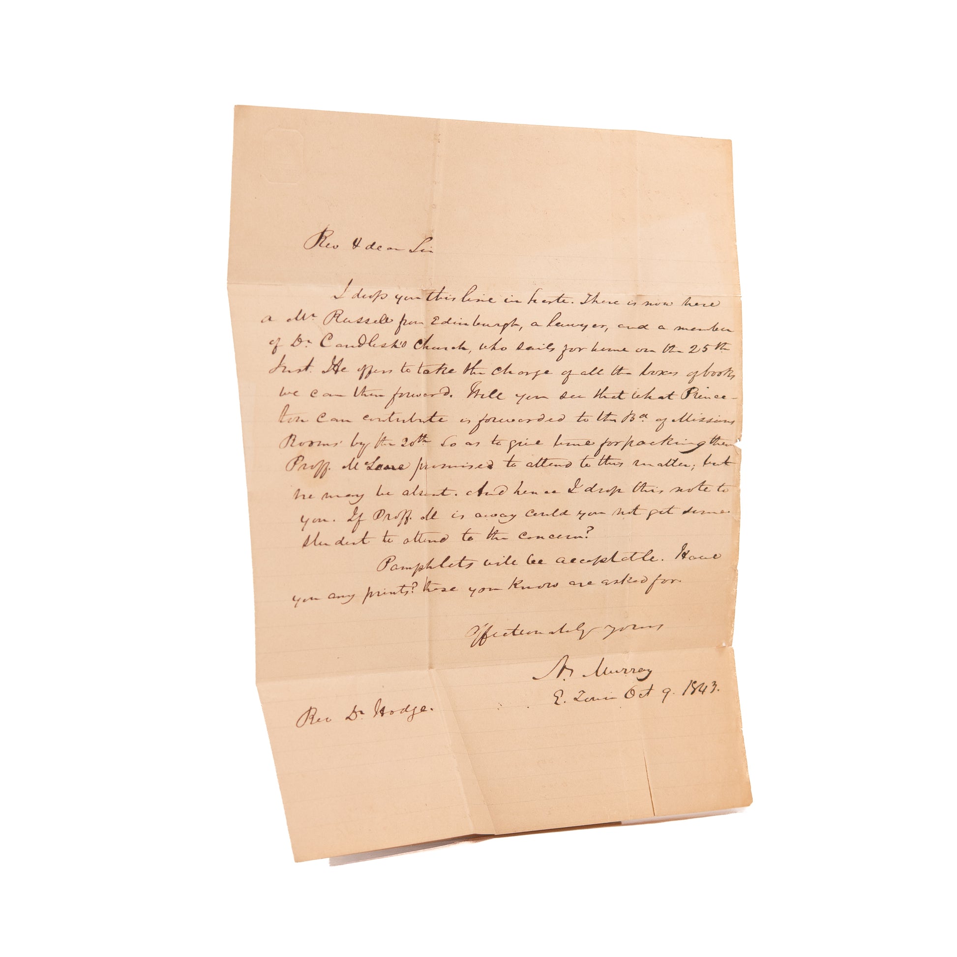 An attractively preserved 1p. ALS from Nicholas Murray of the Presbyterian Board of Missions to Charles Hodge of Princeton regarding the donation of books to be sent to the Scottish Presbyterian church in connection with Robert Candlish, etc. A nice little survivor.