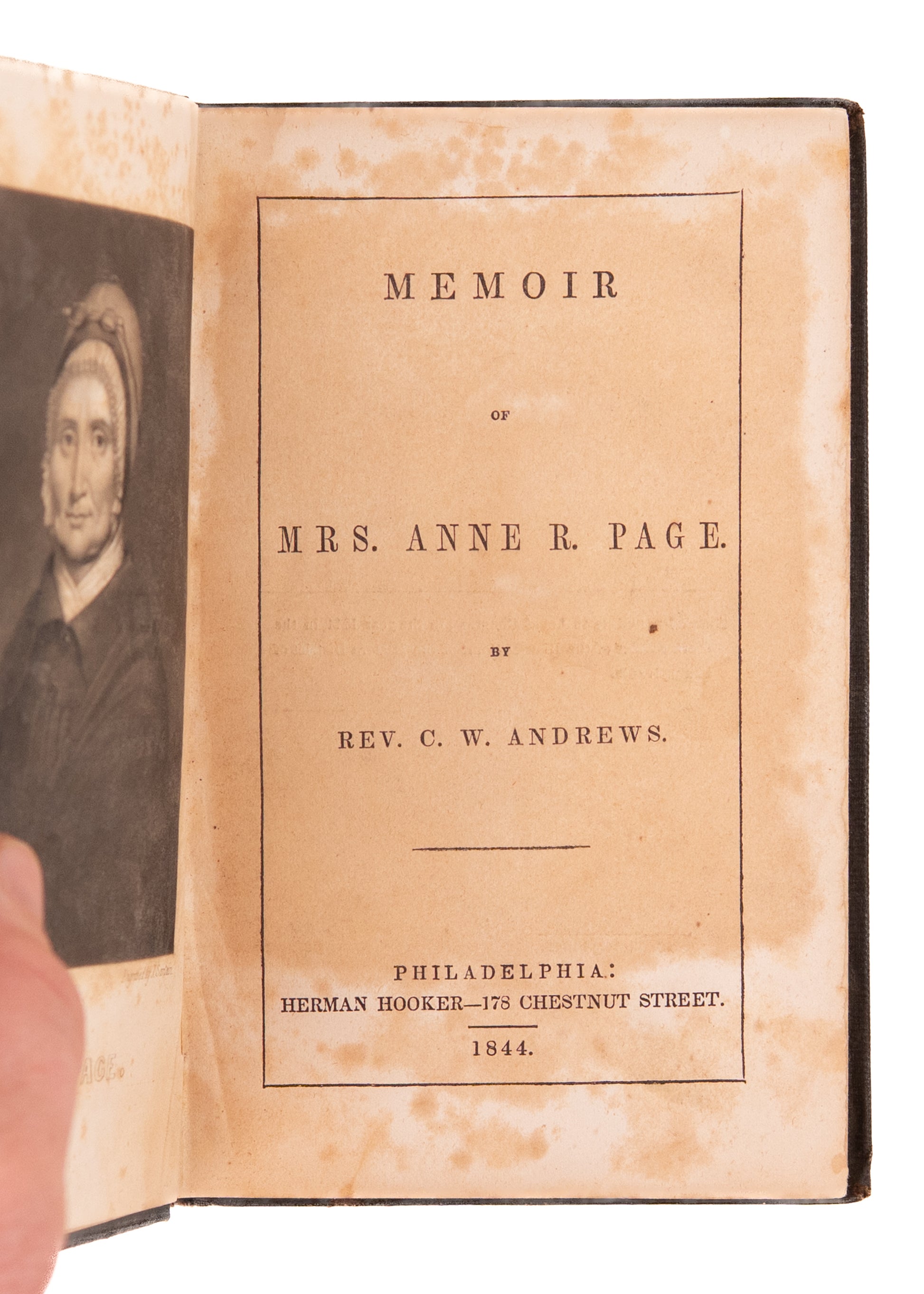 [Anne Page - Colonization - Abolition - Slavery]. Andrews, Rev. C. W. Memoir of Mrs. Anne R. Page. Philadelphia. Herman Hooker. 1844. 101pp.