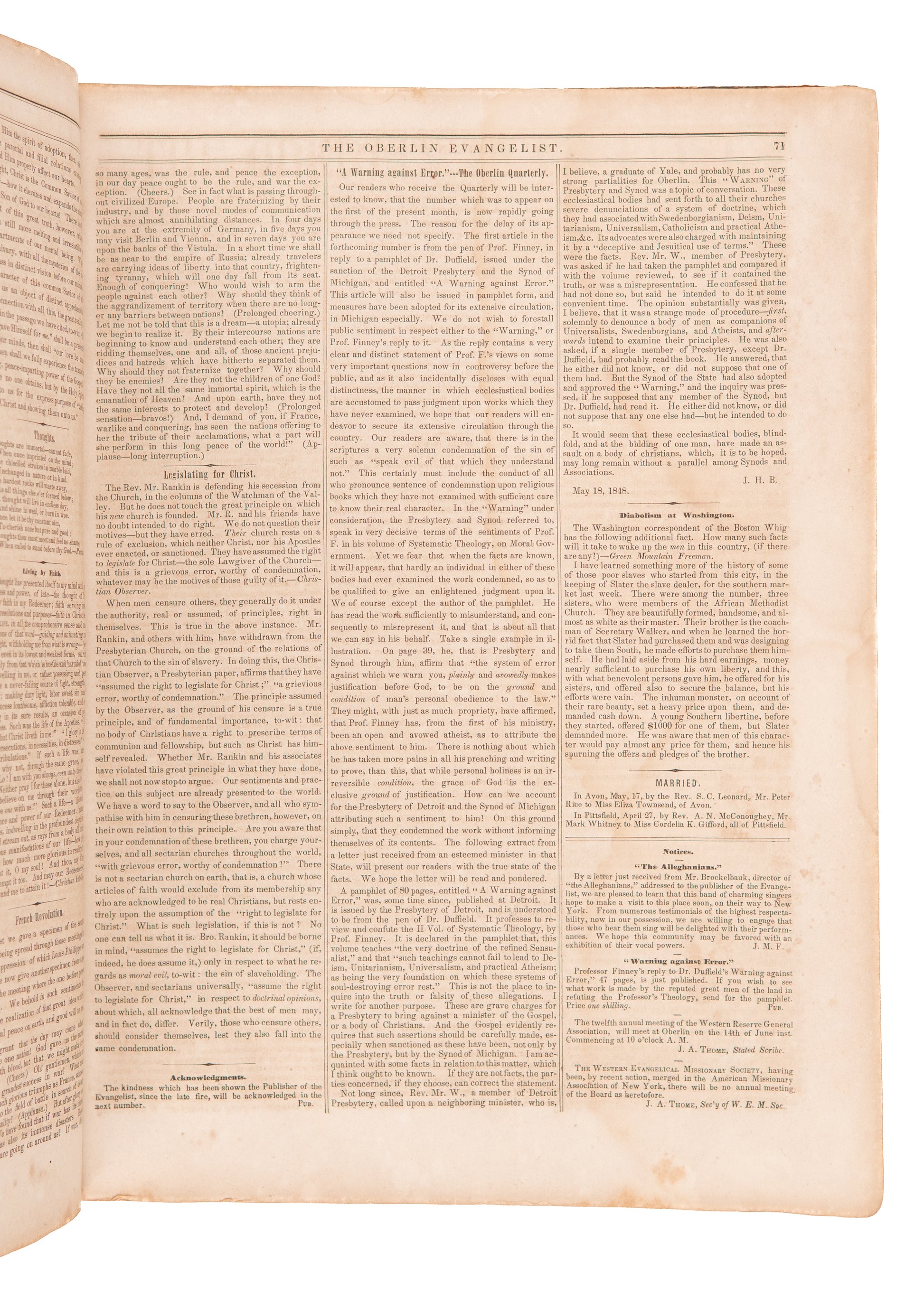 Contents include: A Living and Dead Faith - Sermon by Asa Mahan; Last Sickness and Death of Mrs. Finney; Slavery and its Village Fruits [Series on Slavery on the Western Frontier]; Slaveholding Examined in the Light of the Holy Bible; The Vigilance Committee to Prevent Kindapping; Facts that Deserve to be Pondered Preferring Gradual Accessions to the Church to Sudden Additions through Wide Spread Revivals; Letters to the Oberlin Evangelist from J. S. Green of the Sandwich Islands [Extensive Series - Makawao, East Maui]; Faith Impossible to All who Seek Honor One of Another - Sermon by Asa Mahan; How to Preach with Power to the Conscience of the Sinner; Revivals beginning to Return; The Little Slave Boy - James Henry is Free [northern children helped purchase the freedom of a child slave through contributing via the Oberlin Evangelist]; Description of "A Happy Slave;" Finney's Revival Lectures; The Beauty of Juvenile Piety; Papers on War by John B. Beach; Abolitionists - Men of One Idea; Henry Ward Beecher; Revival in Mansfield; All Things Working for the Good of the Believer - A Sermon by Asa Mahan; Revival Spirit; Scriptural View of the Efficacy of Prayer Reasonable; Oberlin Views of the Presbyterian Confession of Faith; Letter from George Thomson [on attending a colored church, piety of the negro Christians, etc.]; The Siam Missionaries and Perfectionism; The Revival Era in England which Commenced with Whitefield; Slave-Holder's Creed; Difficulties Connected with the Doctrine of Sanctification Stated and Removed. by Charles Finney; An Appeal on Behalf of the Siam Mission; The American Sunday School Union and Slavery; Slavery's Doings; The Present Position of the Northern States; The Recent Troubles in Hayti [Haiti]; The Anti-Slavery Movement; The Conservative Element in a Republican Government; Peace - Elihu Burrit's Pledge; The Mystery of Divine Love; Pungent Preaching; The Siam Mission - The American Board - and Dr. Bradley; The Rage for Fiction; Letter from an Influential Clergyman in Michigan to Prof. Finney with a Reply by President Mahan; New Aspect of the Anti-Slavery Cause [on divisions between Garrison and others]; The American Home Missionary Society and Slavery; A Change of the Sabbath from the Seventh Day to the First Day of the Week Directly Predicted in the Old Testament ; The Colored People in Canada; Free Soil Anti-Slavery Movement; Refuges of Lies - A Sermon by Professor Charles G. Finney; The Ohio Asylum for the Deaf and Dumb; The Triumph of Prayer; Frederick Douglass and the North Star; To the Anti-Slavery Christian Public - A Voice from Africa - Written by George Thompson in Freetown, Sierra Leone; The Spirit Not Striving Always - A Sermon by C. G. Finney; The Character of Our Prayer Meetings; The Comforter by Miss Prudentia C. Safford; Excuses Condemn God by C. G. Finney; The Mission to the Ojibewas; The Conditions of Being Saved - A Sermon by Charles G. Finney; First-Hand Account of a Visit to Utah, the Mormons, "Prophet Joe," etc.; Where are the Intercessors; The Use of Tobacco; The Pride of Heart Deceives - Sermon by C. G. Finney; William Lloyd Garrison - The Liberator - And the Bible; George - The Slave Poet; etc.