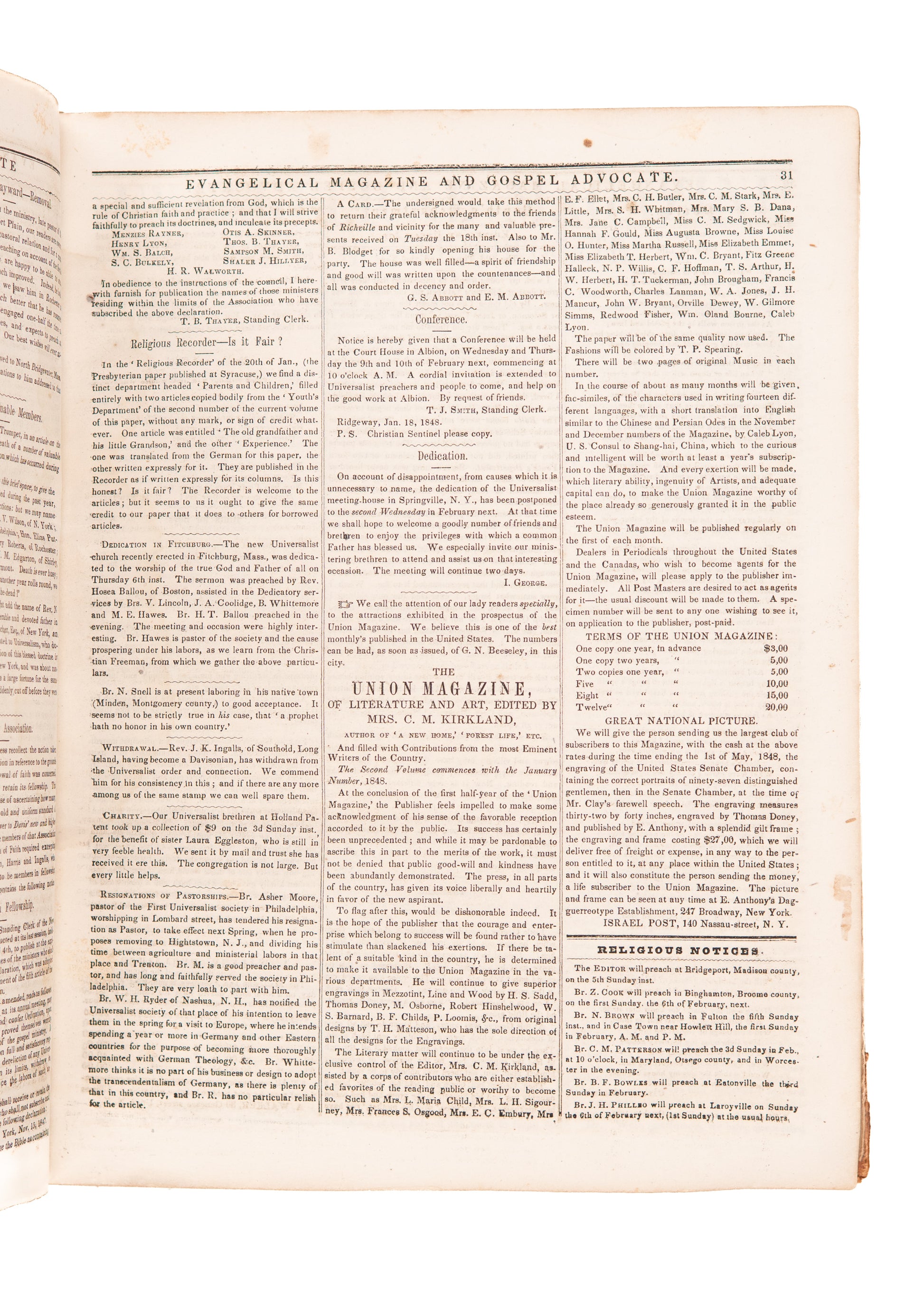 Contents include: Mesmeric Revelations - Brother Williamson's Views of Davis' New Work; The Miraculous Conception - Its Pro and Con by E. J. Lewis; An Original Christmas Hymn by G. Roberts; Universal Salvation by Laura Eggleston; Moral Darkness in Virginia; Spirit's Yearnings by N. Brown; A Reason for Preaching Universalism; The Constitution of the Ontario Association of Universalists; The Way to Keep Out Heresy; A Dream; Professor Finney's Opinion [Charles Grandison Finney on Imputation]; A Vision; Need of an Educated Ministry; Our Cause in Michigan; The Mourner's Dream; Clerical Slander Refuted; Printing in China; Red, White, and Black [Native Americans]; Uncharitableness by G. S. Abbott; Elder J. Knapp; Destitute Societies and Unemployed Preachers; Mesmerism and Bigamy; Philosophy of Mesmerism; Universalism vs. Phariseeism and Sadduceeism by B. Hunt; Dr. Griffin on an Immortal Soul; Universalist Logic; Br. Philleo and the Baptist Church of Scotland; Presbyterian Boasting; The Beauty of Holiness; Davis and His Revelations; War on Christian Principles; Death of John Quincy Adams; Pride of Sectarianism; Thoughts on Repentance by N. Brown; Endless Misery; Elder Knapp at Factoryville - Fearful Account of the Editor; Thomas Thumb, Esq. [Tom Thumb]; Christ's Second Coming; Selling Souls to the Devil; Moral Influences of Universalism; Discourses on the Life and Character of John Quincy Adams; Forever and Ever by A. C. Thomas; Anti-Capital Punishment; The Character of Revivals [Suicides, etc.]; Christ's Second Coming; The [Pretended] Lawfulness of War; Anti-Sabbath Convention; Review of Thomas Whittemore's Exposition of the Book of Revelation; Intrepidity of John Q. Adams; Footprints of Angels. A Chapter from Hyperion by Henry Wadsworth Longfellow; Remission of Just Punishment; Horace Greeley and the Skeptics; The Quaker and the Thief; Hell Preferred to Heaven. A Tale of Truth by S. W. Remington; Decrease of Methodists; Error Trancient - Truth Immutable; The Last Enemy Destroyed; Letter from a Pupil of the New York Institution for the Blind; Campbellites in Kentucky; Hope and Mercy by Mrs. Sigourney; Horrors of Heathenism; Deceiving and Being Deceived by Orren Perkins; Davis' Revelations! The Haunted House; Hell by Samuel C. Loveland; Shocking Immoralities and Crimes. Does Endless Misery Save its Believers Therefrom?; The Most Wicked of Some Value by George H. Emerson; John Quincy Adams by Laura Eggleston; The Doctrine of Endless Punishment the Cause of Persecution; Cure of Hydrophobia; The Hell Controversy; Progress of Man to Ultimate Holiness by J. Stoddard; Anti-Slavery Feeling in Virginia; The Cholera; The Spirit of Christianity not the Spirit of Partialism; The Intense Heat of Hell; Experimental Religion; The Sufferings of Evil Doers; Destruction of Soul and Body in Hell; Female Labor; The Horrors of Endless Mistery; On the Personality of the Devil by O. C. Gibbs; The Siamese Twins; Elder Jacob Knapp; The Dying Slave Girl; Human Vengeance; War Unnecessary and Unchristian; Dr. Albert Barnes in a Universalist Meeting; More Knappisms; The Character of Washington; Pennsylvania Convention and Christian Freeman; Human Nature not Totally Depraved; Another Partialist Preacher Fallen; Love Toward Enemies; Caution Against Clairvoyants; The Millerites [Still At It]; The Millerites [again]; The Location of Hell; Religion and Politics; The Hidden Treasure - A Fairy Tale; Tormentors of the Sick and Dying; Parental Discipline of Puritans; etc.
