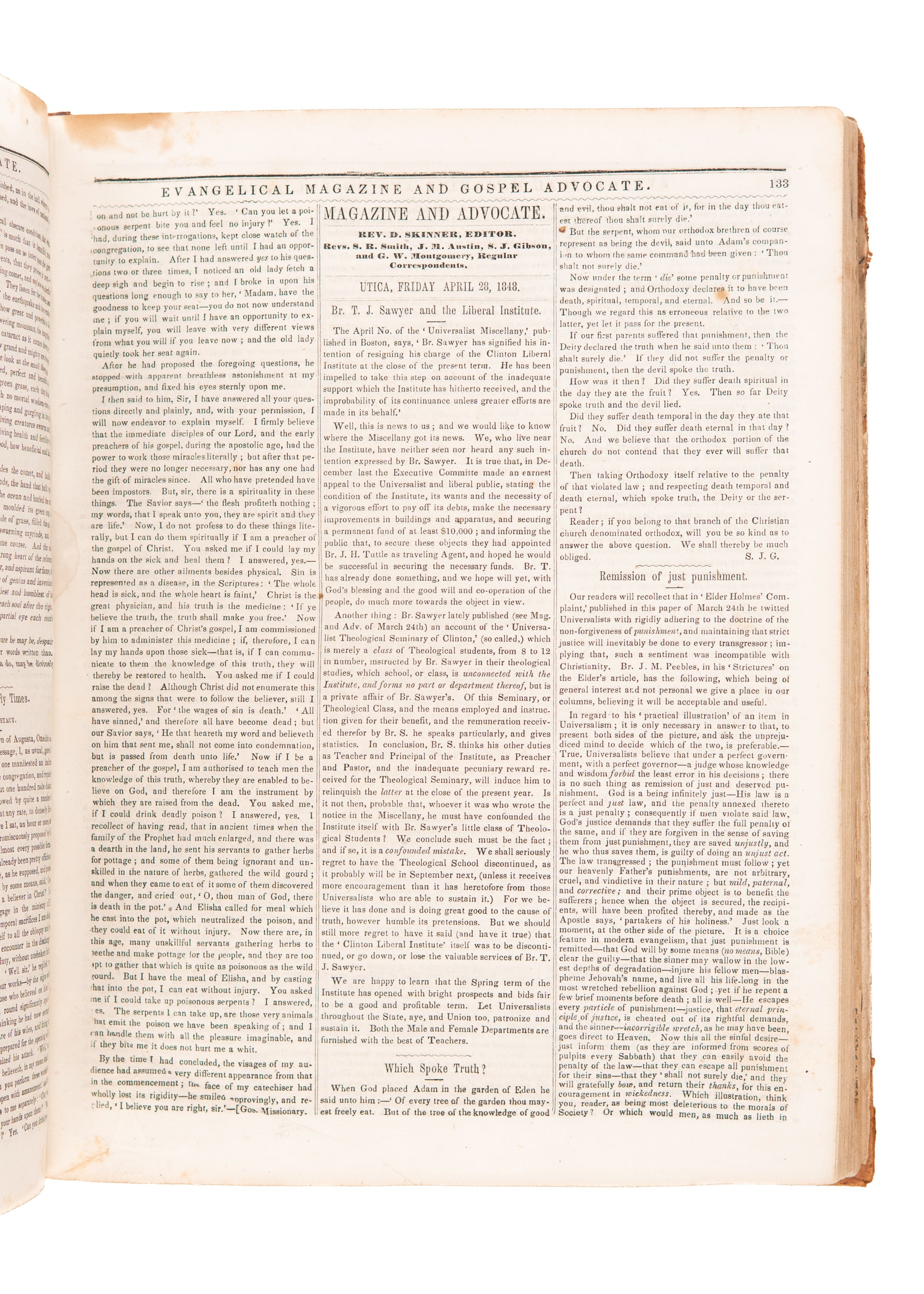 A very rare Christian Universalist - revivalist magazine with significant content against non-Christological spiritualism, mesmerism, etc., but also against the likes of Charles Grandison Finney and Elder Jacob Knapp. The authors argue for a deep personal, Christian experience, but are ardently opposed to the doctrine of Eternal Conscious Torment, arguing that it often leads to insanity, suicide, and despair . . . and that many leave the Christian faith because the doctrine is itself unethical and abhorrent to the thought of a loving, paternal God.