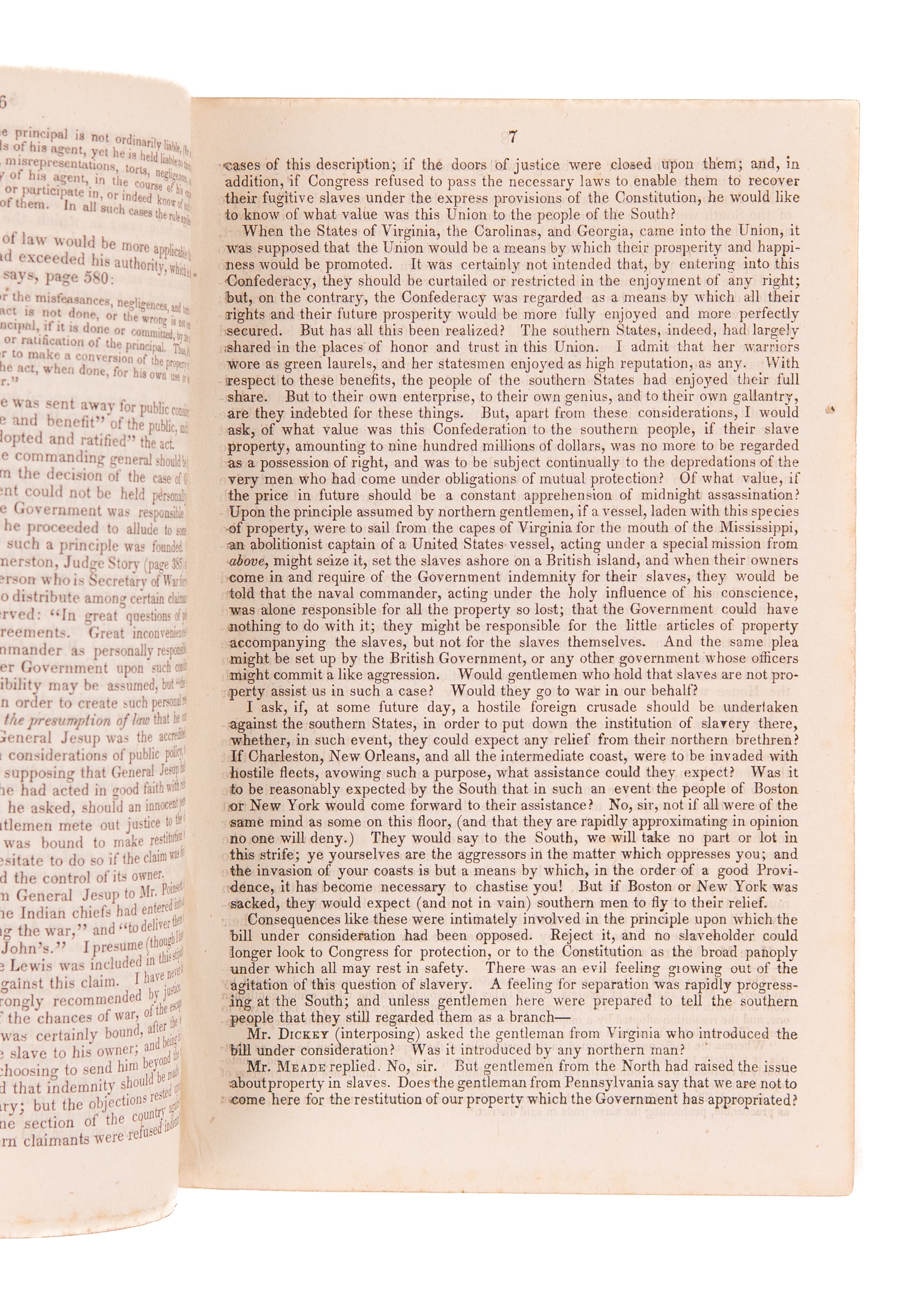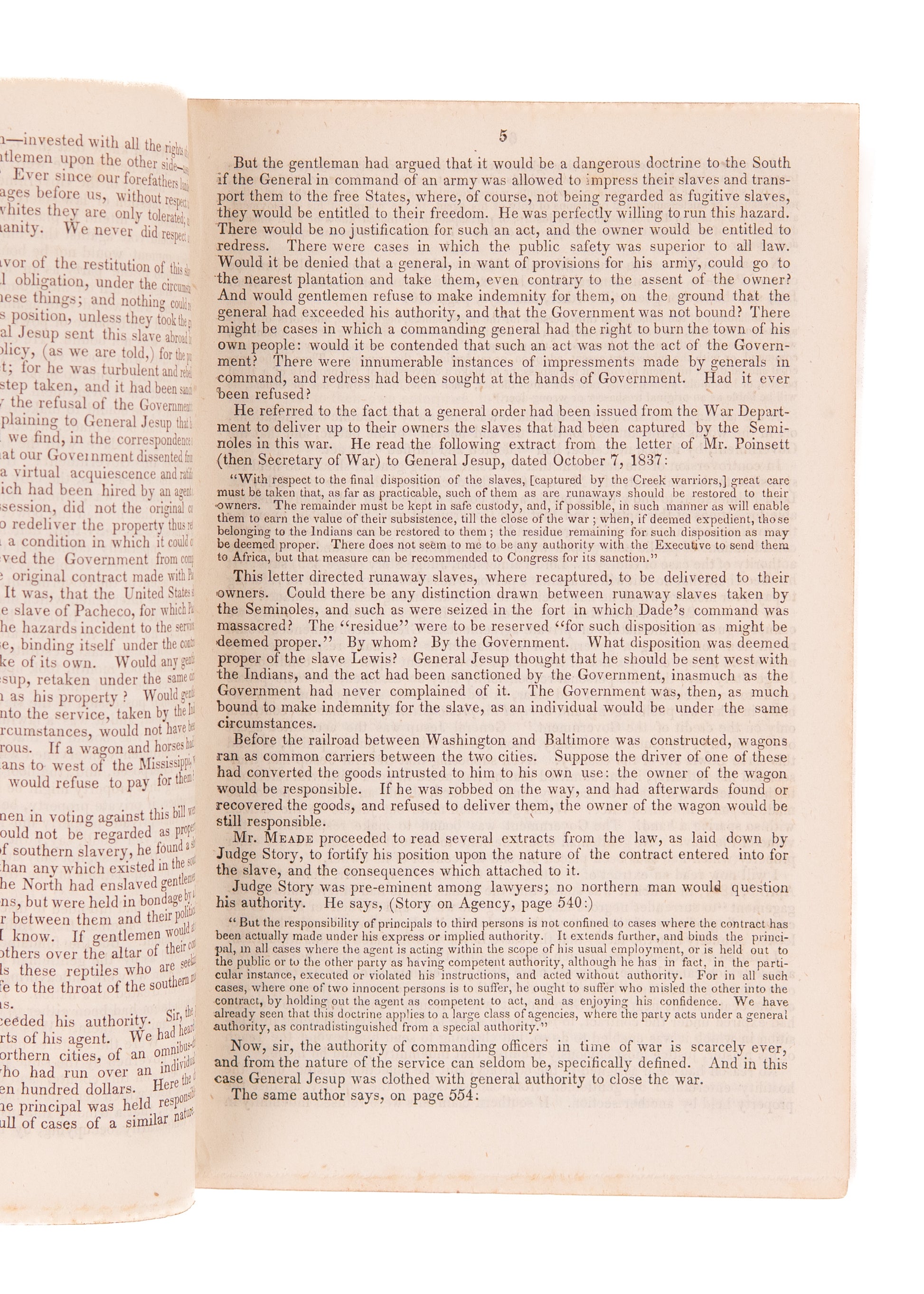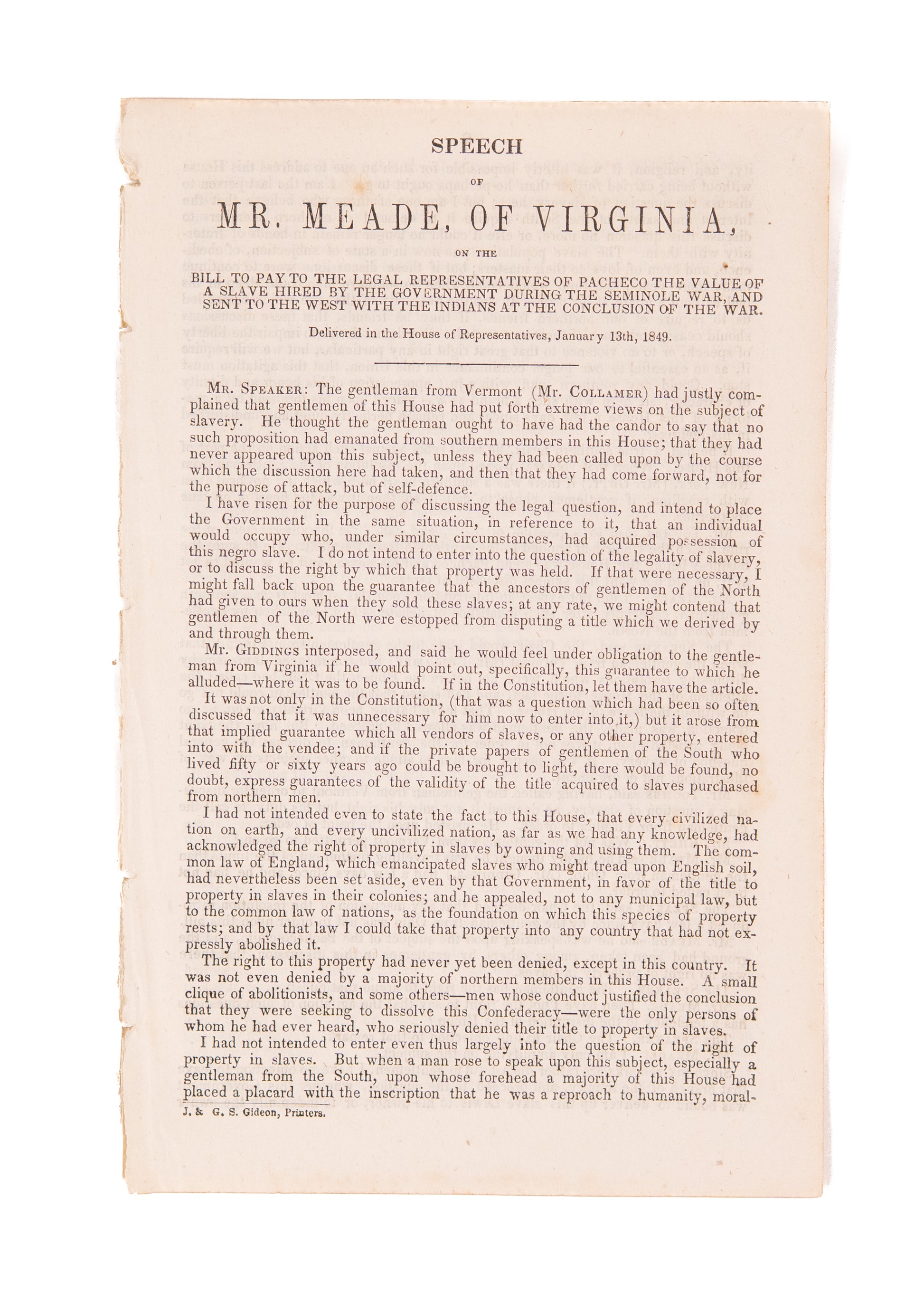 Speech of Mr. Meade, of Virginia on the Bill to Pay to the Legal Representatives of Pacheco the Value of a Slave Hired by the Government during the Seminole War, and Sent to the West with the Indians at the Conclusion of the War. Delivered in the House of Representatives, January 13th, 1849. Washington. J. & G. S. Gideon. 14pp.