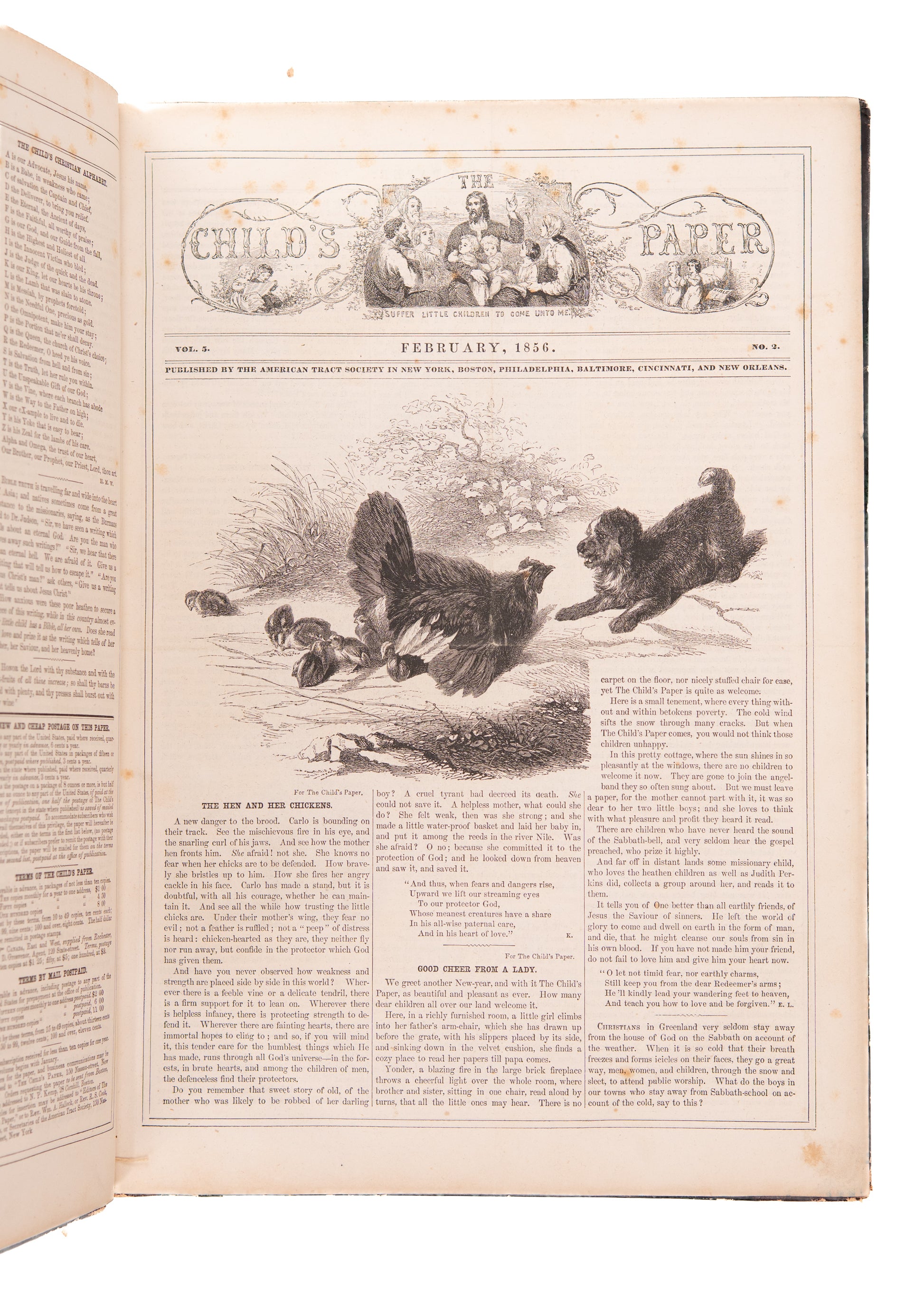 [American Tract Society, Juvenalia]. The Child's Paper. Volumes 5-10, January, 1856 through December, 1861 Complete. New York, Philadelphia, Boston, Cincinnati, and New Orleans. American Tract Society. 1856-1861. 288pp.