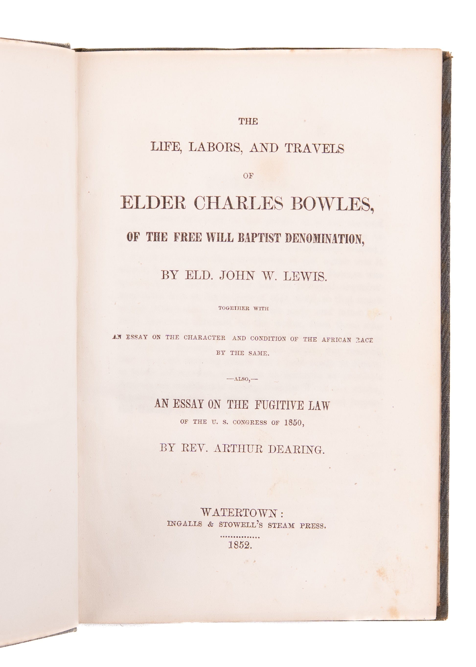 Lewis, Elder John W. The Life, Labors, and Travels of Elder Charles Bowles, of the Free Will Baptist Denomination, by Elder John W. Lewis. Together with an Essay on the Character and Condition of the African Race by the Same. Also, an Essay on the Fugitive Law of the U. S. Congress of 1850, by Rev. Arthur Dearing. Watertown. Ingalls & Stowell's Steam Press. 1852. 285pp. 285pp.