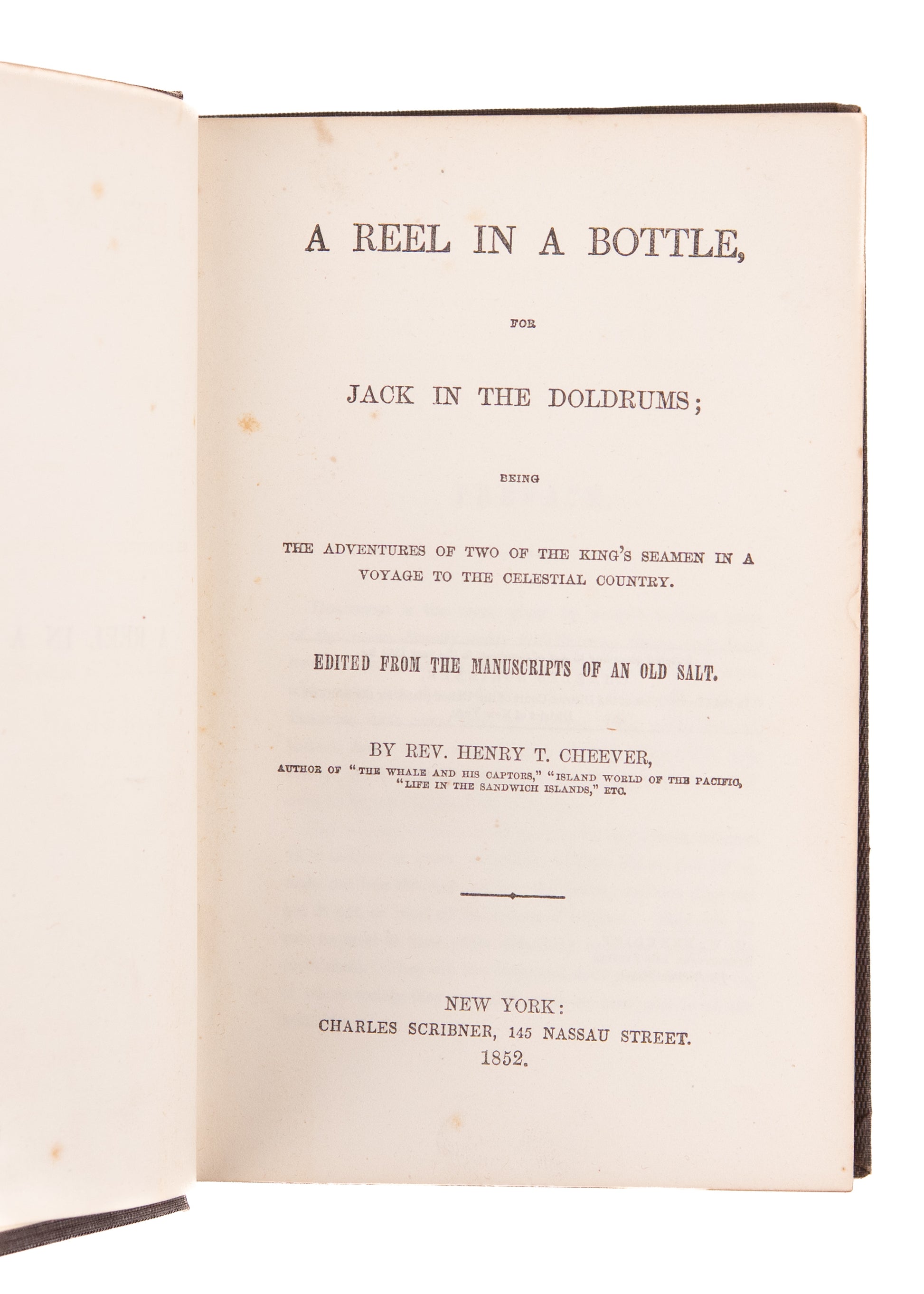 Cheever, Henry T. A Reel in a Bottle, for Jack in the Doldrums; being the Adventures of Two of the King's Seamen in a Voyage to the Celestial Country. Edited from the Manuscripts of an Old Salt. New York. Charles Scribner. 1852. First Edition. 355pp.