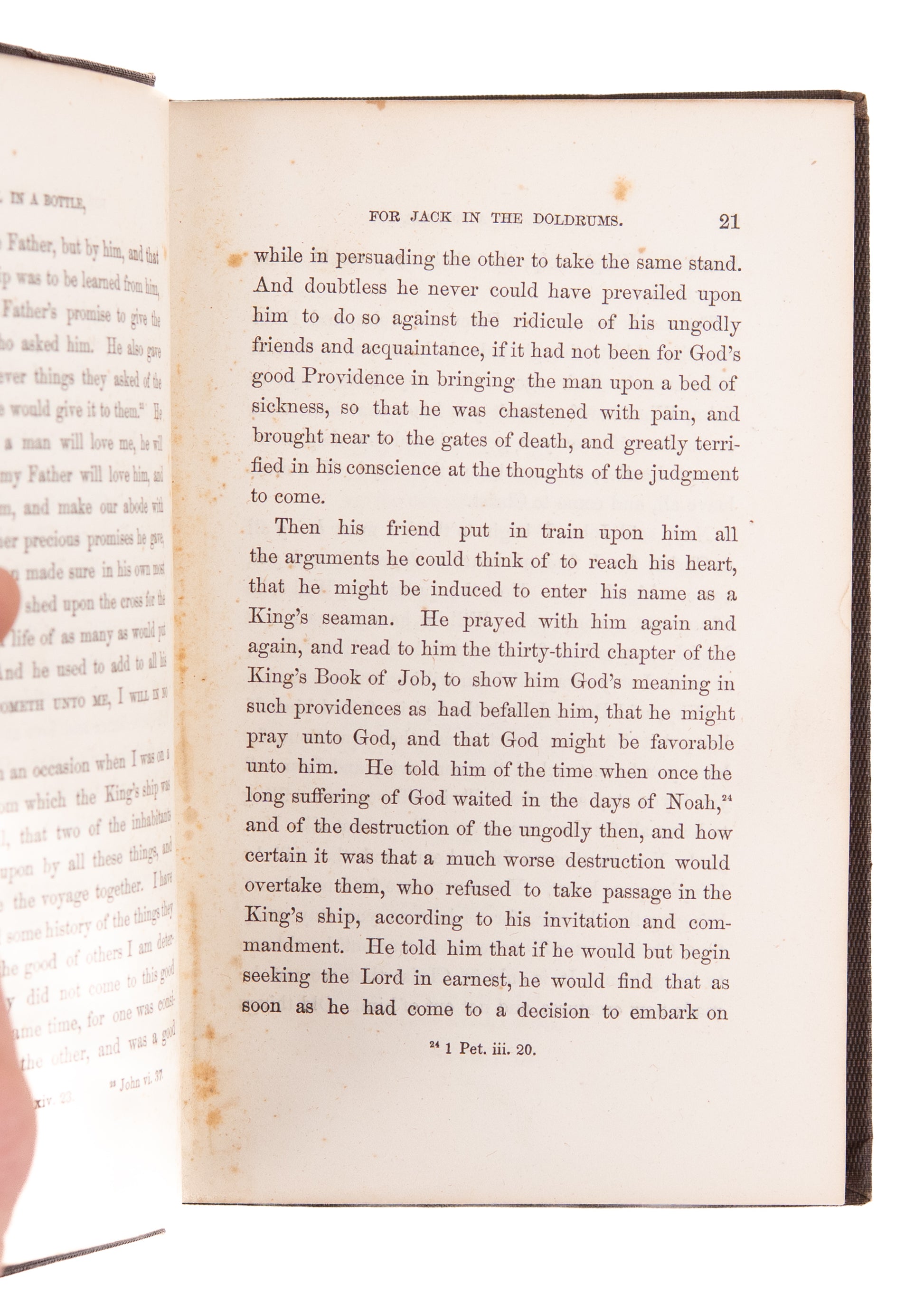 A rather scarce title by Henry T. Cheever, author of The Whale and His Captors and Life in the Sandwich Islands, in which he takes the the immortal tale of John Bunyan, Pilgrim's Progress, and adapts it to seamen by making it a voyage across the ocean to the Heavenly City. It is difficult not to hear Melville's old Father Mapple thundering in its pages. The present work was actually written in 1851, the author perhaps oblivious or borrowing inspiration from the Great White Whale himself.