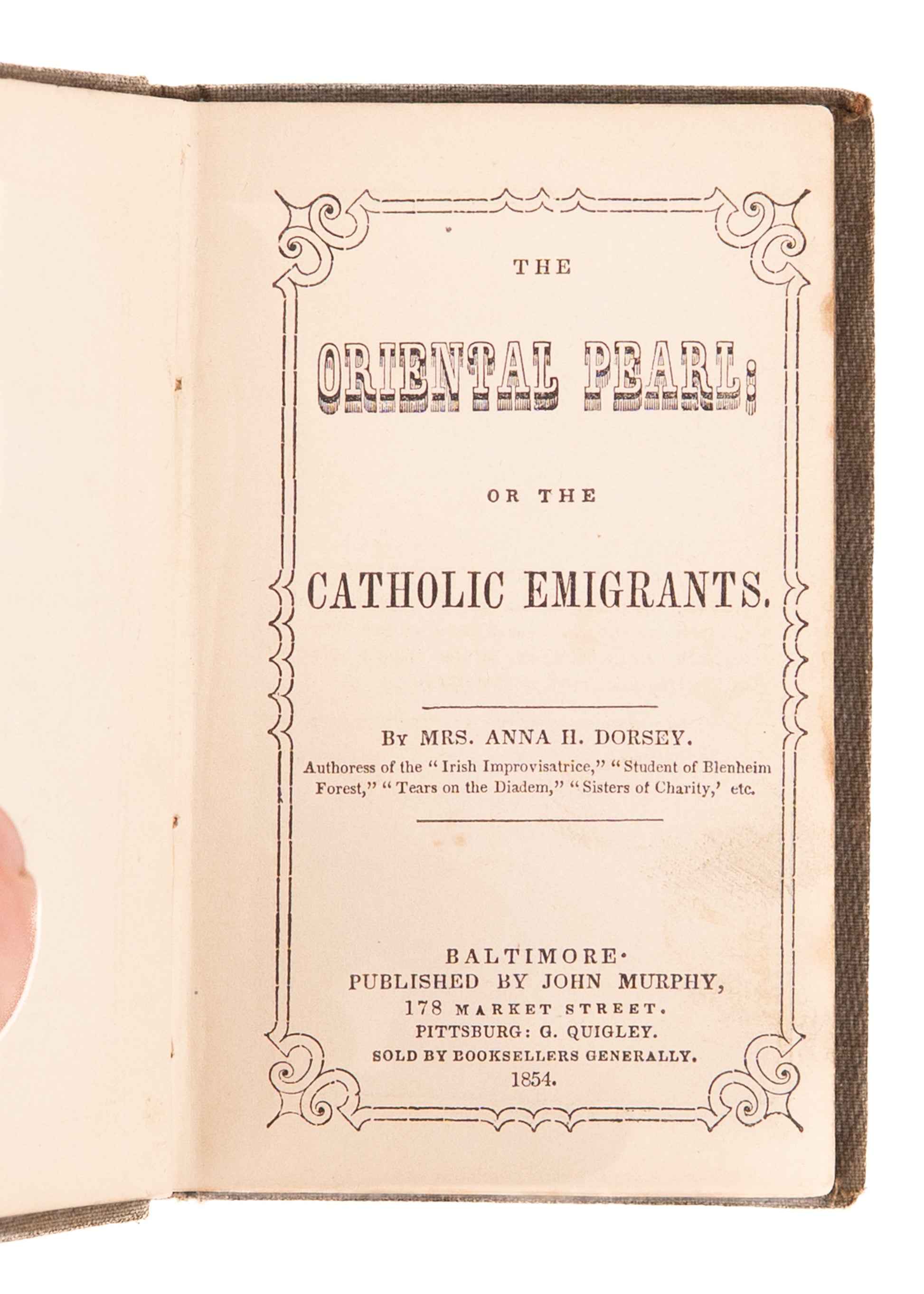 Dorsey, Anna H. The Oriental Pearl: or the Catholic Emigrants. By Mrs. Anna H. Dorsey. Authors of the "Irish Improvisatrice," "Student of Blenheim Forest," "Tears on the Diadem," "Sisters of Charity,' etc. Baltimore. Published by John Murphy. 1854. 163pp.