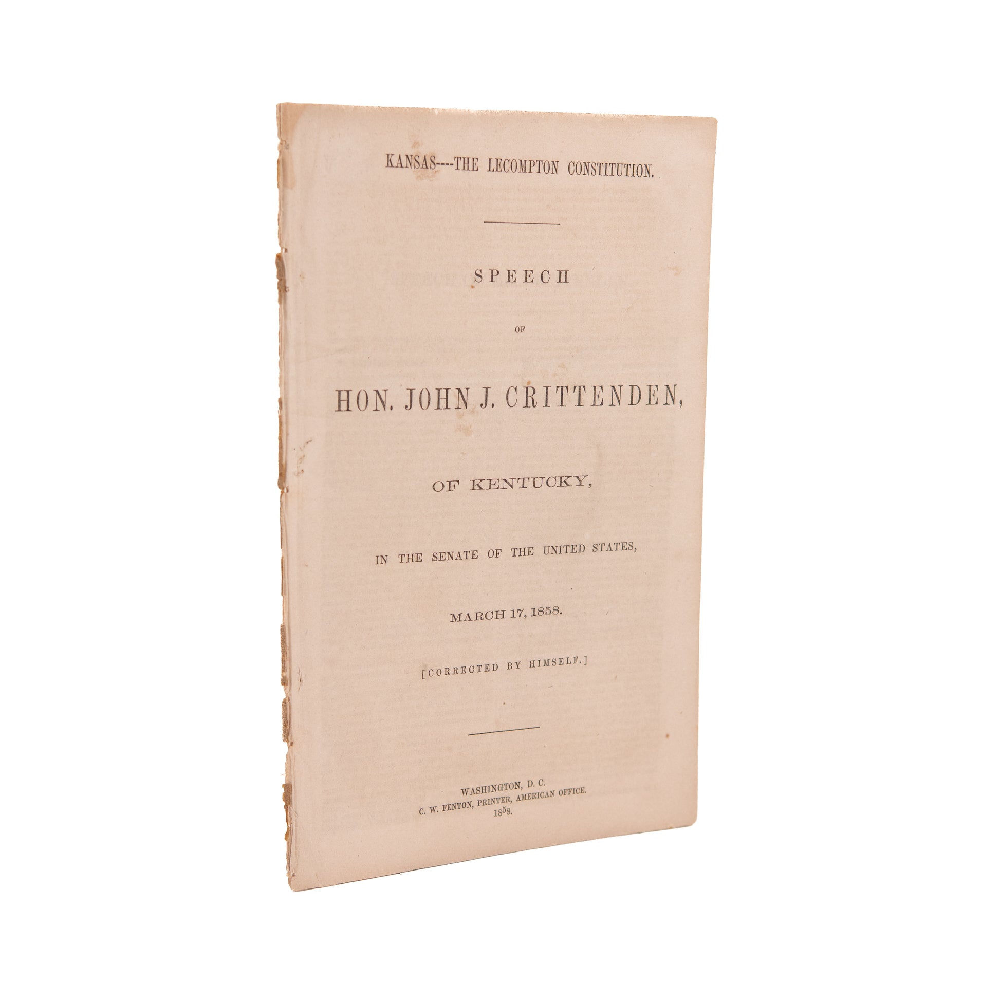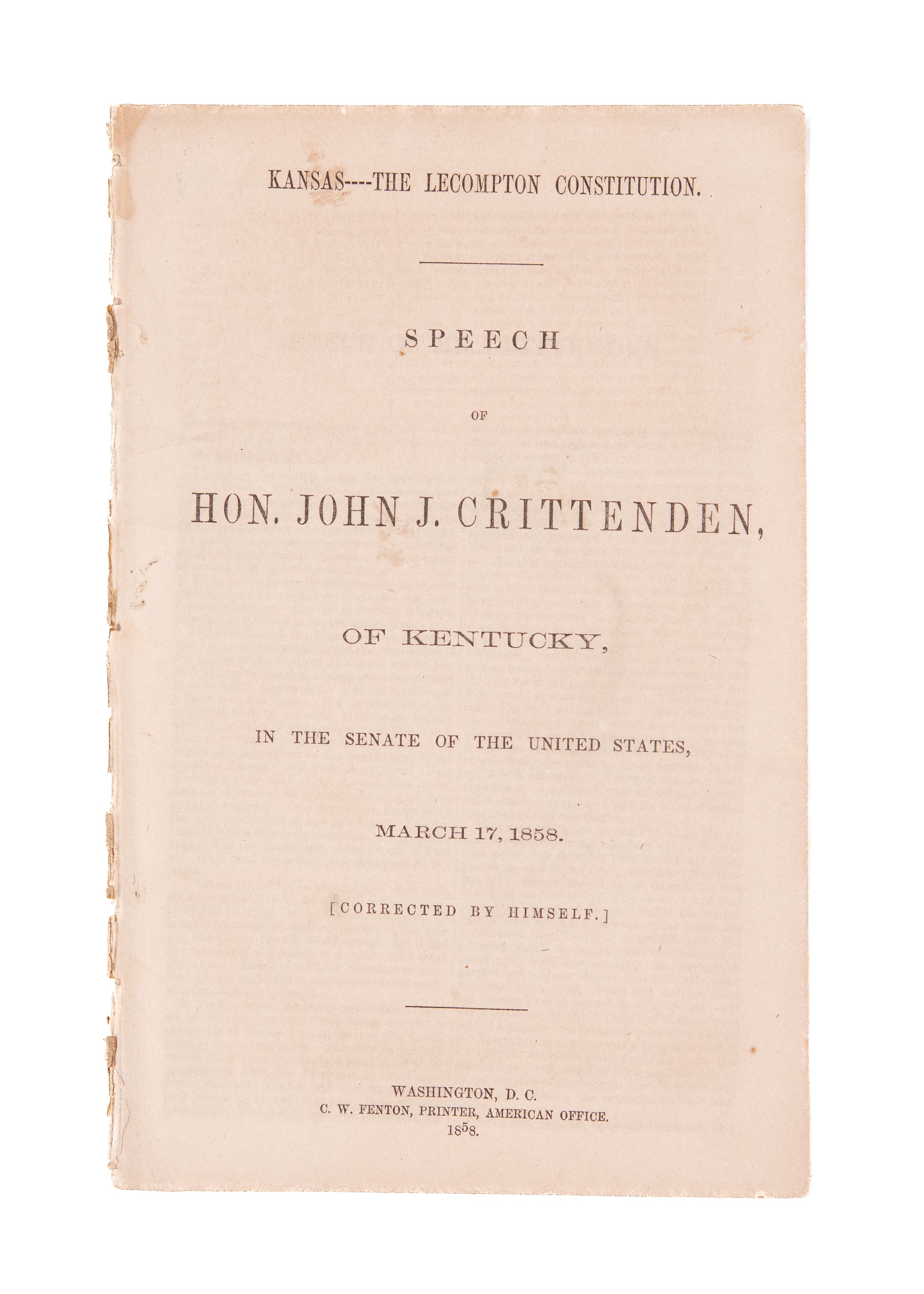 [Kansas - Lecompton Constitution - Slavery]. Kansas----The Lecompton Constitution. Speech of Hon. John J. Crittenden, of Kentucky, in the Senate of the United States, March 17, 1858. [Corrected by Himself.] Washington D. C. C. W. Fenton, Printer, American Office. 1858. 16pp