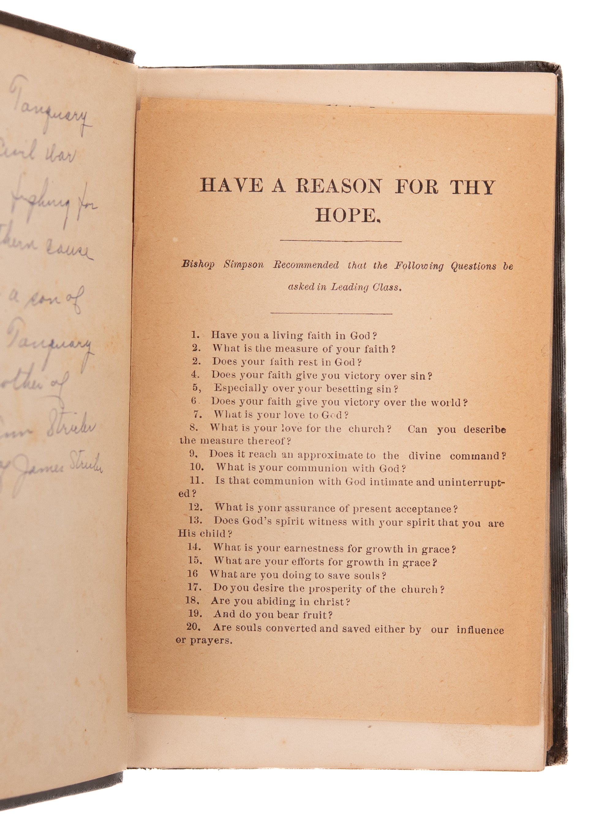 Simpson, Bishop Matthew. Have a Reason for Thy Hope. Bishop Simpson Recommended that the Following Questions be asked in Leading Class. [And] Earnest Inquiries after Your Spiritual State. No Publisher / Date. 2pp. c.1860-1865.