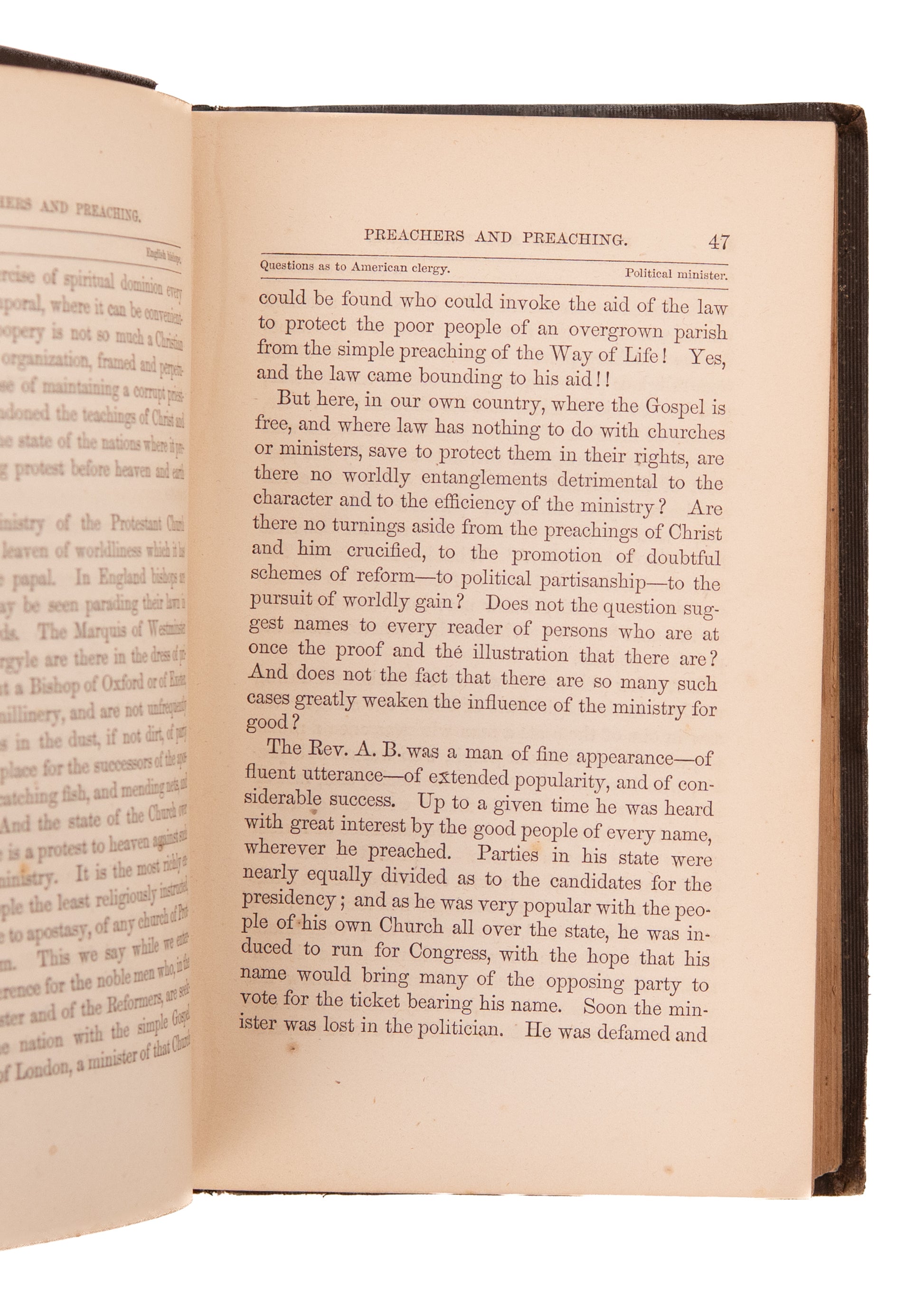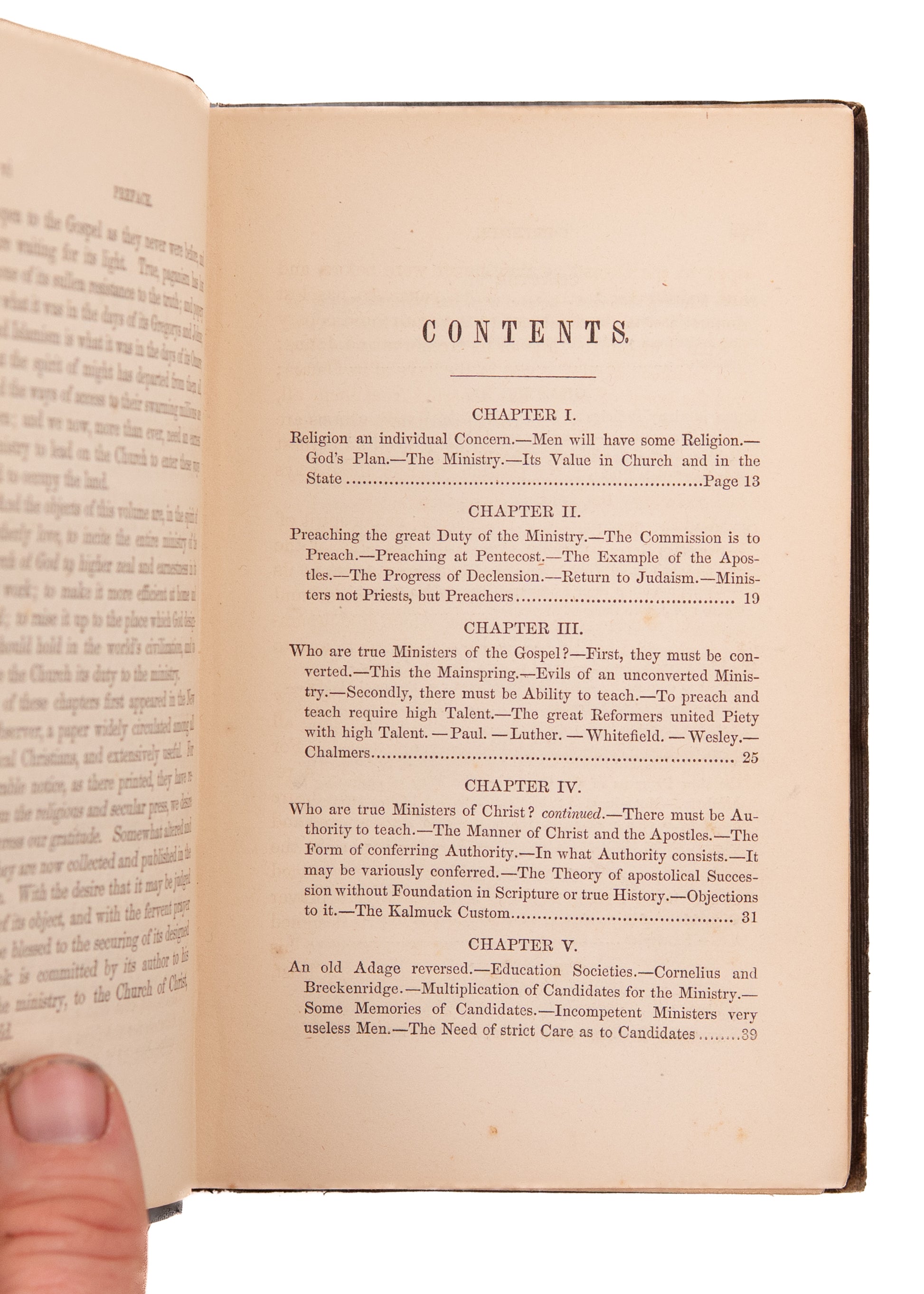 A rather rare little work on preaching by Nicholas Murray, dedicated to Gardiner Spring, and this copy with a fascinating provenance. Apparently looted as spoils of war by Reuben King Tanquary [1838-1908] of Company K in the 34th Indiana Infantry after the Battle at Jackson as part of the Vicksburg Campaign in 1863.