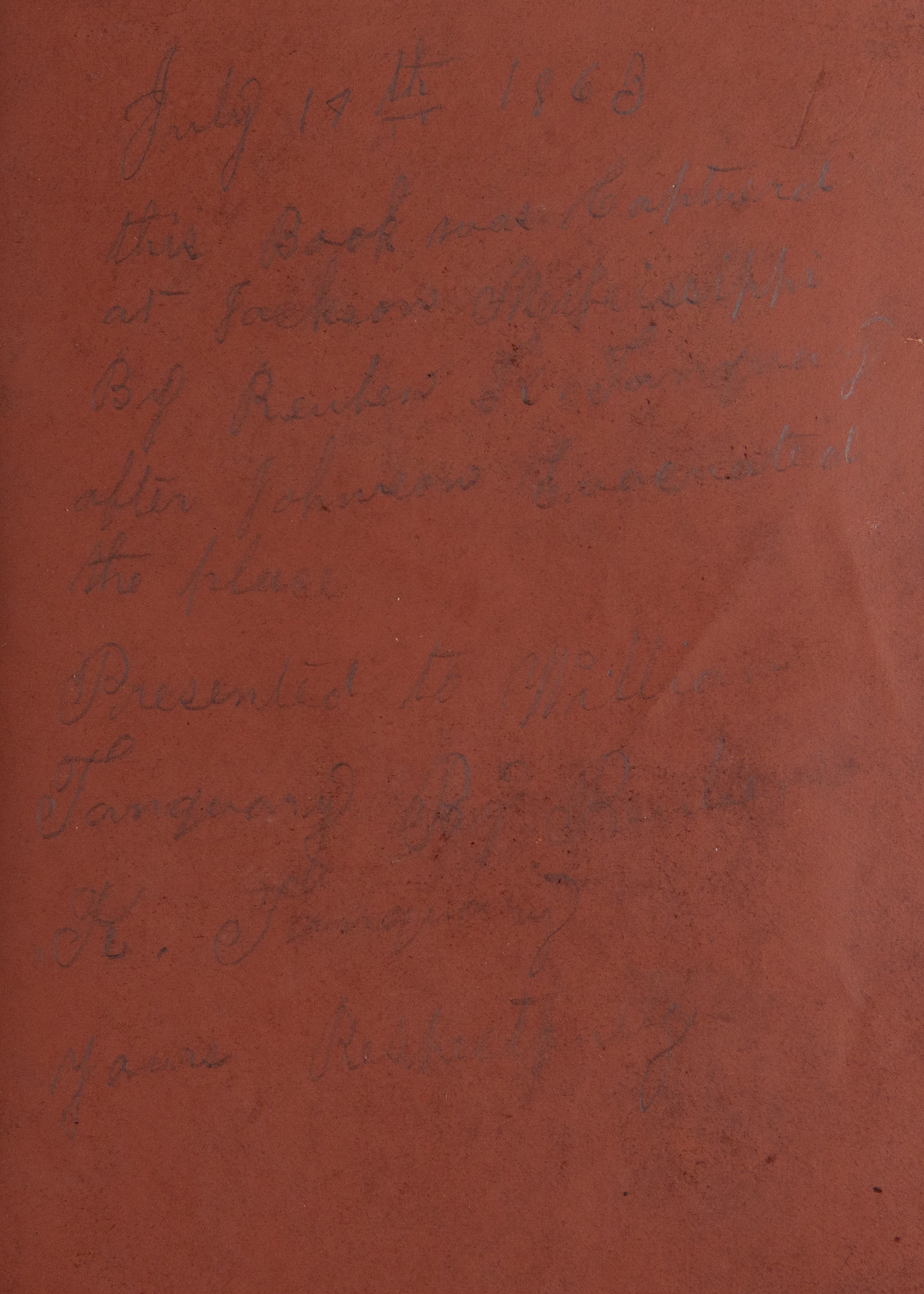This book was captured at Jackson Mississippi by Reuben Tanquary after Johnson evacuated the place. Presented to William Tanquaray by Reuben K. Tanquary. Yours respectfully."