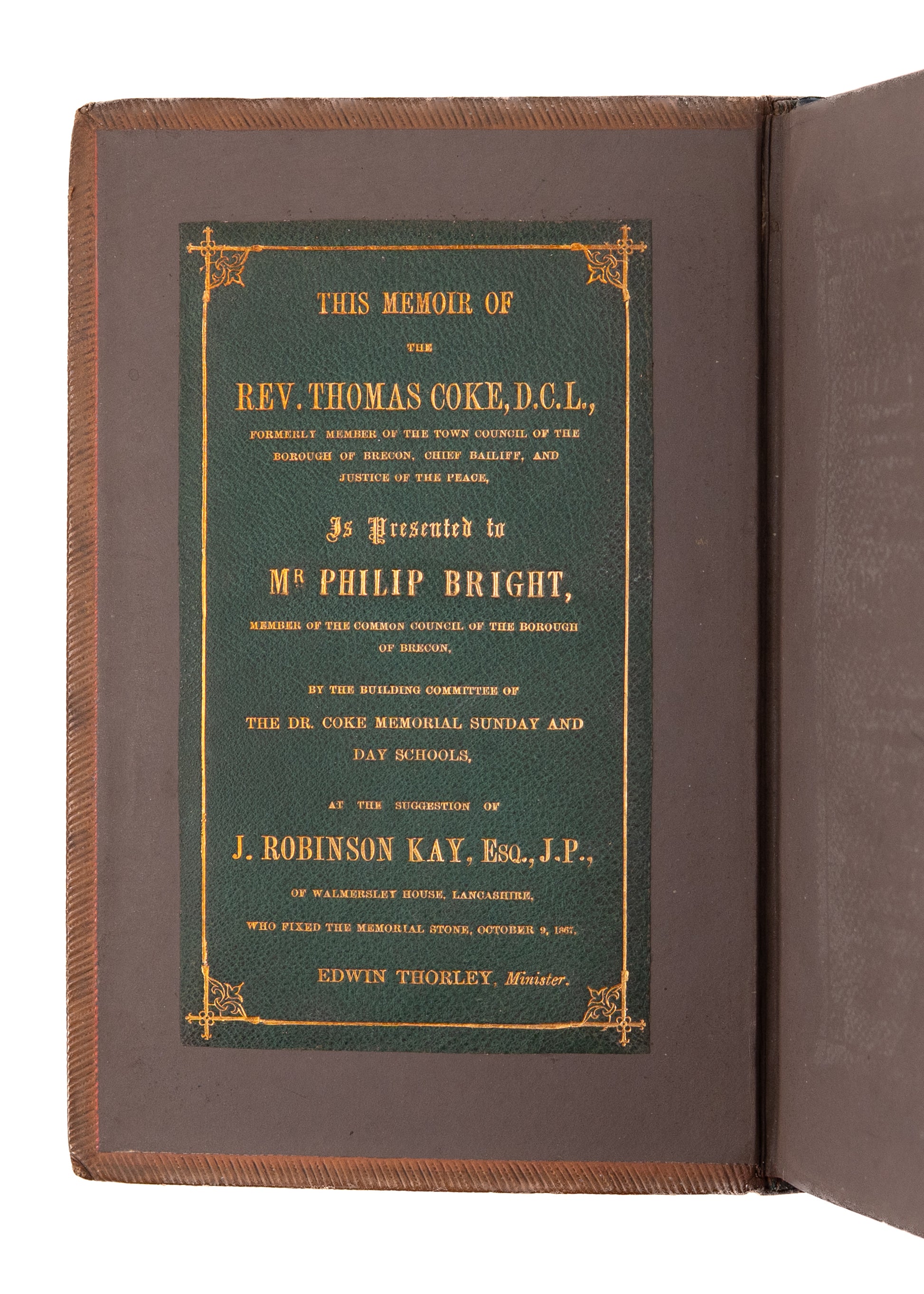 Bears a fine morocco presentation onlay to the pastedown, presenting the volume to Mr. Philip Bright, member of the Common Council of the Borough of Brecon where Thomas Coke had been a member of the town Council and acted as Justice of the Peace. The presentation was made by the building committee of the Dr. Thomas Coke Memorial Sunday and Day Schools.