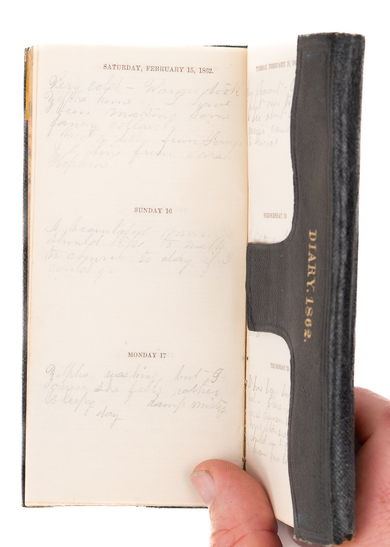 1862 appears to be by the wife [with a newborn] and 1865 by the husband of the same. The diaries’ owners are from somewhere in Cuyahoga County, Ohio with mentions of travels to Akron, Cleveland, Cincinnati, Solon, The Falls, Ridgeville, Bedford, etc., seemingly for the husband’s employment.