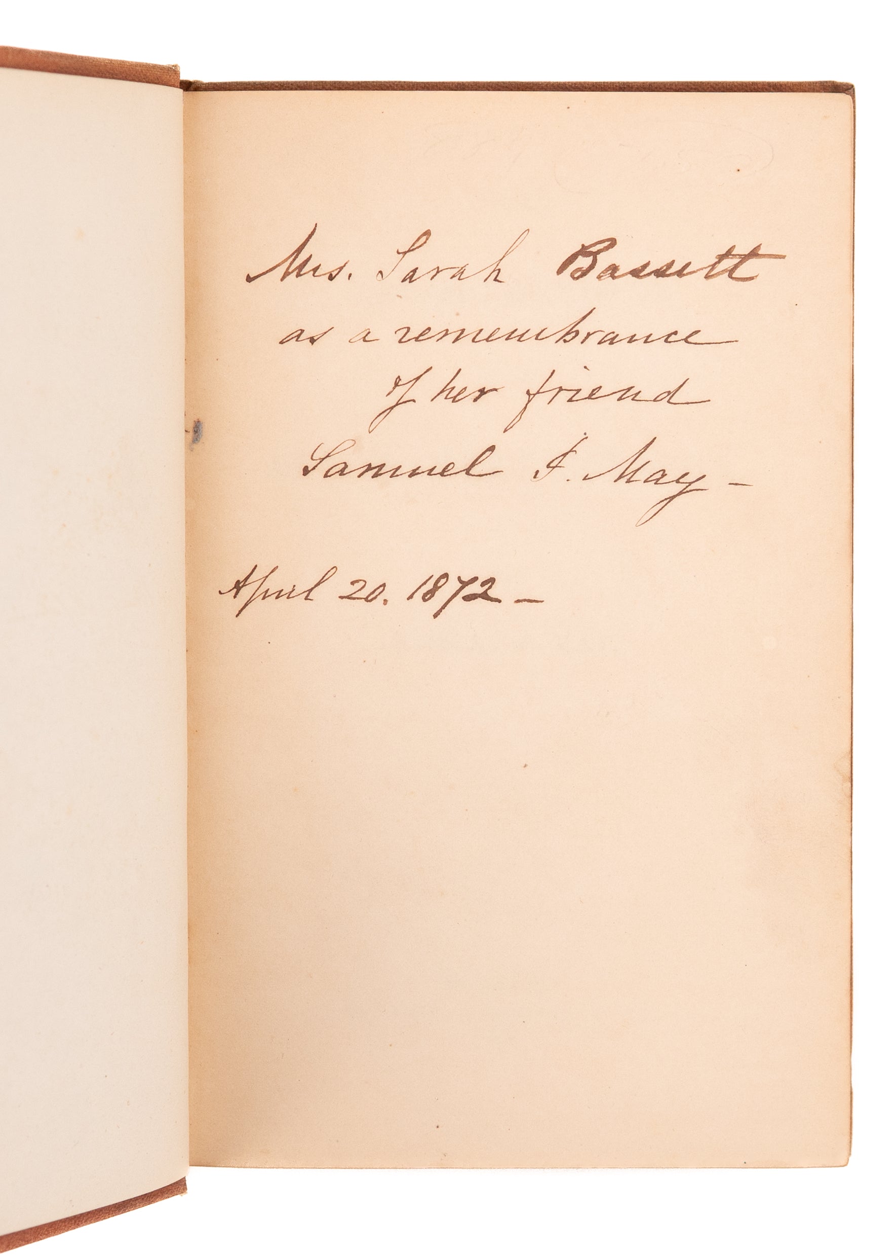 Good + in original cloth, faded and rubbed, but solid. Inscription on ffep, “Ms. Sarah Bassett as a remembrance of her friend Samuel J. May. April 20, 1872.” Blank rfep lacking. Else very solid and clean.