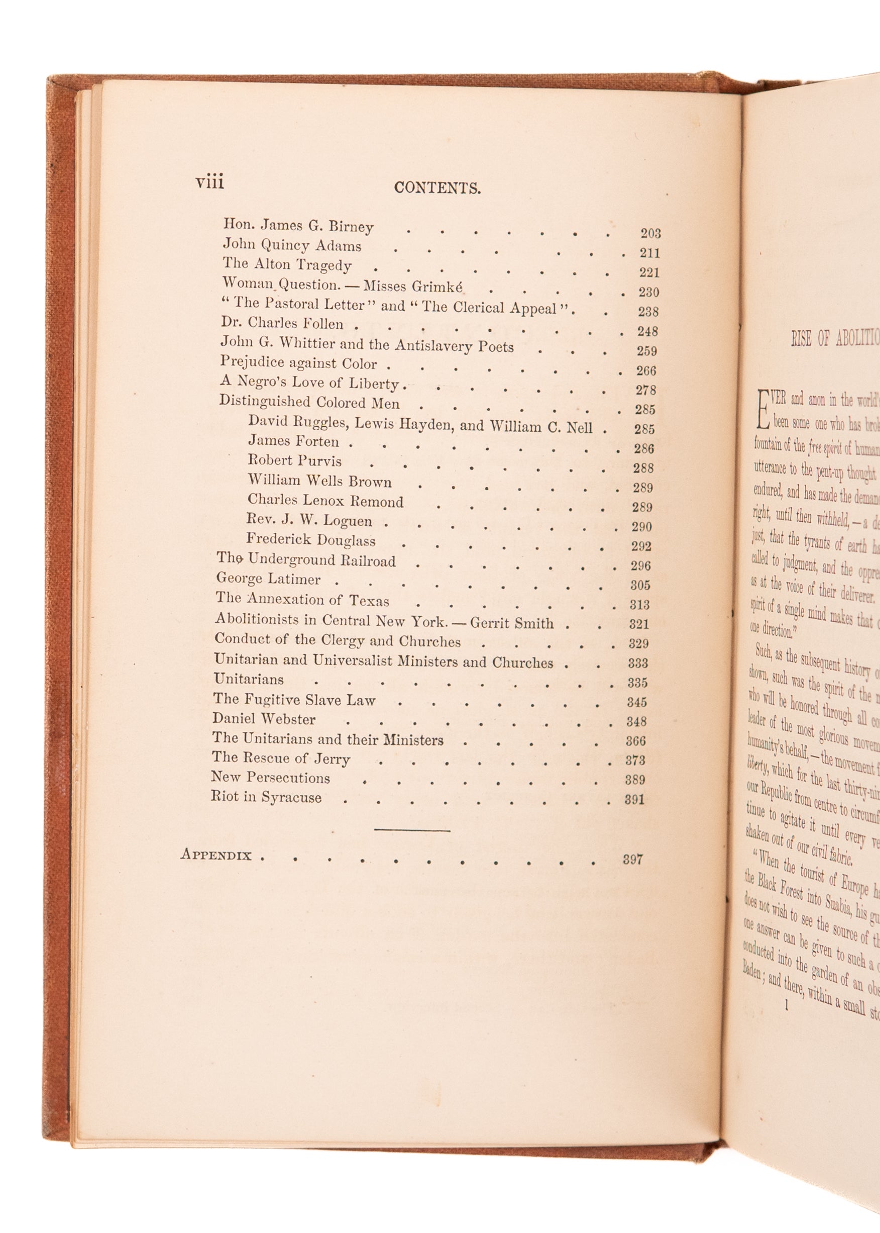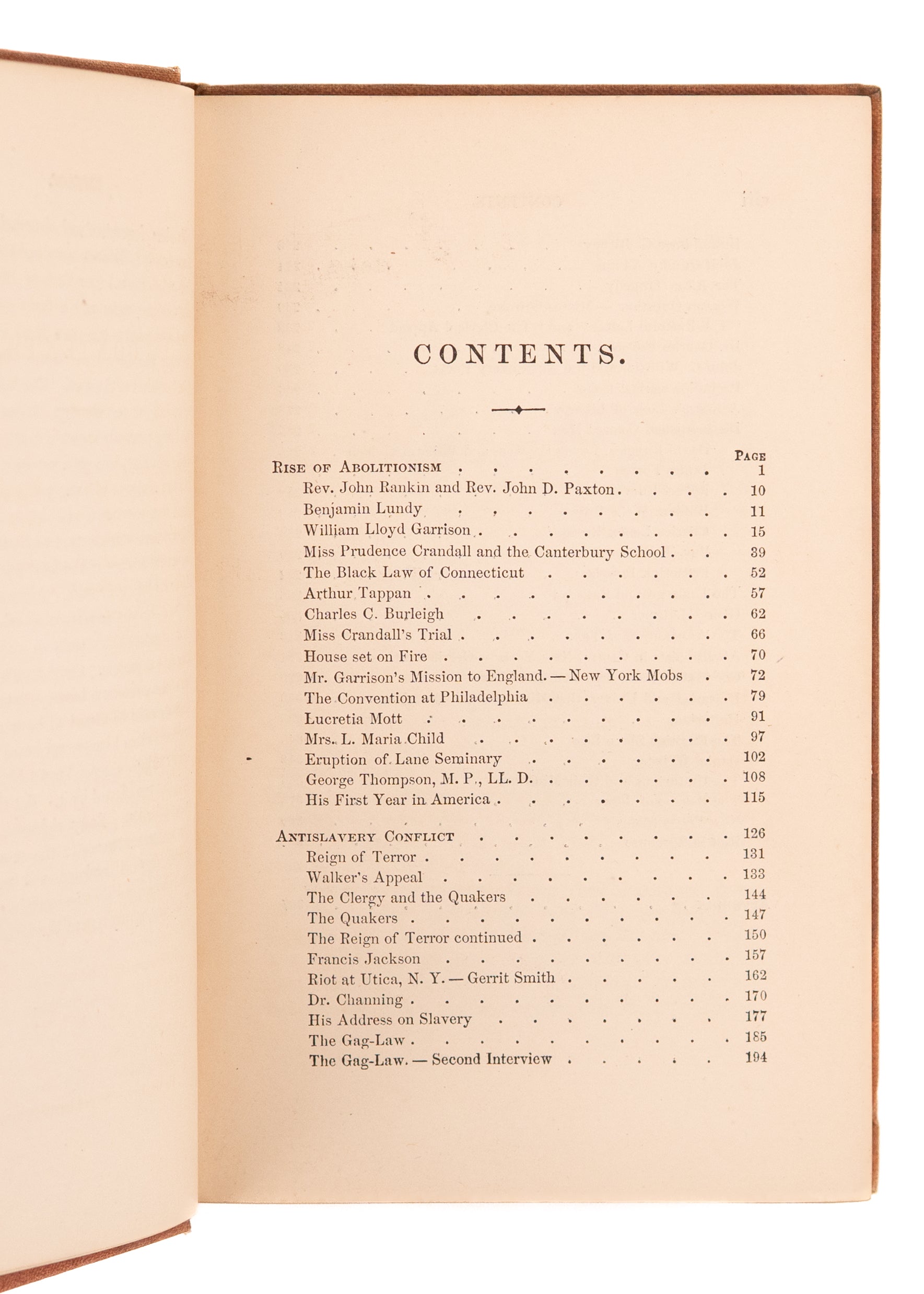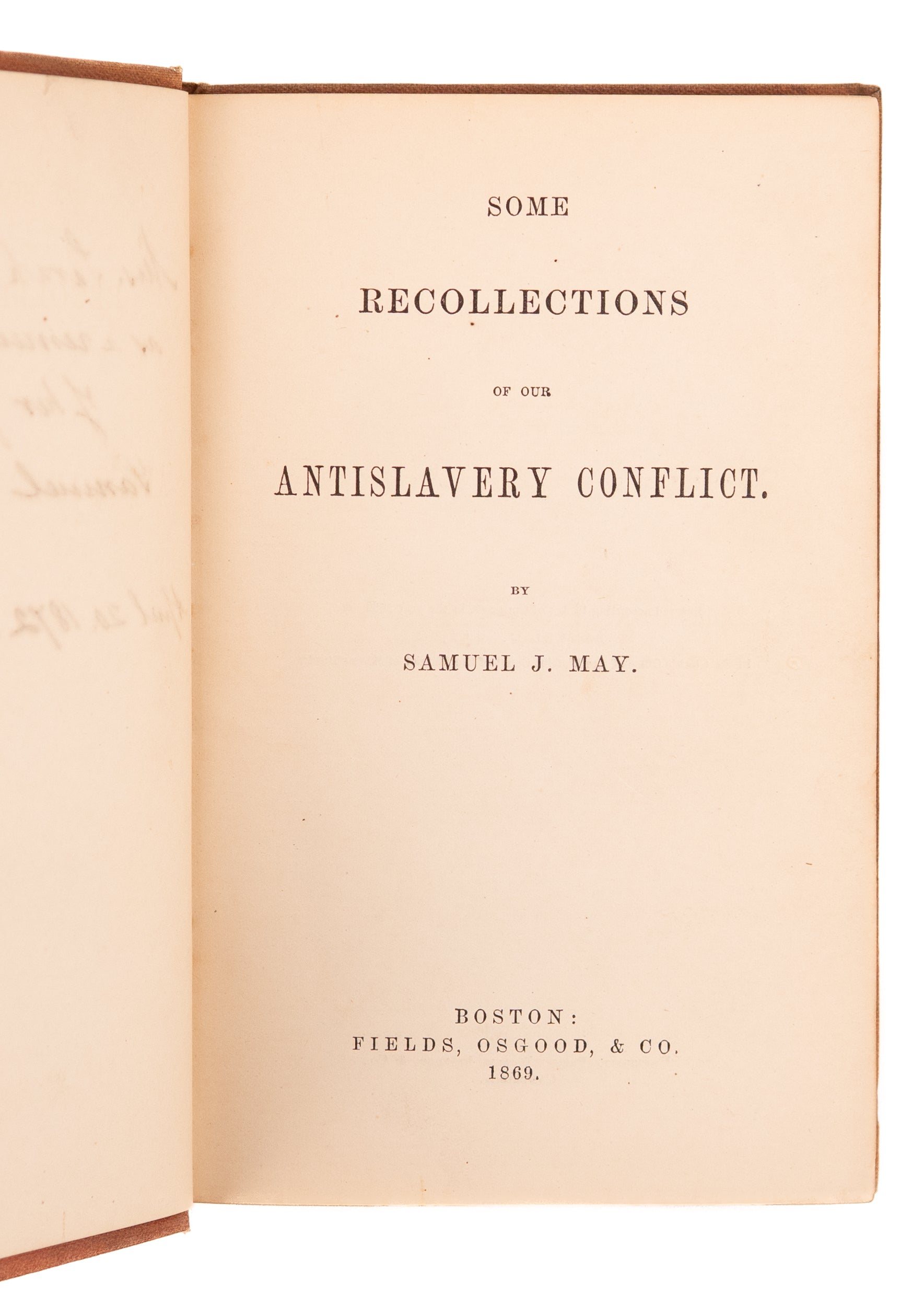 Superb first-hand history of the whole range of the 19th century anti-slavery movement by one of its leading agents, Samuel Joseph May [b.1791]. His friendship with William Lloyd Garrison began in 1830, and their partnership was fruitful. May assisted in drafting the constitutions for the New-England Anti-Slavery Society, the American Anti-Slavery Society, and was one of their founders. Originally a proponent of colonization, his defense of a “mixed race” boarding school in the State Legislature changed his view, and he was from then on for immediate and unequivocal emancipation and full citizenship of the enslaved.