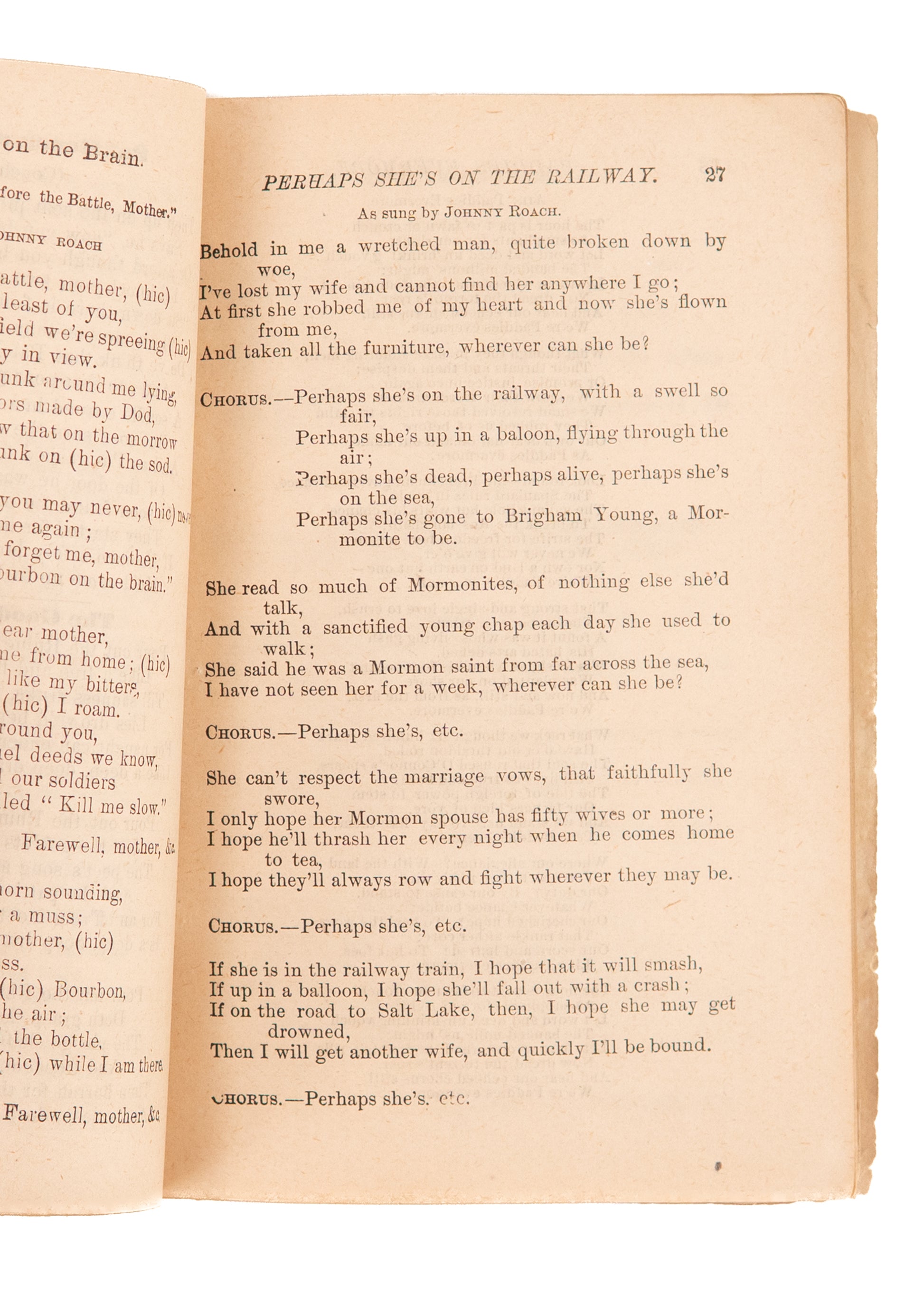 Includes: The Gin Mill; New York Society; Panama; The Orphan Boy; Bourbon on the Brain; Perhaps She's on the Railway [about a guy whose wife has left him to become a Mormon and one of Brigham Young's wives]; Paddies Evermore; Kilarney; The Hurdy Gurdy Lad; The Liquor Law; Can Any Vone Tole Vere Dot Cat is Gone? [in German vernacular]; Whiskey You're the Devil; Sauerkraut; etc.