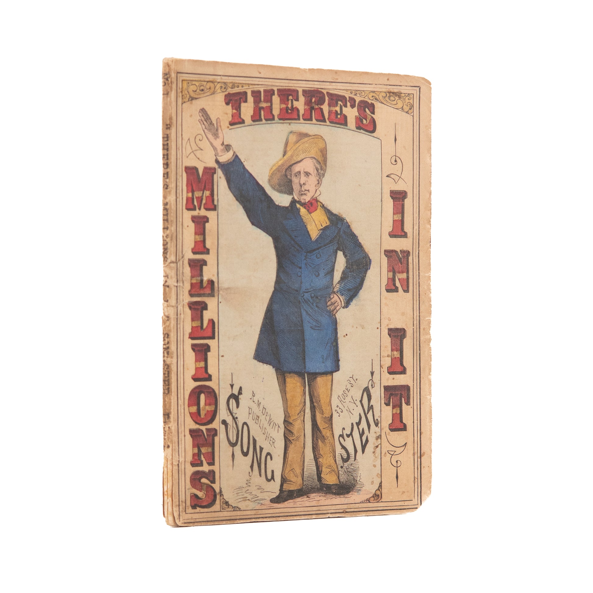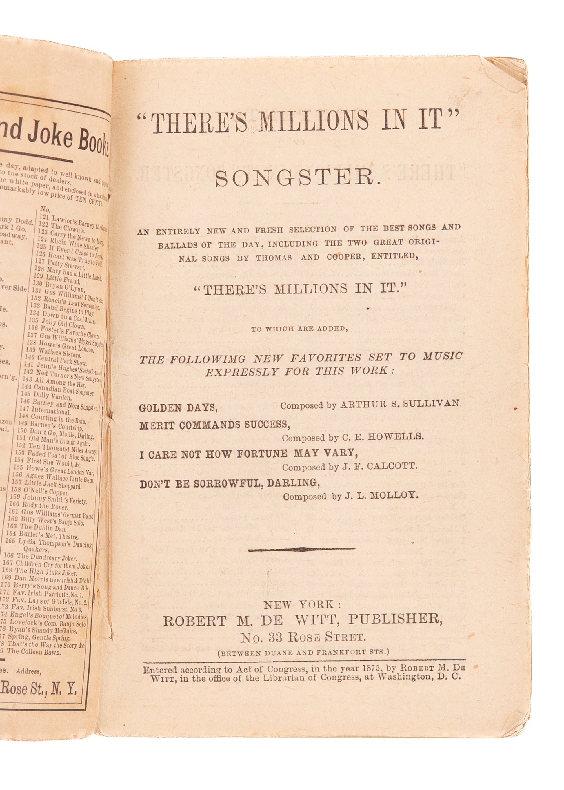 "There's Millions in It" Songster. An Entirely New and Fresh Selection of the Best Songs and Ballads of the Day, Including the Two Great Original Songs by Thomas and Cooper, Entitled, "There's Millions in It." To which are added, The Following New Favorites Set to Music Expressly for this Work: Golden Days by Arthur Seymour Sullivan [Sir Arthur Sullivan]; Merit Commands Success by C. E. Howells; I Care not How Fortune May Vary by J. F. Calcott; and Don't be Sorrowful Darling by J. L. Molloy. New York. Robert M. De Witt, Publisher. 1875. 64pp + wraps.