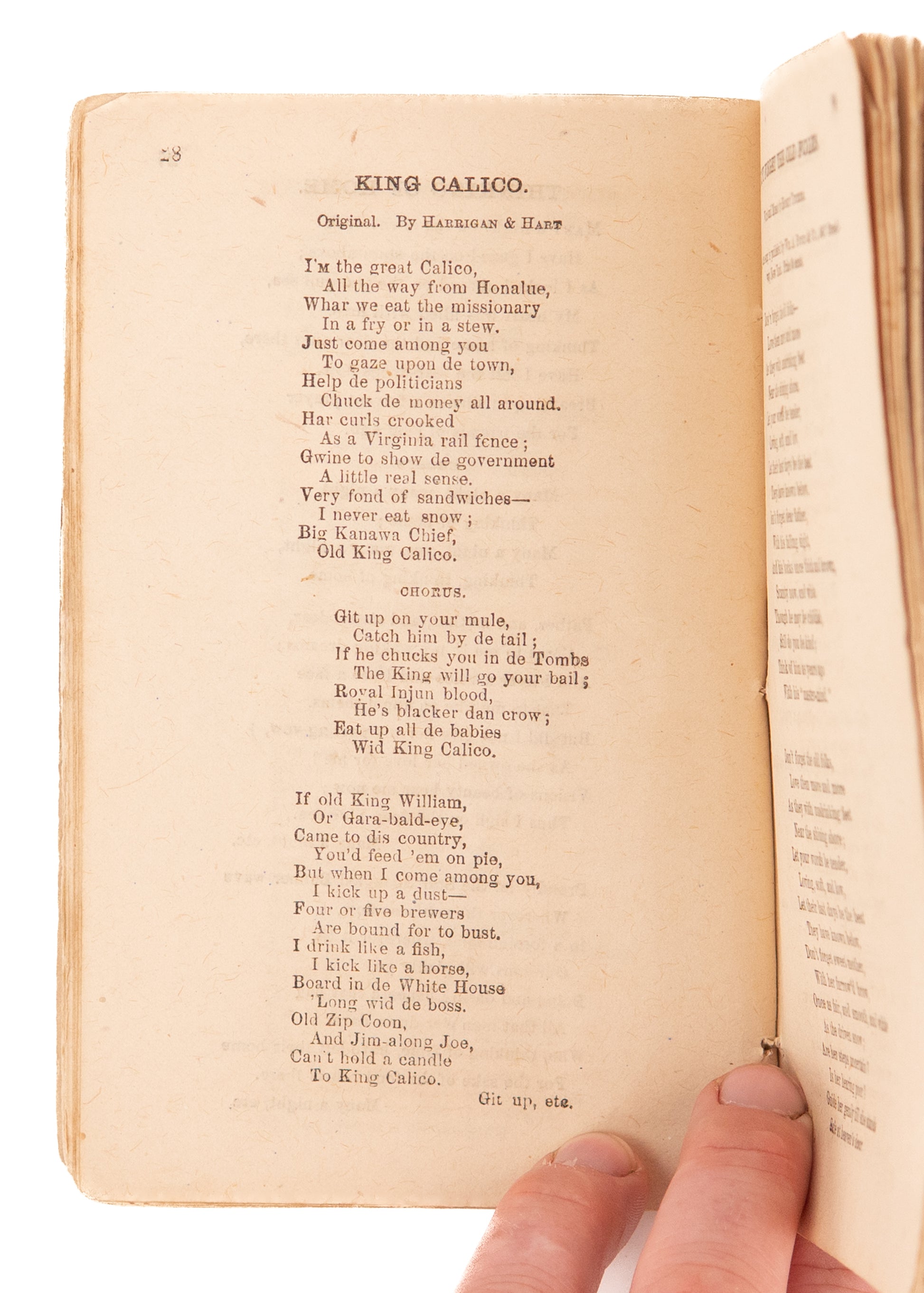 Contains Molly My Darling Come Over the Sea; Skidmore Guard [on "Colored Troops" during the Civil War]; De Waiter Gal [written with German accented spelling]; The American Banner; Dat Pooty Deitcher Gal; The Days when the Old N***er was Young; King Calico [on Hawaii, Honalue, i.e. Honolulu]; a rare illustrated advert for Sketches of Minstrel Life, etc.