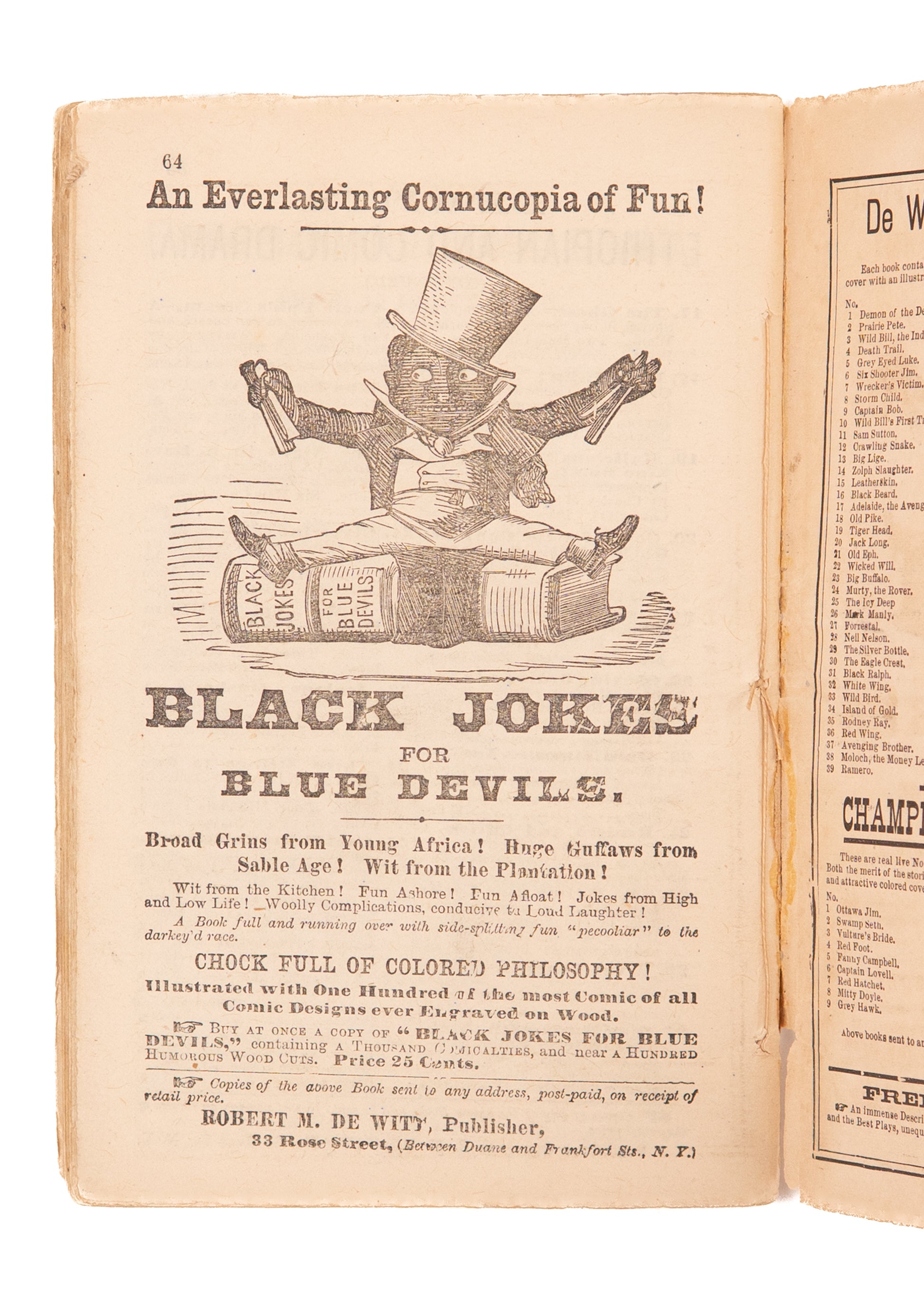 Exceptionally scarce songster by De Witt of New York. Beautifully lithographed cover, excellent bawdy and then "edgy" content, plus adverts for two black-centric works on minstrels, etc.,