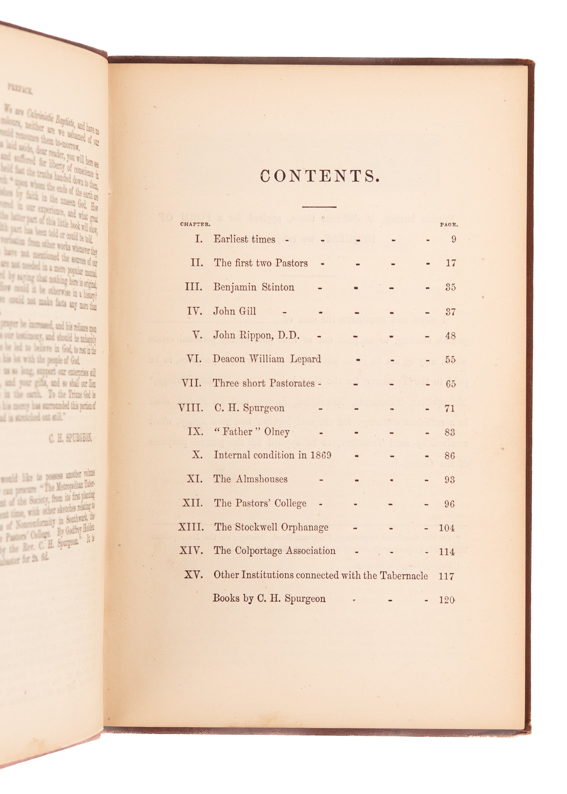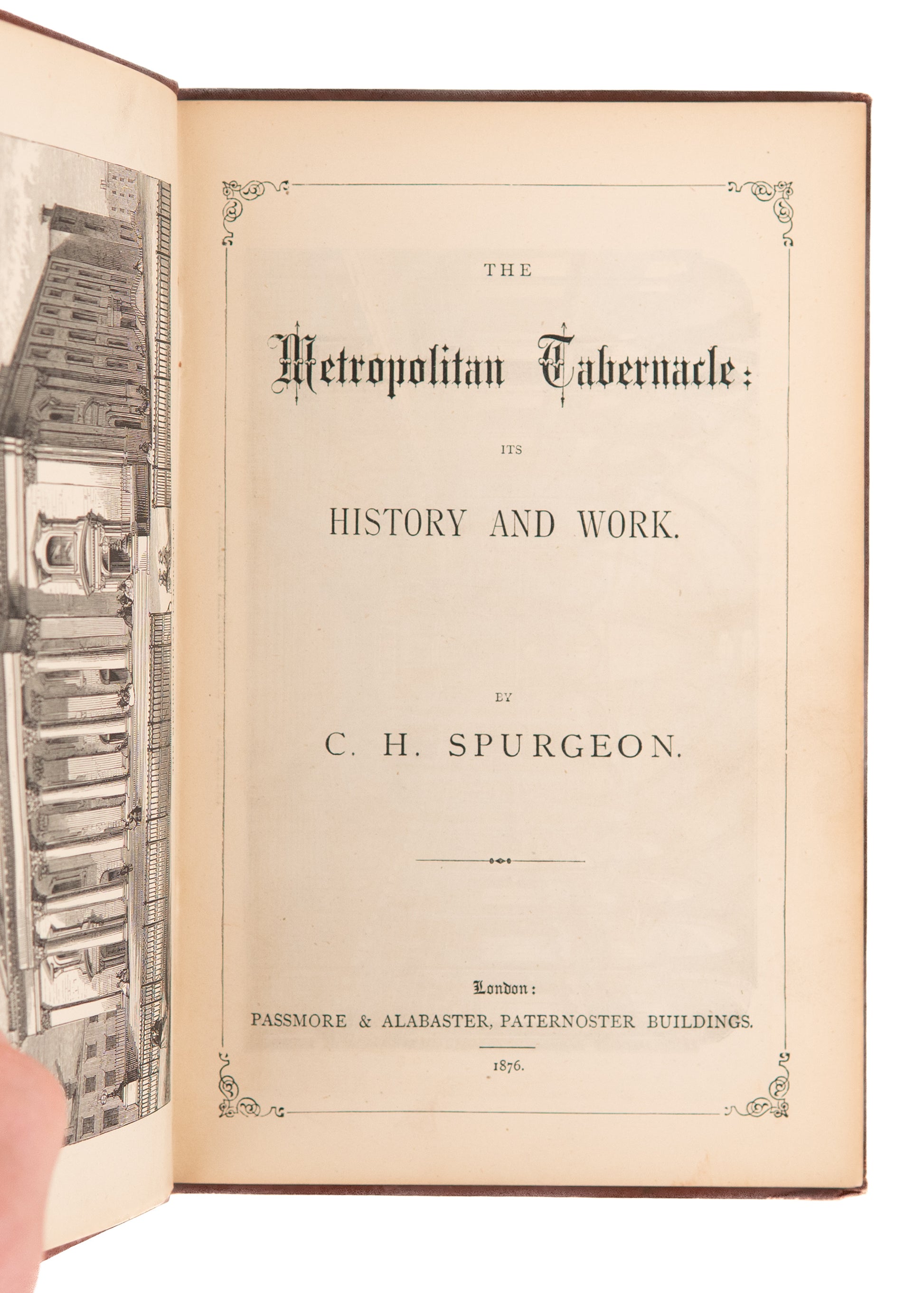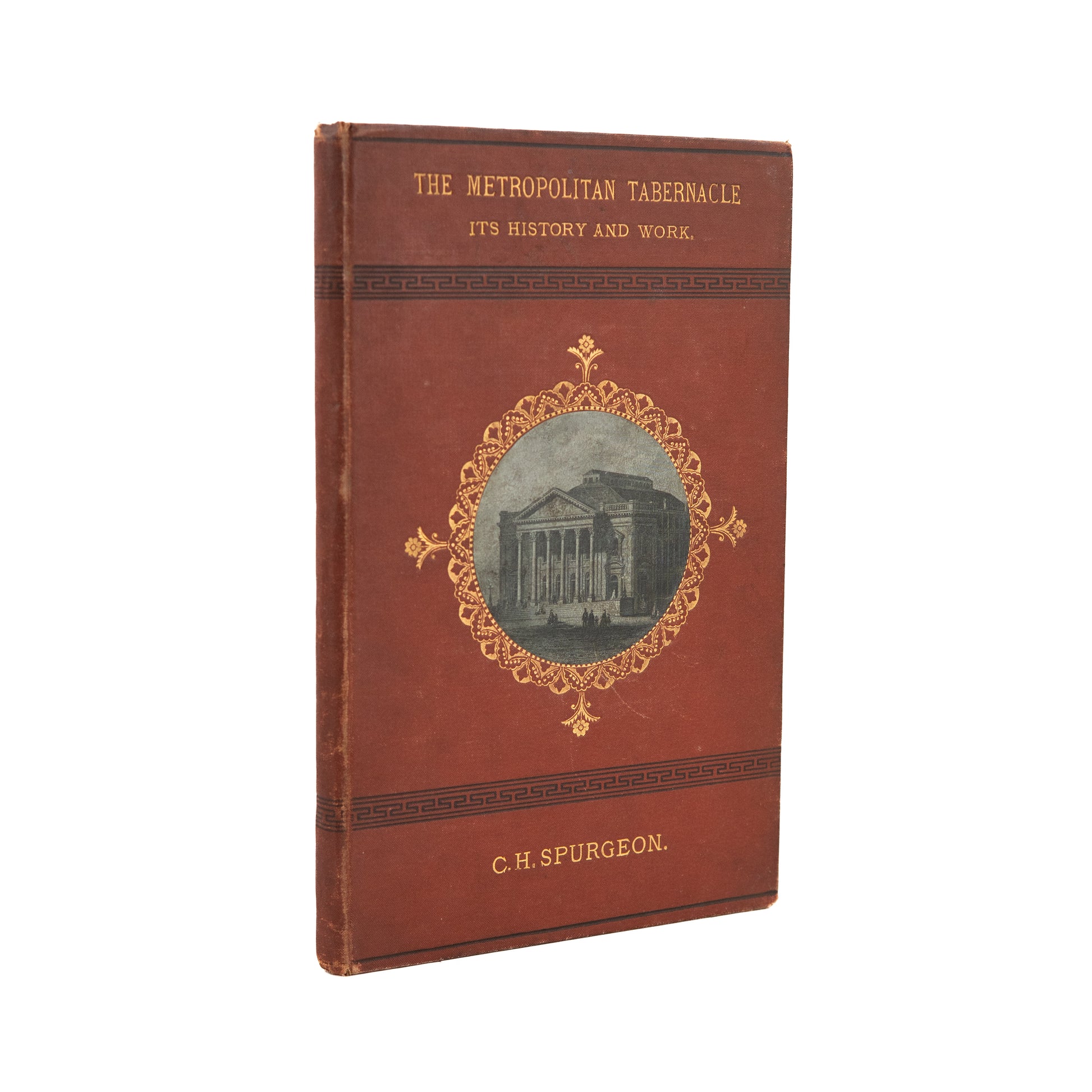 A very rare and handsomely preserved first edition of the Spurgeon's history of The Metropolitan Tabernacle, tracing its roots to the early Baptist movements, through John Gill, etc., Illustrated throughout, and still retaining it's lithographed front board onlay of the Tabernacle, which is often lacking or badly rubbed.