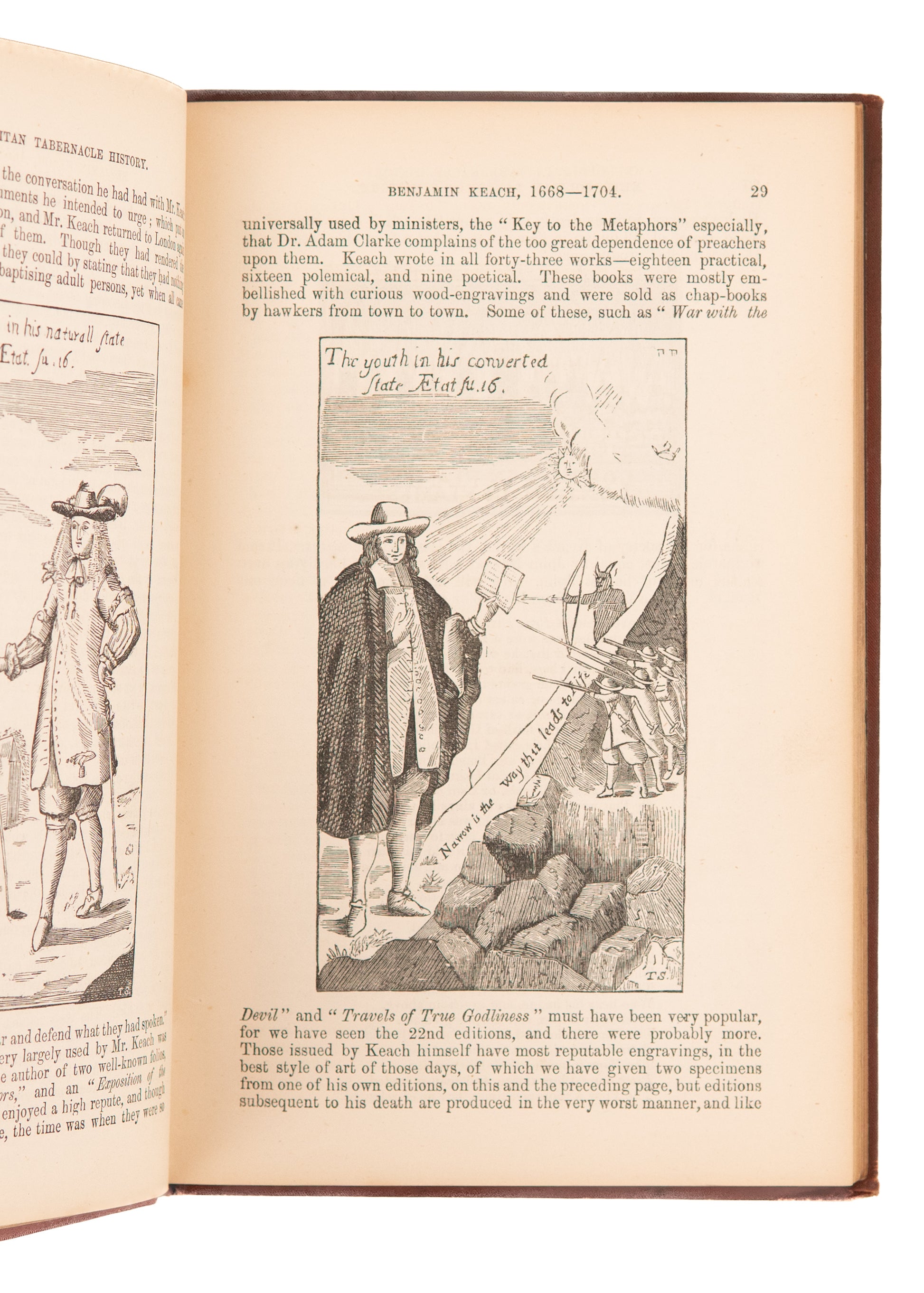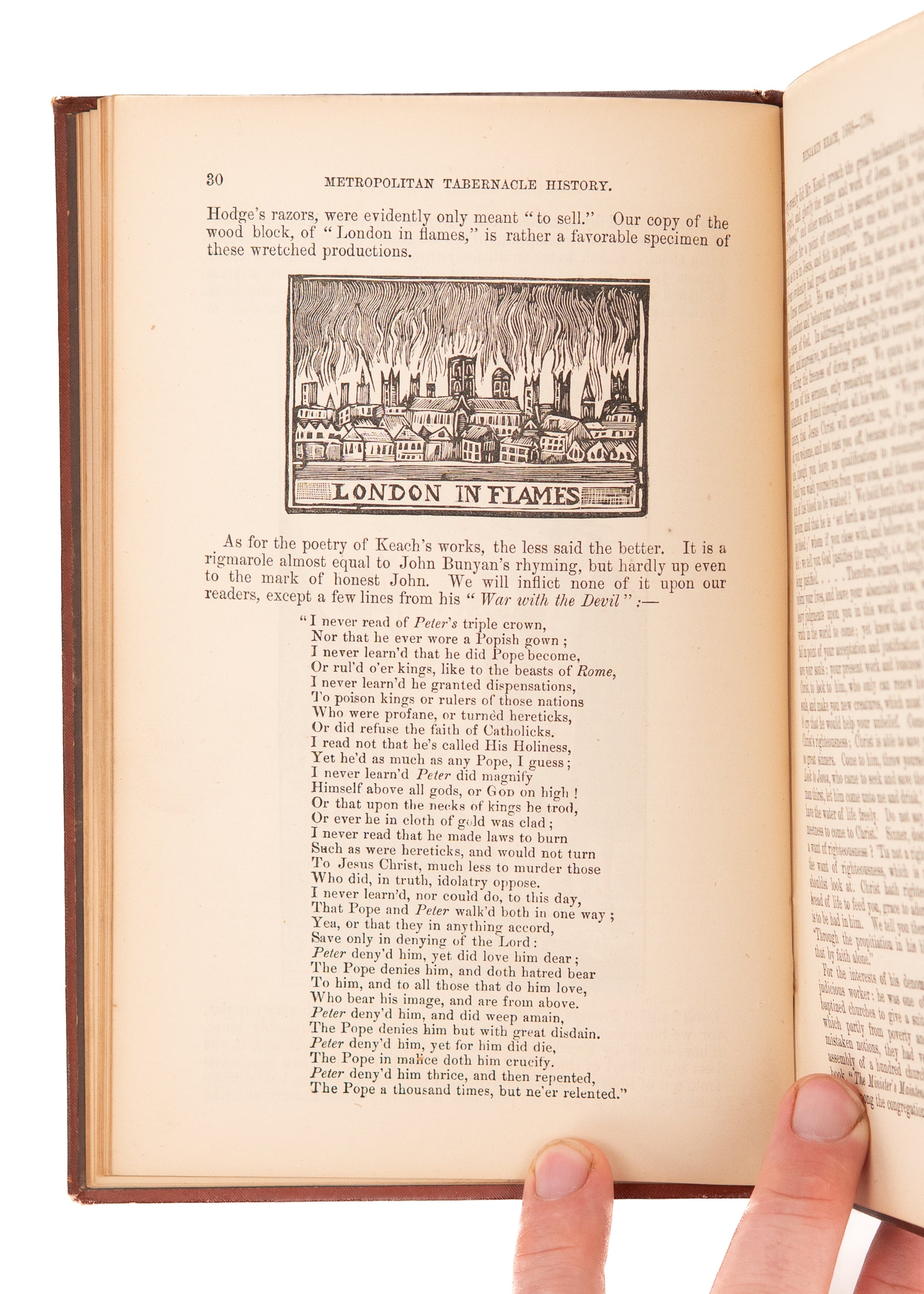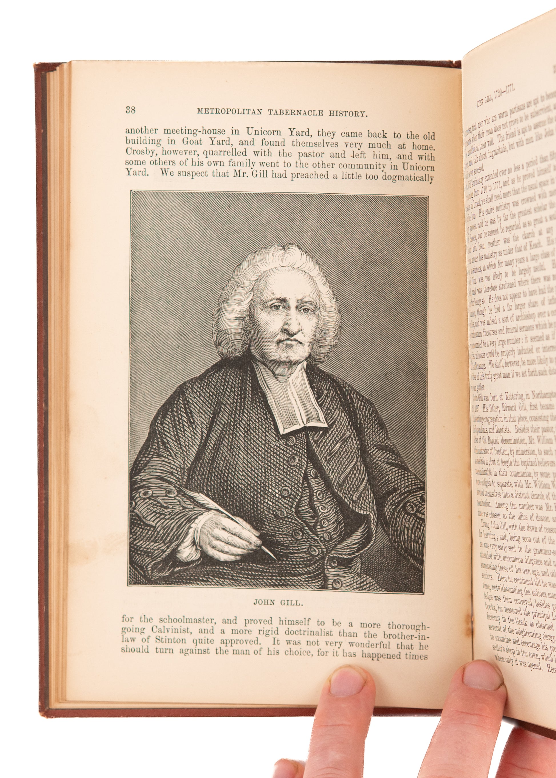 A very rare and handsomely preserved first edition of the Spurgeon's history of The Metropolitan Tabernacle, tracing its roots to the early Baptist movements, through John Gill, etc., Illustrated throughout, and still retaining it's lithographed front board onlay of the Tabernacle, which is often lacking or badly rubbed.