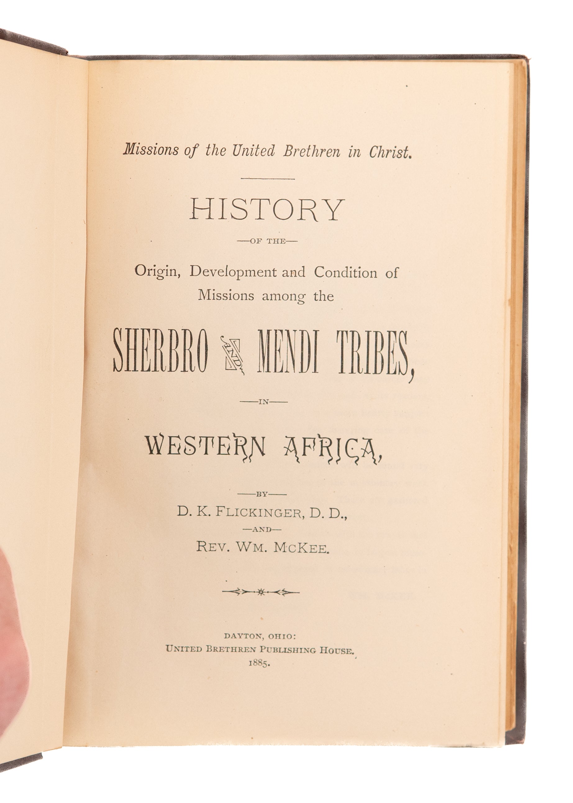 Flickinger, D. K. and McKee, Wm. Missions of the United Brethren in Christ. History of the Origin, Development and Condition of Missions among the Sherbro and Mendi Tribes in Western Africa. Dayton, Ohio. United Brethren Publishing House. 1885. 329pp.