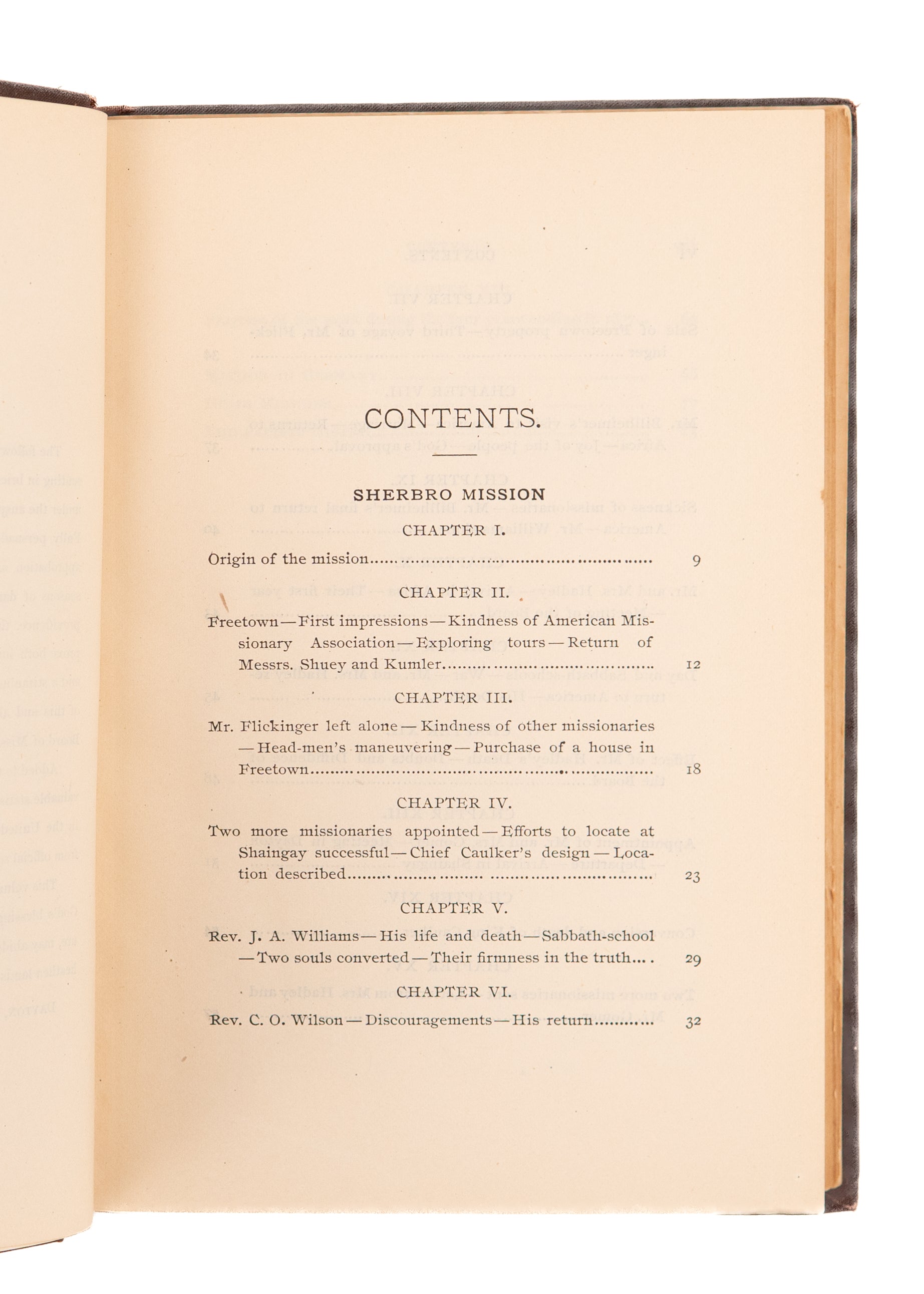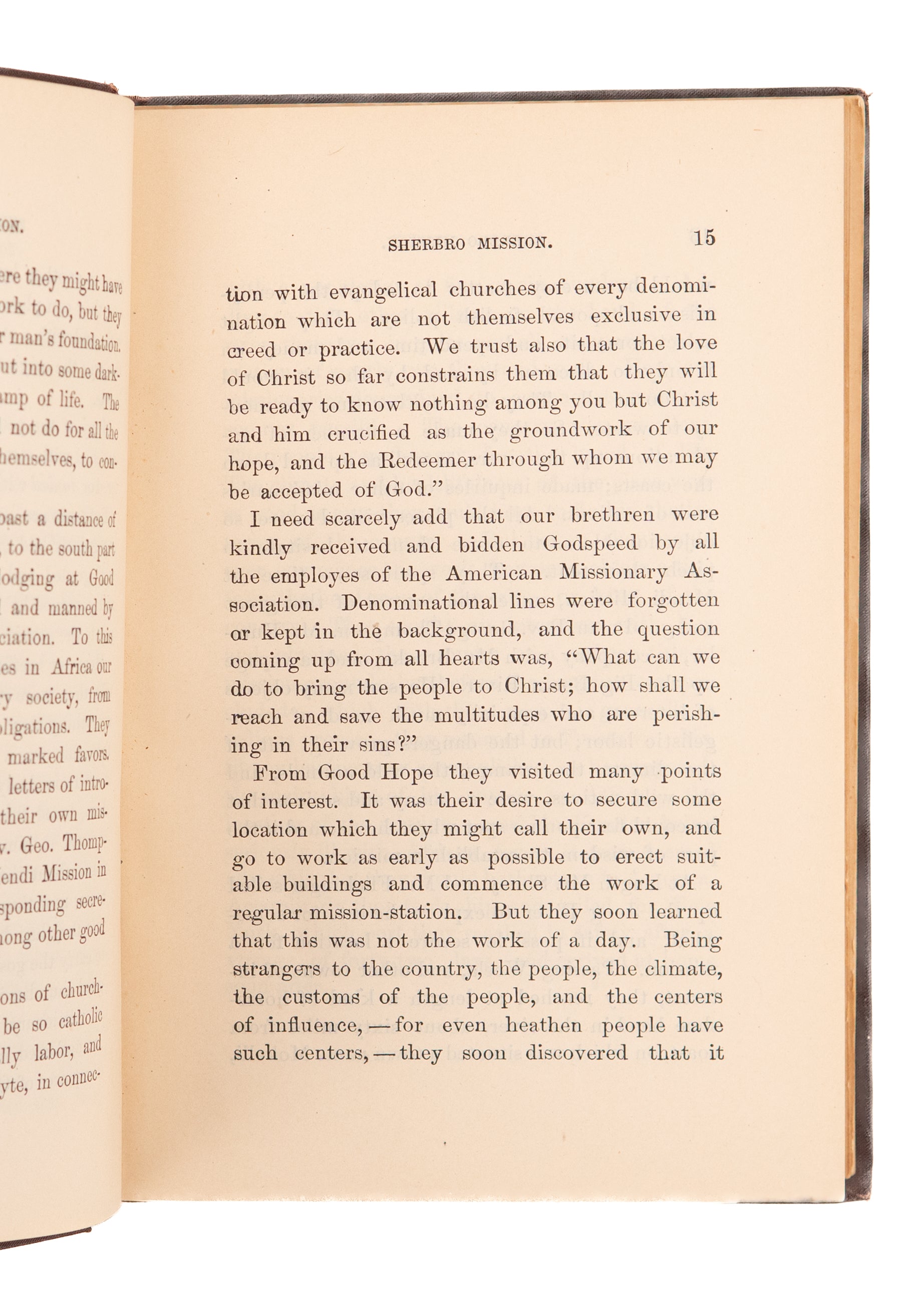 Very scarce work with none in the auction record and none in the trade regarding early missionary efforst among the Mendi [Mende] and Sherbro tribes of Sierra Leone, who were both significant forces in exporting Africans from the remainder of the continent to British and American slave traders. Nearly 100 references to slavery and the trade.