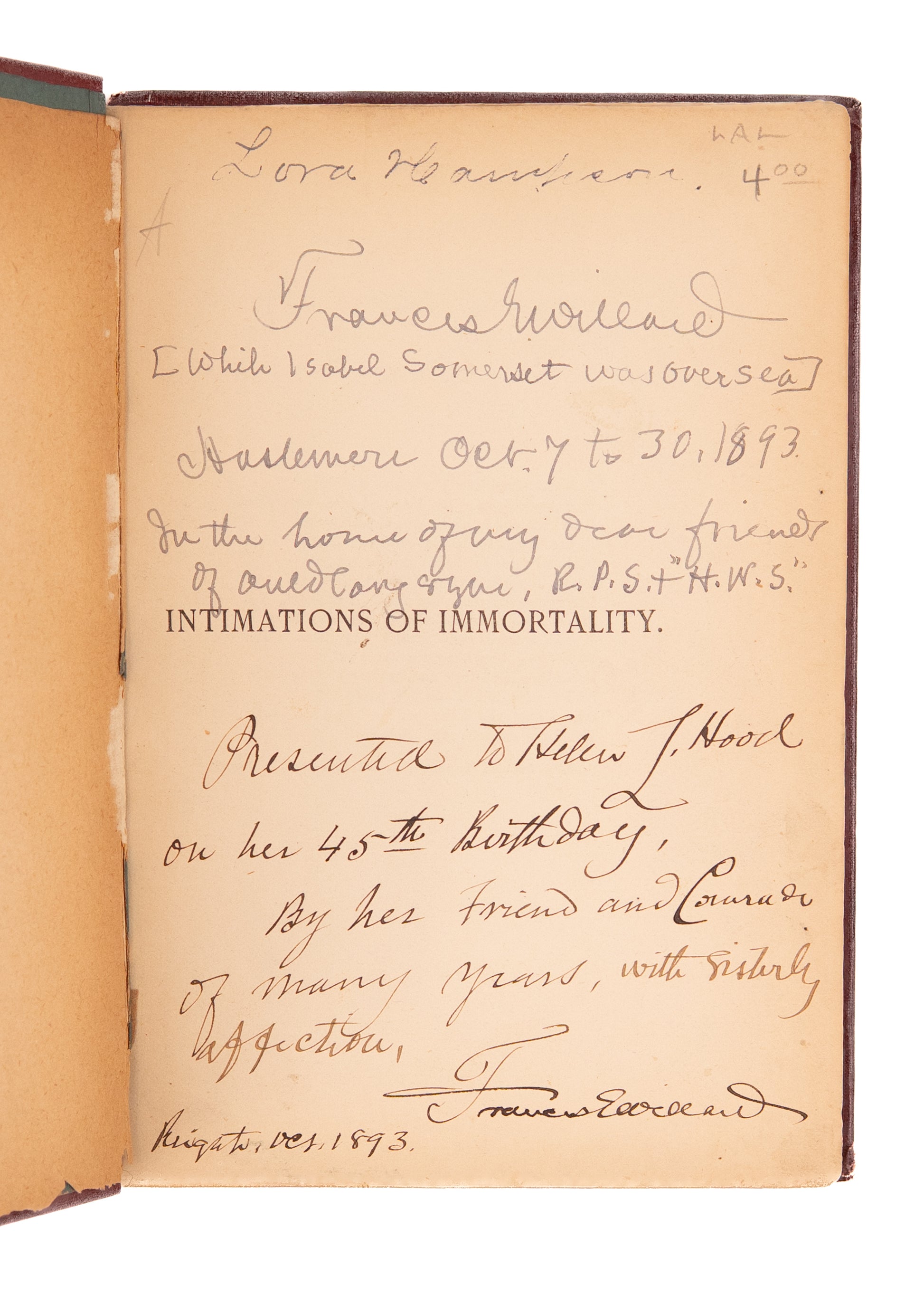 A really nicely provenanced item, apparently presented in the home of Hannah Whitall and Robert Pearsall Smith by Frances E. Willard, to fellow Women's Temperance campaigner, Helen L. Hood, head of the W.C.T.U. for the State of Illinois.