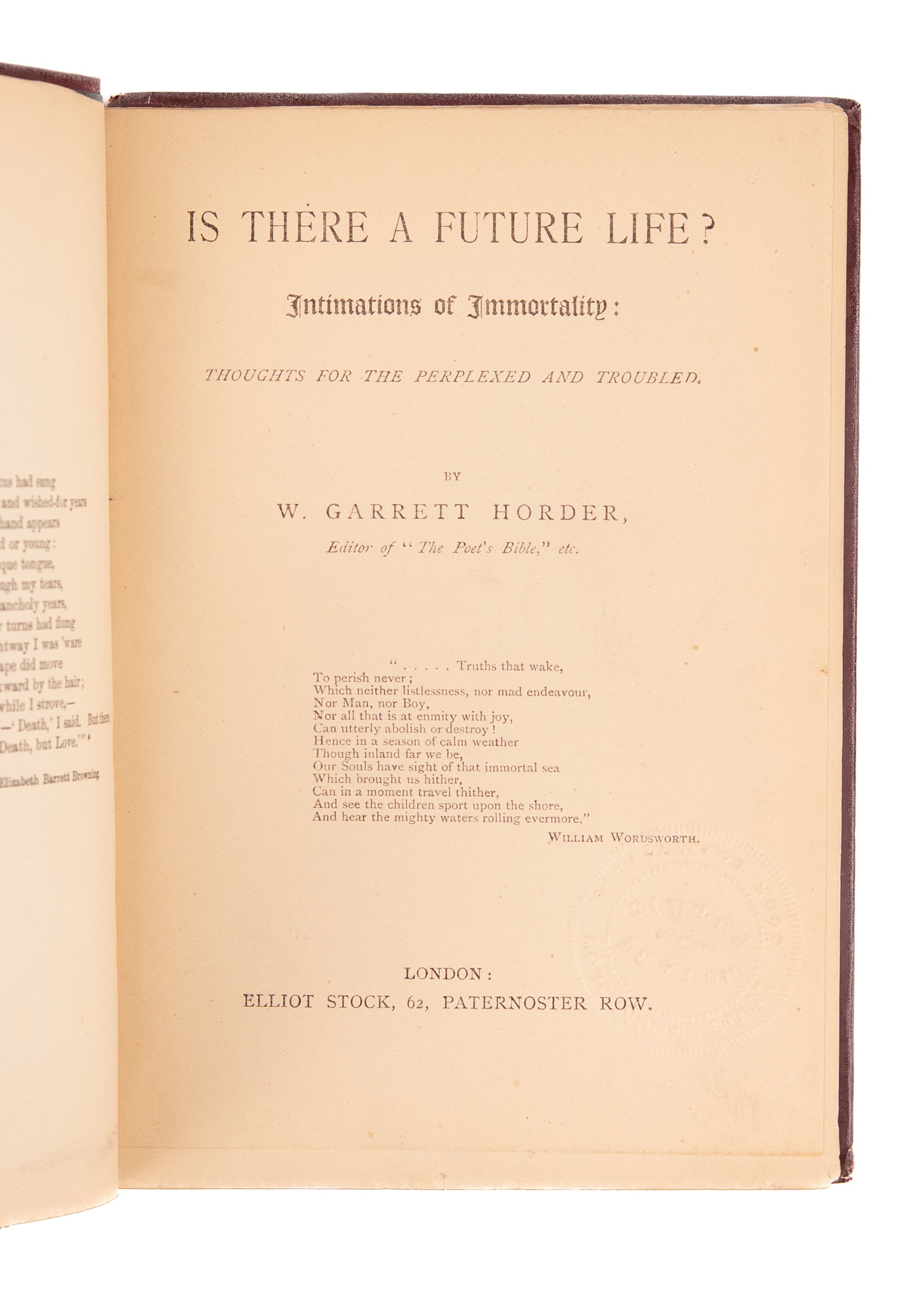[Frances Willard, Hannah Whitall Smith, Temperance, Afterlife]. Horder, W. Garrett. Is There a Future Life? Intimations of Immortality: Thoughts for the Perplexed and Troubled. London. Elliot Stock. Nd. c.1893. 184pp.