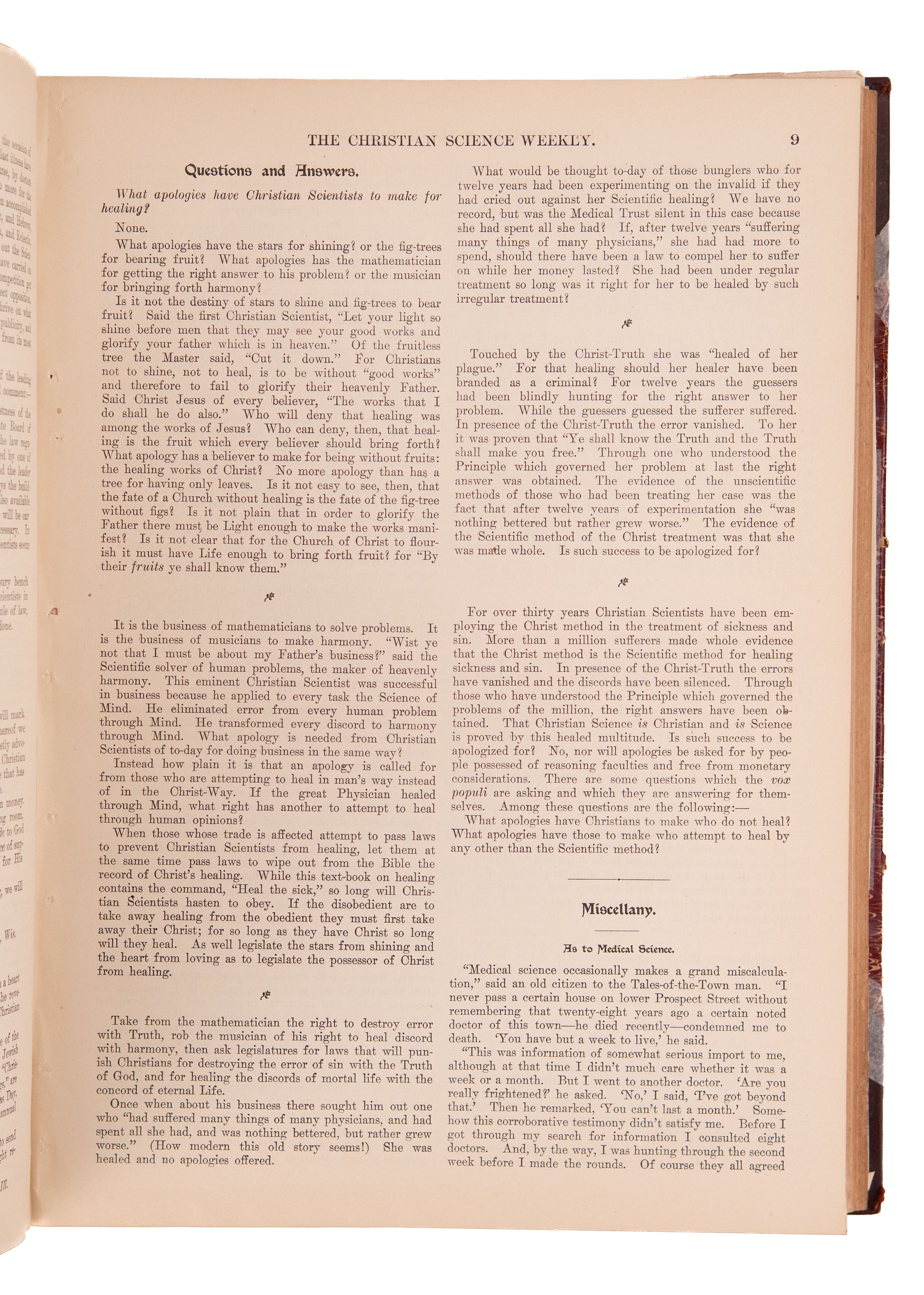 Contents include: Prospectus for the Christian Science Sentinel; Testimonies; Christian Science in Dentistry; From Cumberland Presbyterianism to Christian Science; From Judaism to Christian Science; If They Drink anything Deadly it Shall Not Harm Them; Blindness Pronounced Incurable, Cured; Victory over the Last Enemy; Indians at the Omaha Exposition; Our Duty to Nationalize; President McKinley at the Omaha Exposition; Three Cases of Healing by William J. Klipp; Mental Surgery; Against Imperialism; Malignant Cancer Cured; Anti-Toxine a Humbug; Mr. Kimball at Salt Lake City; Sayings of D. L. Moody; Malicious Falsehoods; Christian Scientists and the Practice of Medicine; A Narrative by Mary Baker Eddy; Self is Our Goliath; Christian Science Helpful in Music; A Case of Bone Healing; A Thirty Years' Search Rewarded by John T. Dee; Is Smallpox from God?; The Massachusetts Metaphysical College; Disease Caused by Sin; To the Christian World by Mary Baker Eddy; Petty Persecution; Is Heaven a Condition; Letters to Mrs Eddy; Appetite for Strong Drink Destroyed; Hypnotism - That Way Madness Lies; Supreme Power of Mind Rules; Dosed to Death - A Physician's Testimony; What Fears of Human Mind have to do with Contagion; Lack of Faith Overcome; Businessmen Healed; A Baptist Pastor Healed; Unaffected by Heat and Cold; Proposed Prohibitory Legislation in Rhode Island; Vaccination Proves Fatal; Remarkable Cure of Mental Dentistry; Enslaved by Drugs; All Churches should Heal; Healed of Appendicitis; etc. etc.