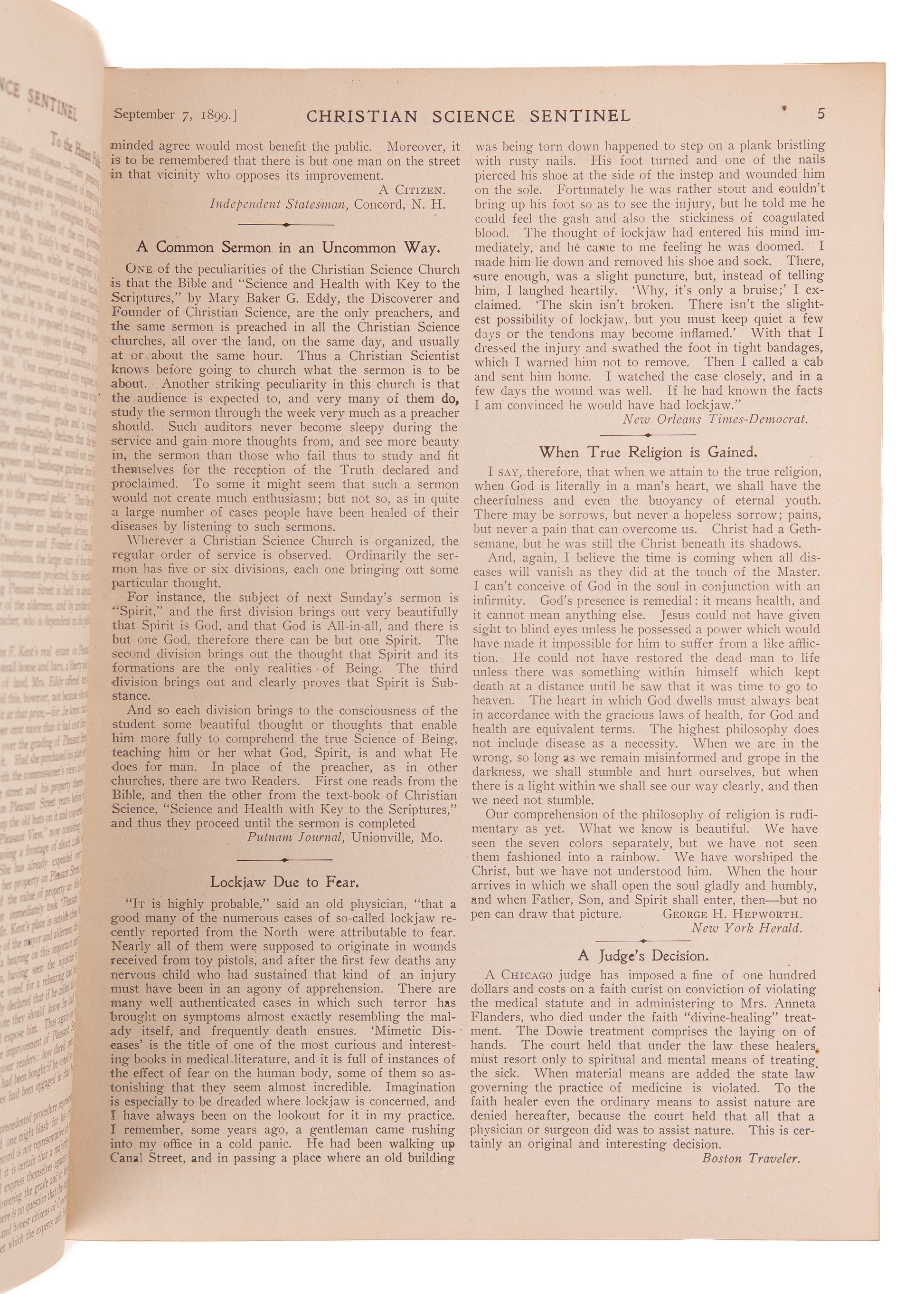 Contents include: Lockjaw Due to Fear; On the Medical Treatment of Children; Is the Practice of Medicine a Science?; New Theory of Sickness; Has a Man a Right to Die?; God not the Author of Sickness; Have Doctors a Right to Kill - Assisted Suicide; Marriages at Sea Illegal; Diptheria Healed; The First American Printing Press; Food Fear; Young Medicos Caught Out [on the fraud of so-called medical "science"]; Euthanasia; Playing Doctor; Brigham Young's Old Employer; The X-Ray a False Witness; Wine as a Medicine; Marconi's Great Invention; Typhoid Fever; How a Baby was Healed; The Eternal Womanly; The Inerrable Word of God; Total Blindness Healed; Archaeology Upsets Higher Criticism; A Woman among Women; Legality of Christian Science; The Applicaton of Christian Science to Dentistry; Clara Barton on Woman's Suffrage; The Gentleness of Jesus; Noted Oculist Failed; Vivesection Rejected; Have Miracles Ceased?; Tobacco and Liquor Habits Destroyed; Fractured Limbs Healed; Fear of Insanity Destroyed; Vaccination [anti-vax; evils of vaccination]; Wireless Telegraphy; Is Sickness Real?; Broken Arm Healed by Christian Science; From Judaism to Christian Science [Henriette Kahn]; Deafness Healed; Appendicitis Healed; Cripple No Longer; The Real and the Unreal; Jewish Rabbi becomes a Christian Scientist; Insanity Healed; The Pan-Helio-Motor - Concentration of Heat Effected by Means of Mirrors; Testimony of a Dentist; Catarrh and Neuralgia Healed Astigmatism Healed; The Massachusetts Metaphysical College; A Minister's View of Faith Healing; Twenty Blind Girls See; Natives of Alaska - Distinct Race with no American Indian Blood; No Sanitarium Wanted; Organic and Hereditary Troubles Healed; etc. etc.