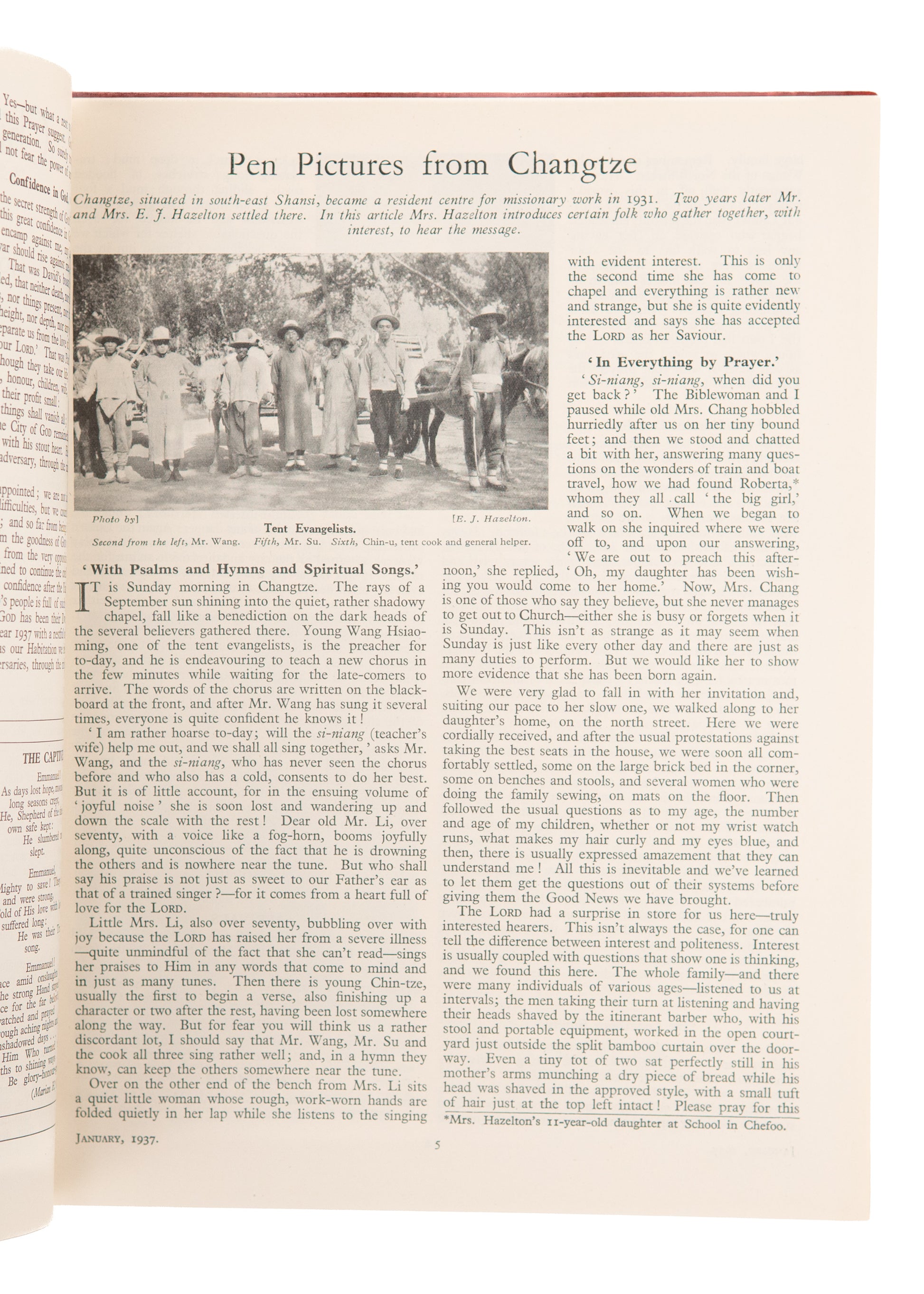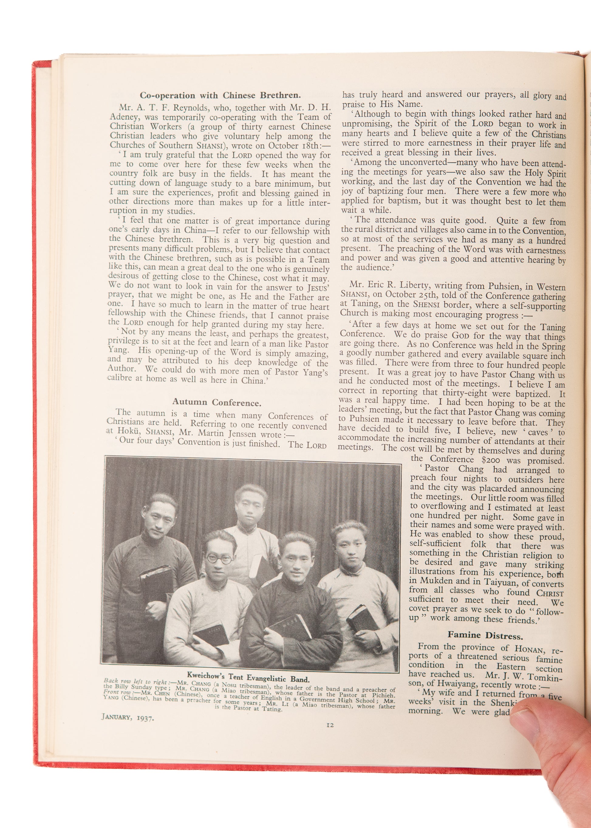 Superb content, including: In Every Generation. Meditations for the New Year by Marshall Broomhall; Pen Pictures from Changtze [Tent Evangelism, Photographs of Locals]; Extension in Eastern Yunnan; Our Shanghai Letter from Rev. H. M. Griffin [Moslems in Shansi; Deliverance from the Reds, Chian Kai-shek]; Letters from David H. Adeney of the Inter-Varsity Fellowship in China; Hudson Taylor's Birthplace; A Building of God by Marshall Broomhall; Mowkung Revisited; The Flourishing Church in Kinhwa; The Experiences of Mrs. Li of Yungsin; In the Kachin Country by Mrs. A. B. Cooke; Putting off the Works of Darkness - Turning from Idolatry in Chekiang; A Mountain Top - Mrs. A. K. Heath on the Pilgrimage to Taishan; The Crisis in China; The Darwesh Sects of North-West China by F. W. Martin Taylor; Medical Work among the Moslems of China by D. V. Rees; Moslem Schoolboys by W. A. Saunders; Islam in South-East Shansi by G K. Harris; The True Meaning of Life by Sister Eva [Review]; Prayer by O. Hallesby [Review]; Fuel for Intercessors; The Consecration of Bishop Houghton by Gordon H. Aldis; The Church at Tachu, Szechwan [Revival]; The Hapless Young Wife of Changtze, Shansi; Today's Opportunity in Nanchang by Arthur Taylor; An Island Church at Mowping; Redeeming the Time; The Advance of the Gospel in Yunnan by W. A. Allen; Betty Stam's Surrender [A then-recently discovered letter on her personal surrender to Christ, published shortly after her martyrdom]; Children's Work in China; Boys' Camps by Henry Guinness of Honan; The Witness of Children; The Jewel Merchant by Mildred Cable; Tribes in Kiangsi; The Evolution of the Church in Yungkang; My Experience Preaching over the Radio by Leland Wang; Steady Growth at Kweiting; The Discontinuance of Marshall Broomhall as editor due to "a rather severe case of insomnia;" The Pilgrims by J Russell Howden; Along the Burma Border by J. O. Fraser; Prayer Answered by F. J. Fitzwilliam; The Experiences of a Young Missionary by Phyllis Thompson; The Sian Coup [Extensive Review by Rowland Hogben]; Bearing the Cross - Persecution in Kiangsu; The Tibetan Border. An Appeal for Prayer by J. H. Jeffrey; Prayer by G. B. Mackenzie; Return to Kansu; Kingtehchen - Of Pottery Fame; Let Your Light so Shine by Miss Grace Taylor of Chekiang; Delivered from Demons; The Aboriginal Tribes of China by W. H. Warrn; Their Spiritual Need by F. Howard Taylor; Mass Movements among the Aboriginals by J. O. Fraser [specimens of tribal script, etc.]; Nosu Feudal Lords and Serfs by W. G. Windsor; Pioneering among the Min Chia; Fish Four - Among the Lisu; How the Message came to the Black Miao by M. H. Hutton; A Testimony by a Laka Woman in a Heathen Village; Peace not as the World Giveth by Arthur Moore; The Claims of the Rgyalrong of Eastern Tibet; In Memoriam. On the Passing of Marshall Broomhall by W. B. Sloan; A Breath of Revival; etc.