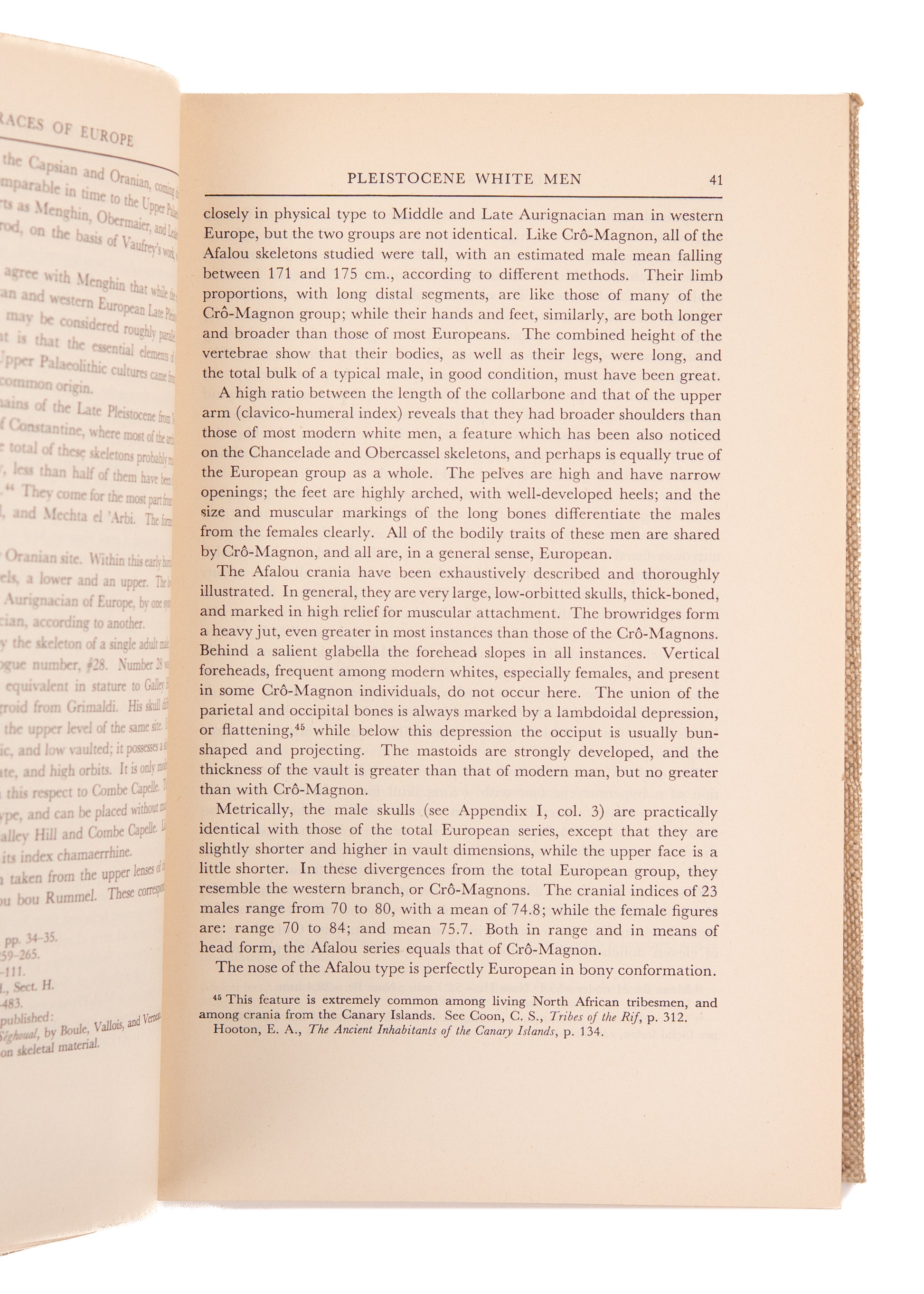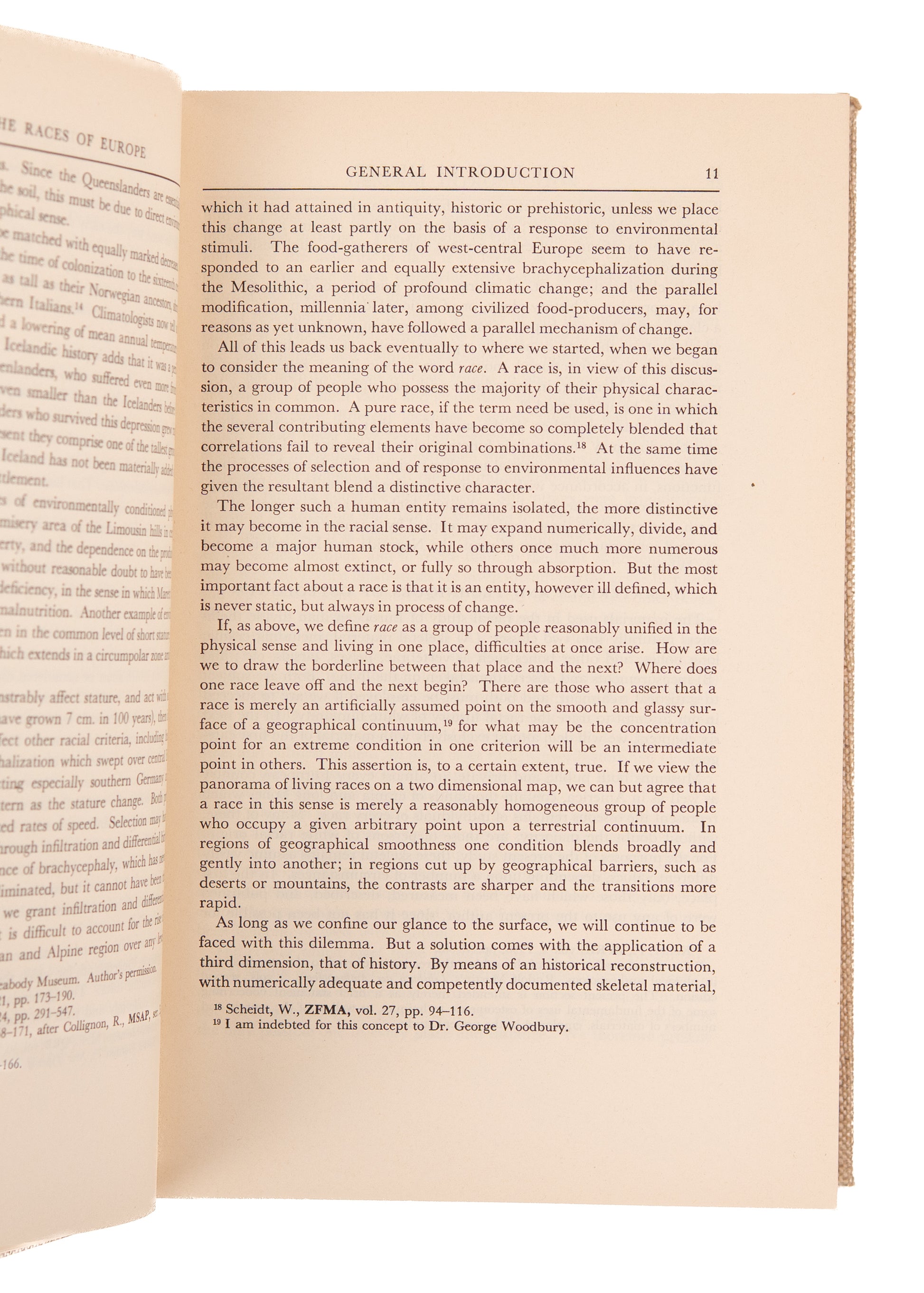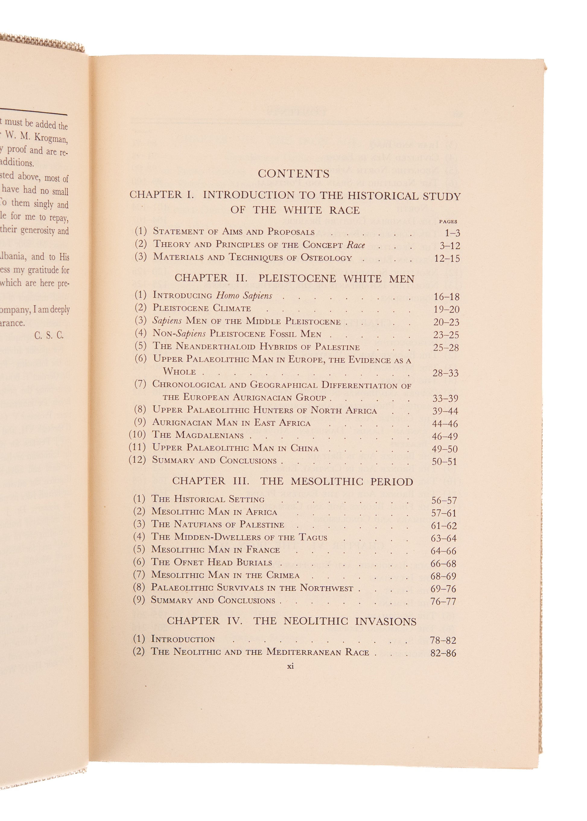 A very finely preserved first edition of Carleton Stevens Coon's seminal work categorizing the various ethnicities of the world according to their supposed evolutionary development by chronology Though the work is largely focused on European races, he makes it clear as he approaches Morocco, and the southern and eastern regions of Europe that the closer one gets to Africa, the more recent [and thus incomplete or underdeveloped] the evolutionary development and the further from being fully "homo sapiens."