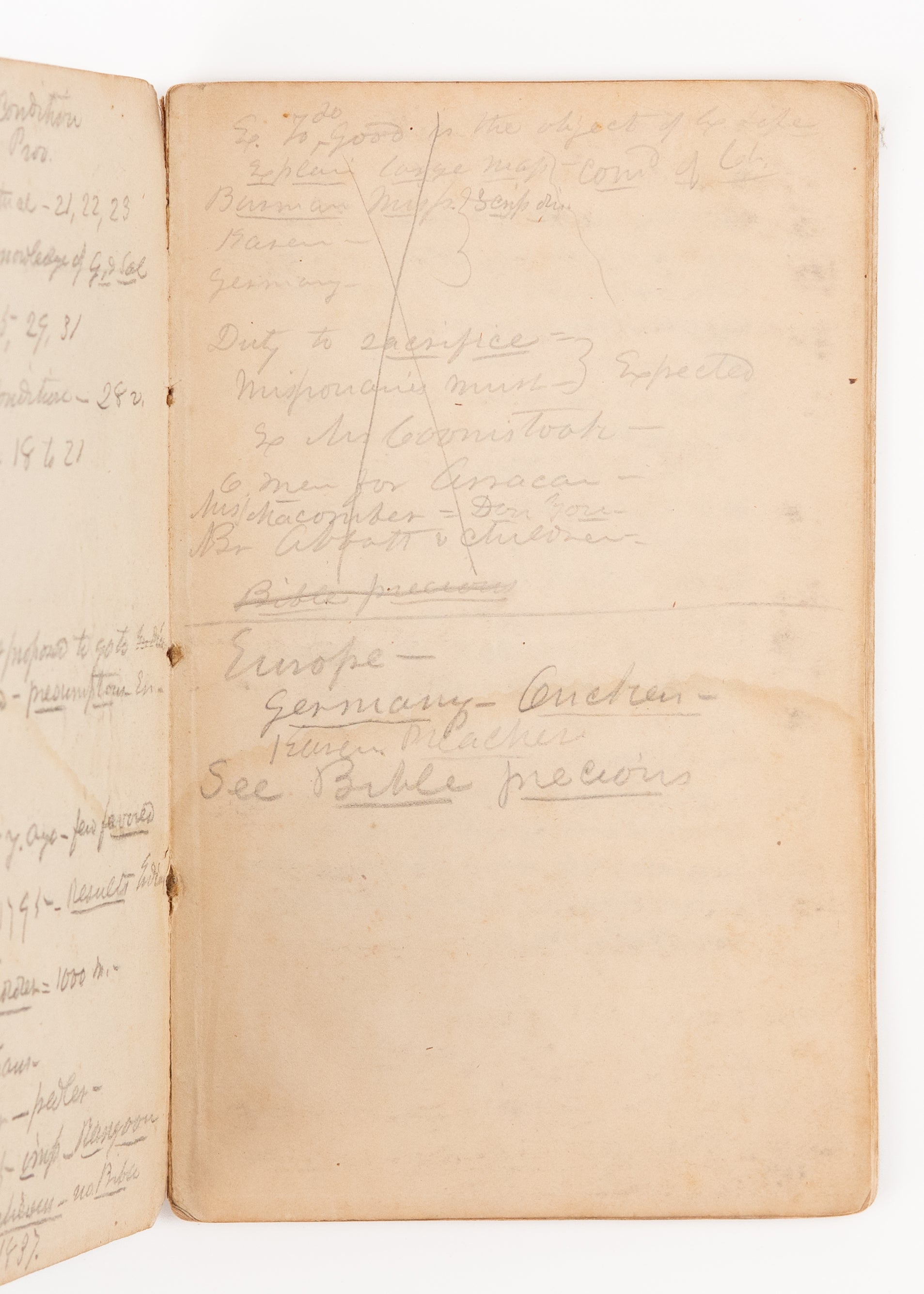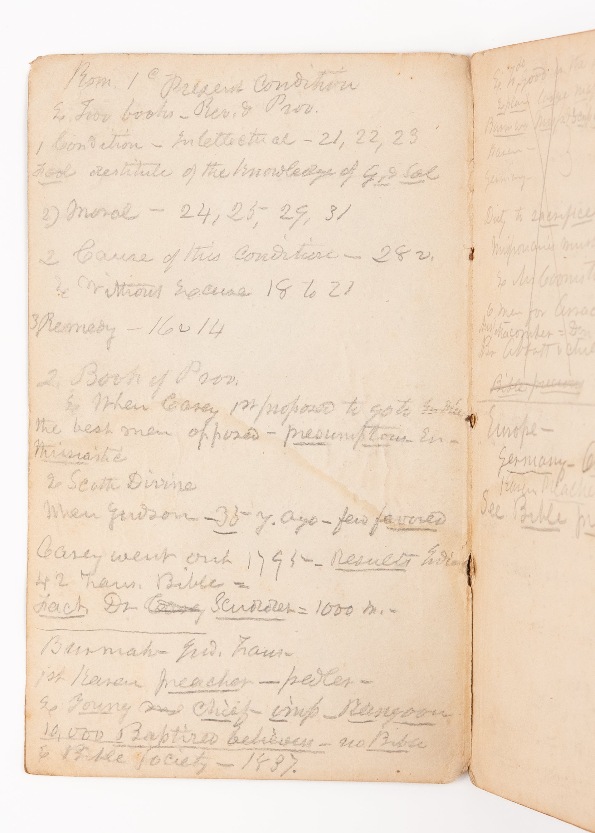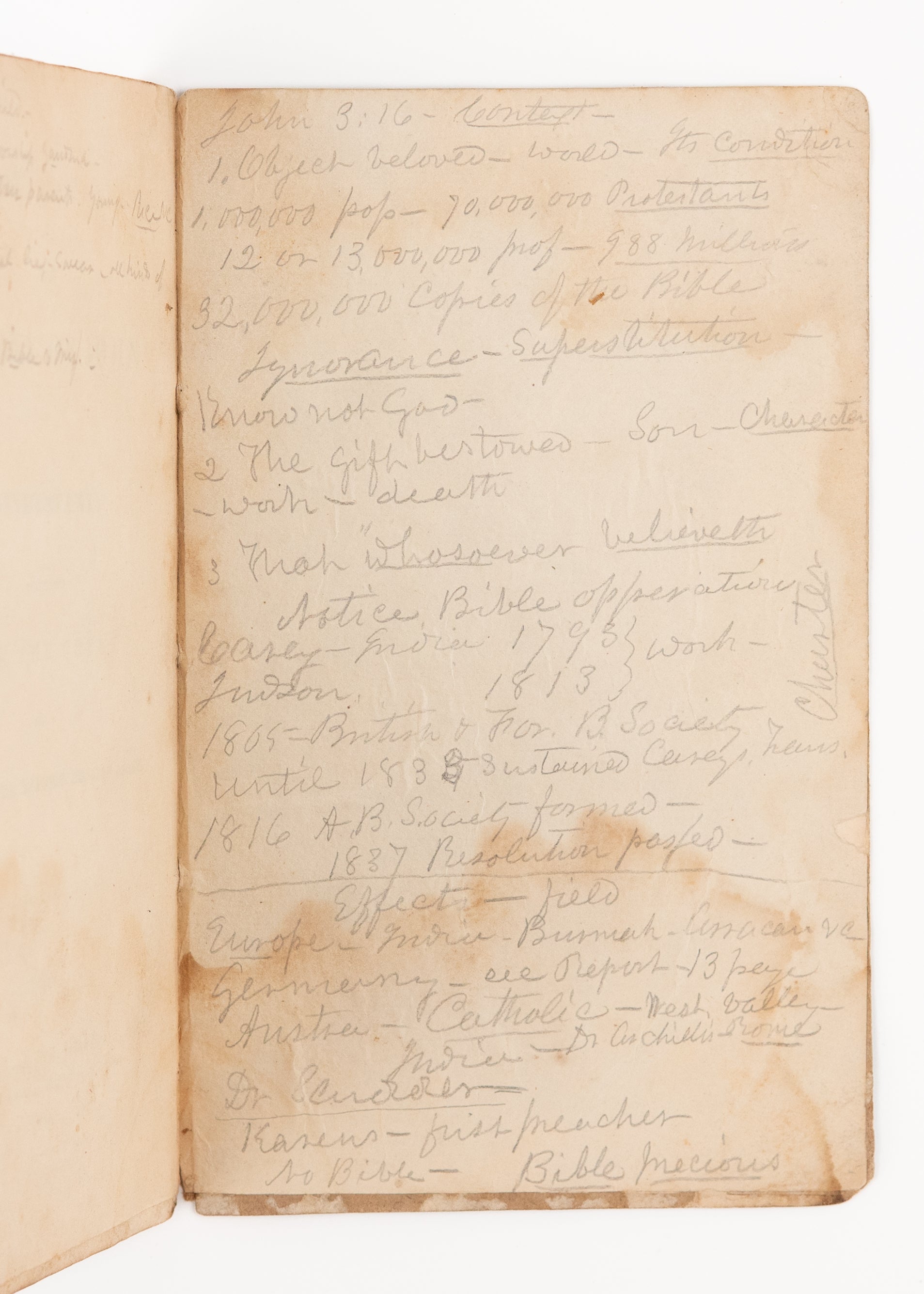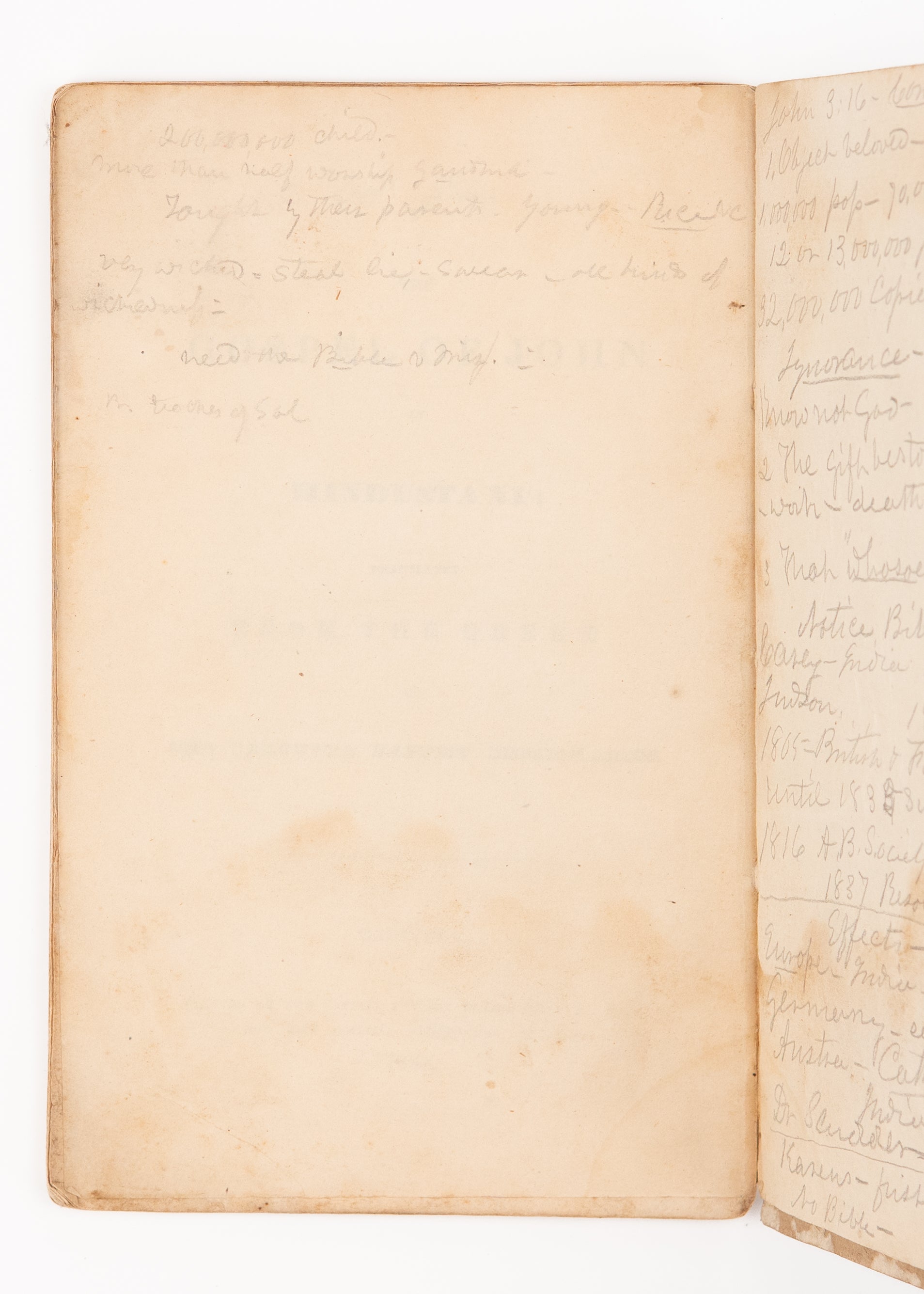 This particular copy, scarce in its own right, is of particular interest as it retains an original English missionary's sermon notes on John 3.16 in pencil on the preliminaries, both front and rear, making reference to William Carey, John Scudder, etc., John's Gospel was the usual evangelistic preaching Gospel used by the missionaries in village preaching, and this likely used very early in the field. Most dialects either had Matthew [for the Sermon on the Mount or out of simple Biblical order] or John selected as the first book to be translated.
