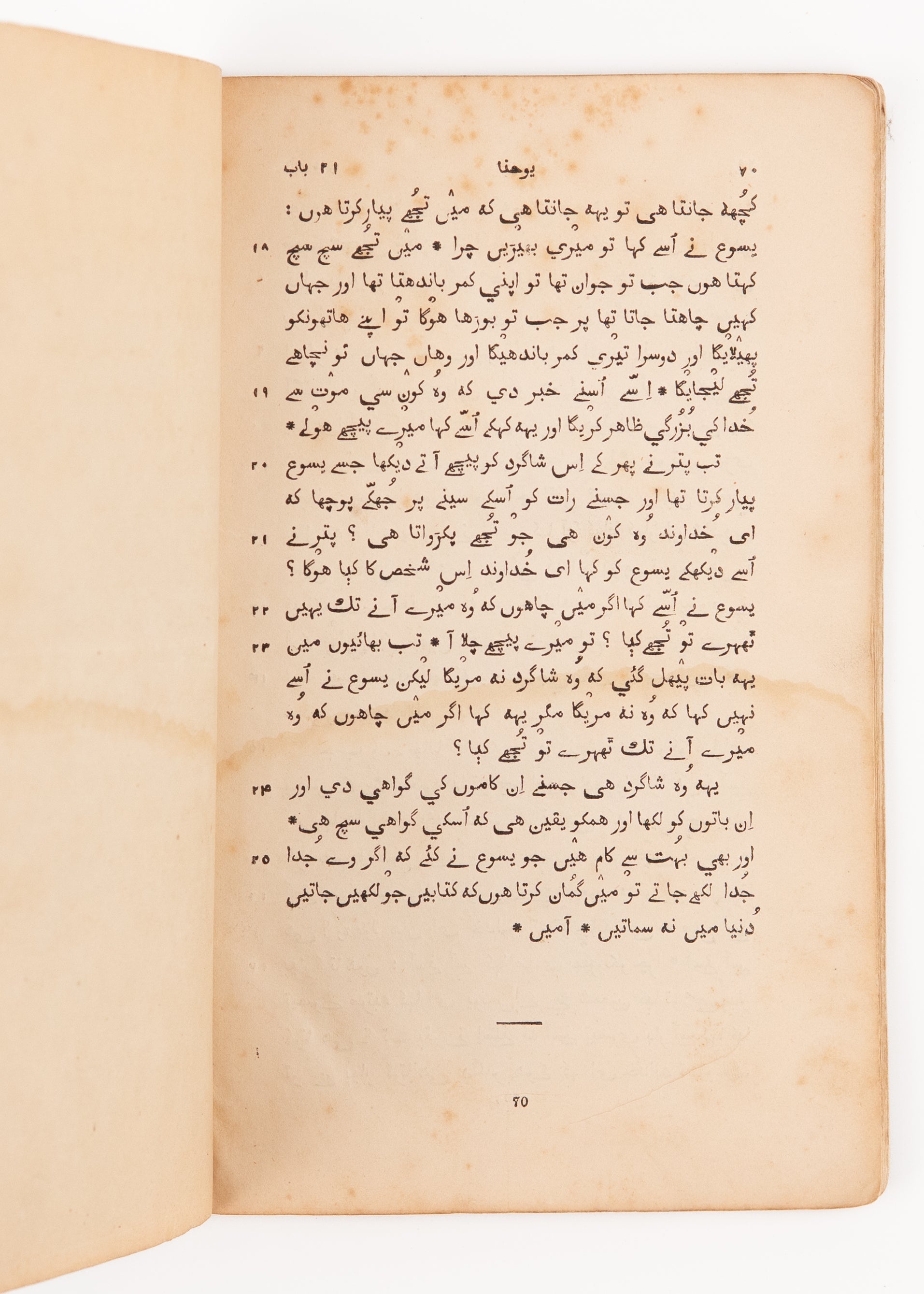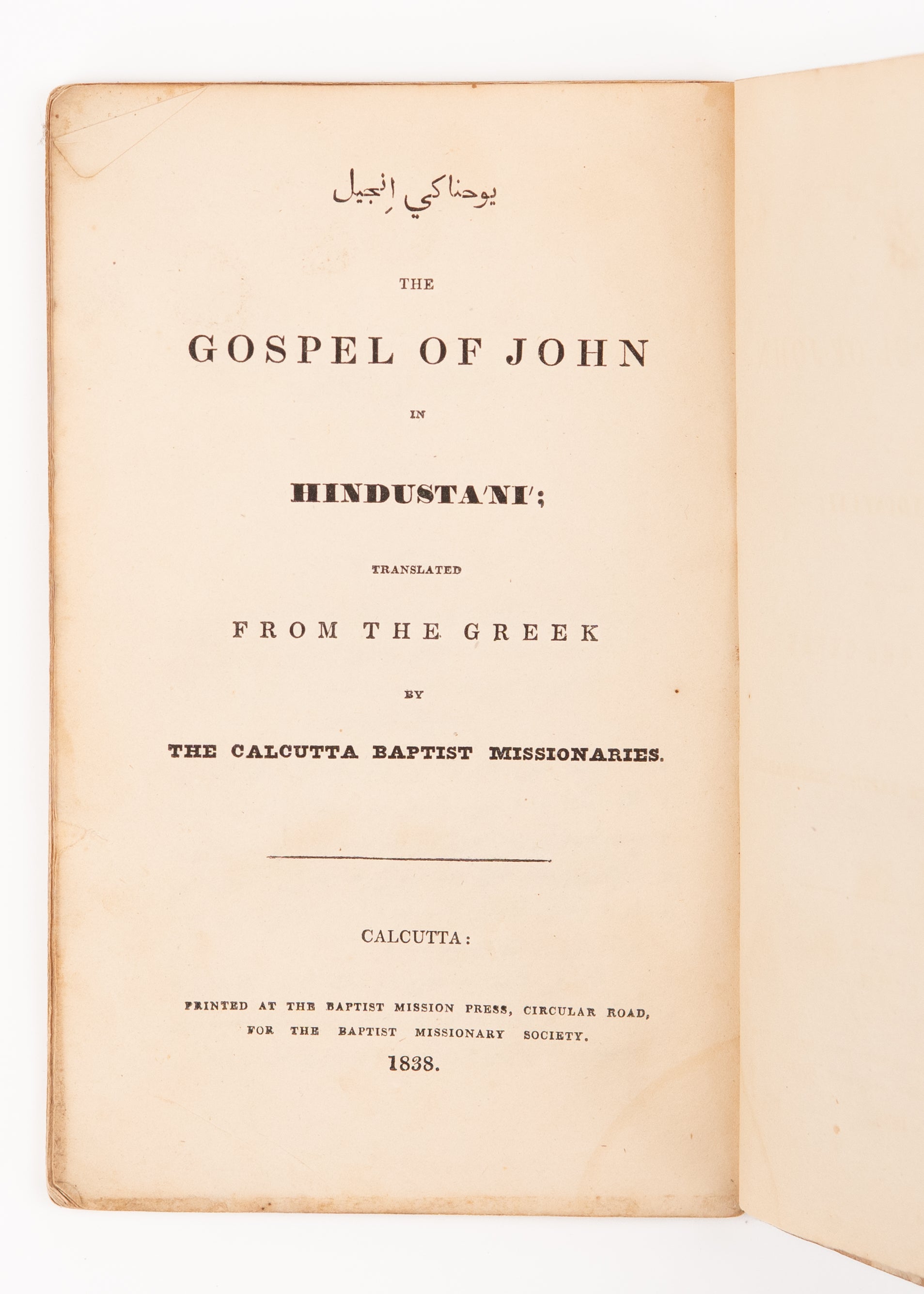 Rare first edition of the Gospel of John in Hindustani issued by the Baptist Missionaries at Calcutta [Serampore]. By scholarly consensus, seemingly based on the earlier work of Henry Martyn, and likely completed by William Yates, so-indicated in the later full New Testament and as he was author of important translation keys for the language.